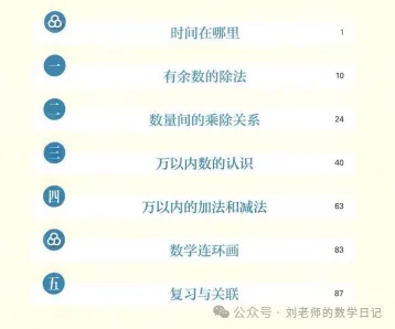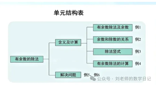 这是本单元的单元结构表,基本上和我们上一版的教材有余数的除法的结构是类似的,主要是包含有余数除法的含义以及如何进行计算。
