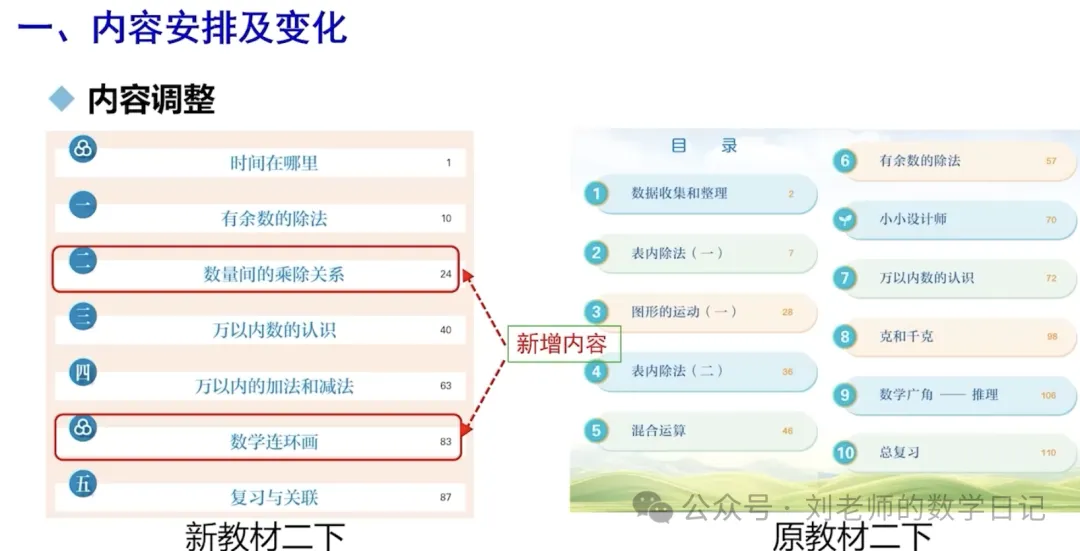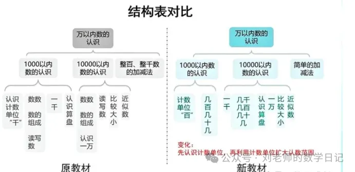 ★结构调整,单独编排新的计数单位(百、千、万)的认识,突出计数单位的核心作用;