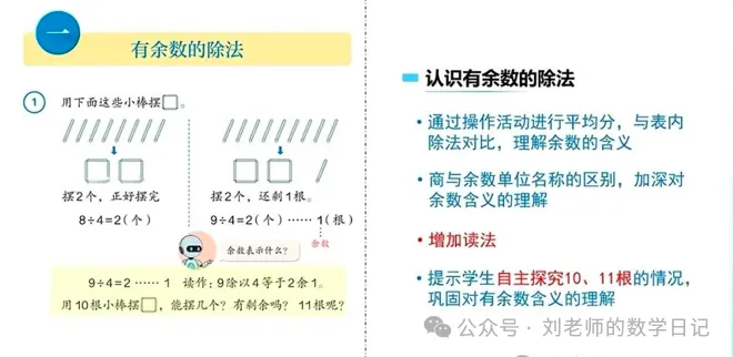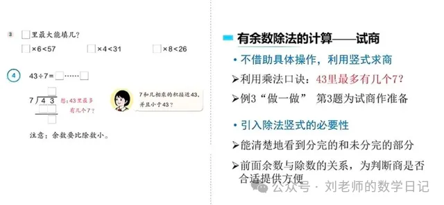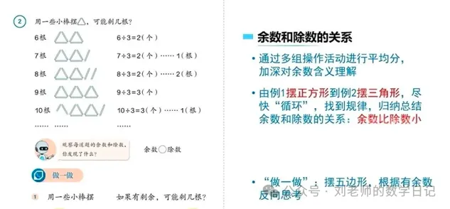 ★引入有余数除法时,增加多个被除数的对比,深化对余数含义的理解。