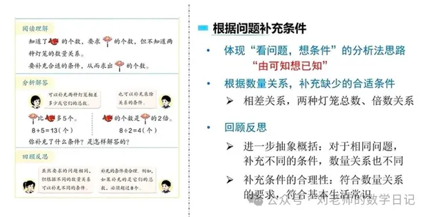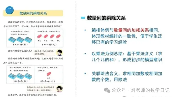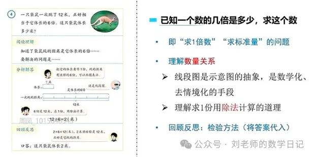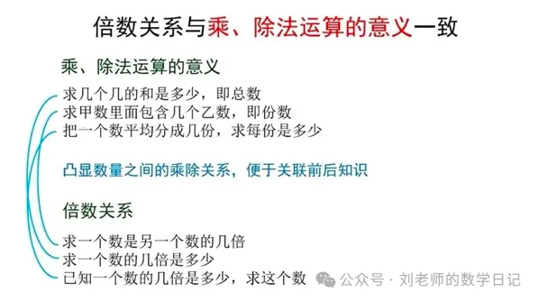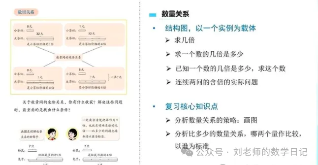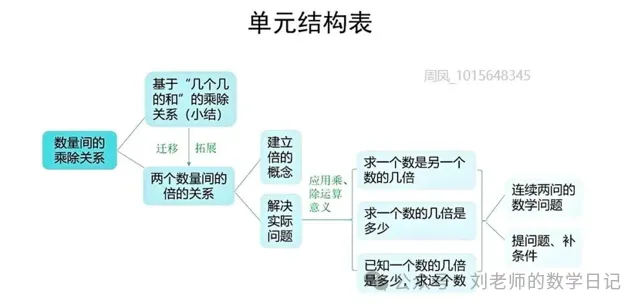 以上是本单元的单元结构表。"数量间的乘除关系",首先是要基于"几个几的和"的乘除关系做一个小结,其次引出"倍"这个概念——两个数量间的倍的关系这么一个概念,它其实是在“几个几的和”的基础上进行的一个迁移和拓展。在这个数量间的倍的关系有两个基本的内容:一个是倍的概念的建立,其次是与倍有关的实际问题的解决,需要运用的就是前面的小结中提到的乘除运算的意义。在此基础上解决连续两问的问题,以及提问题和补条件这两类问题。