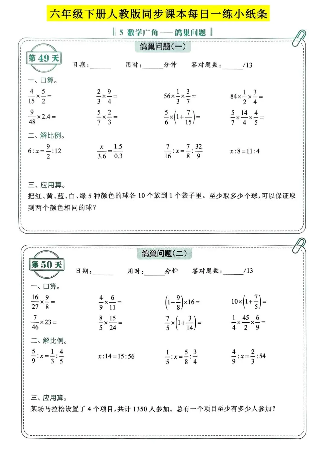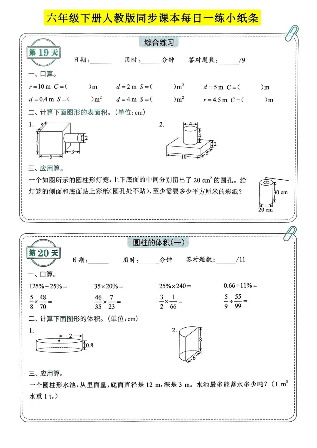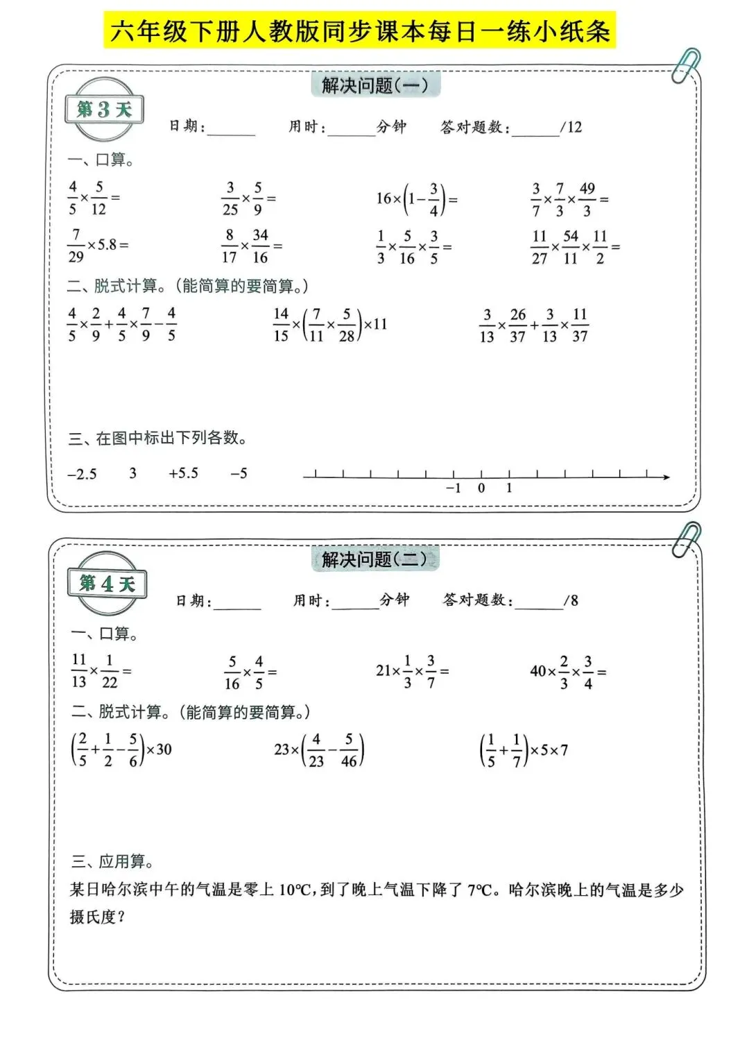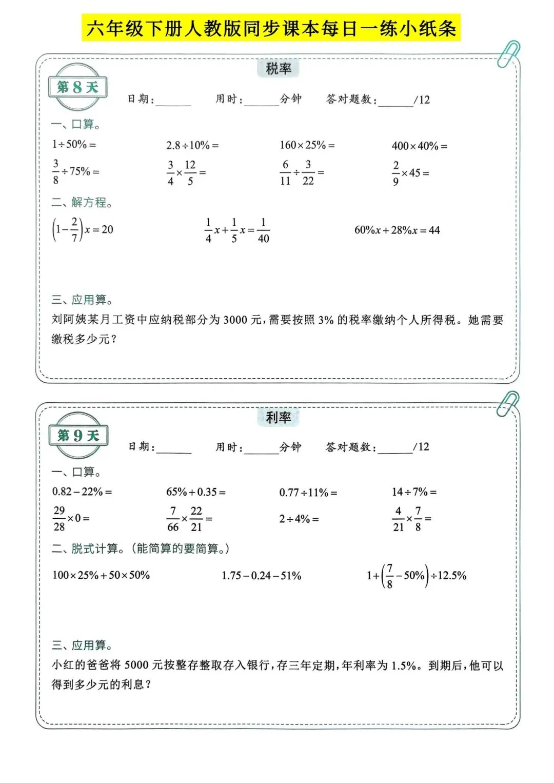 >人教版小学数学六年级下册同步课本每日一练小纸条