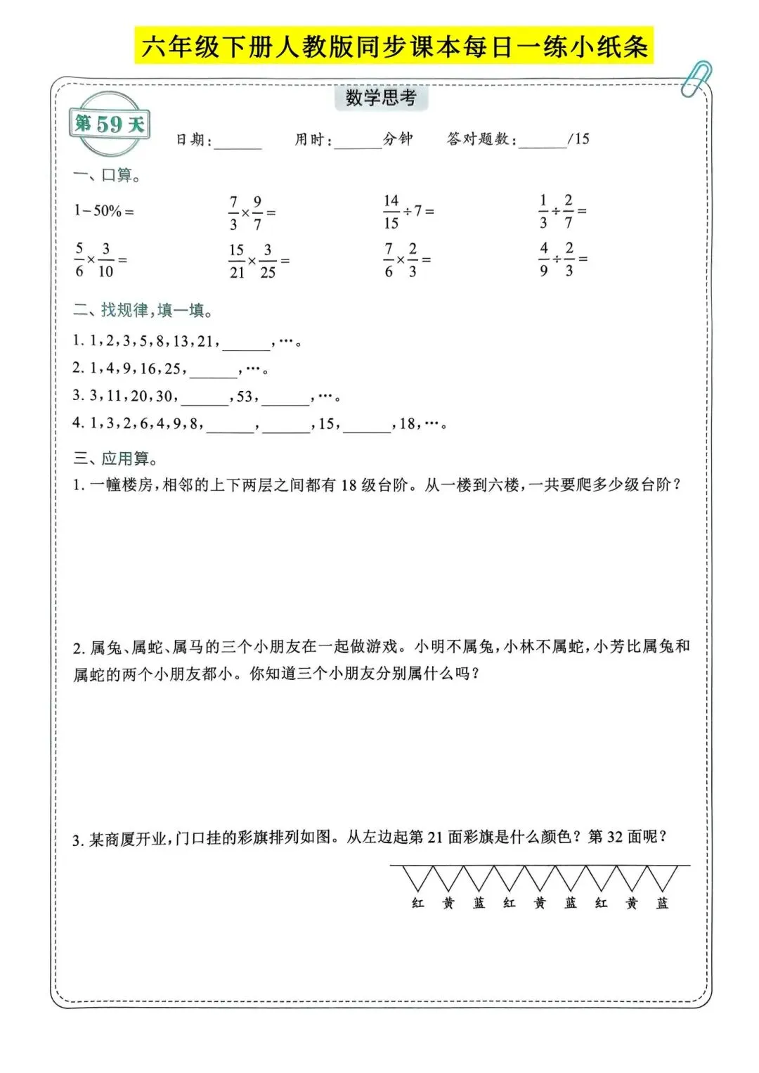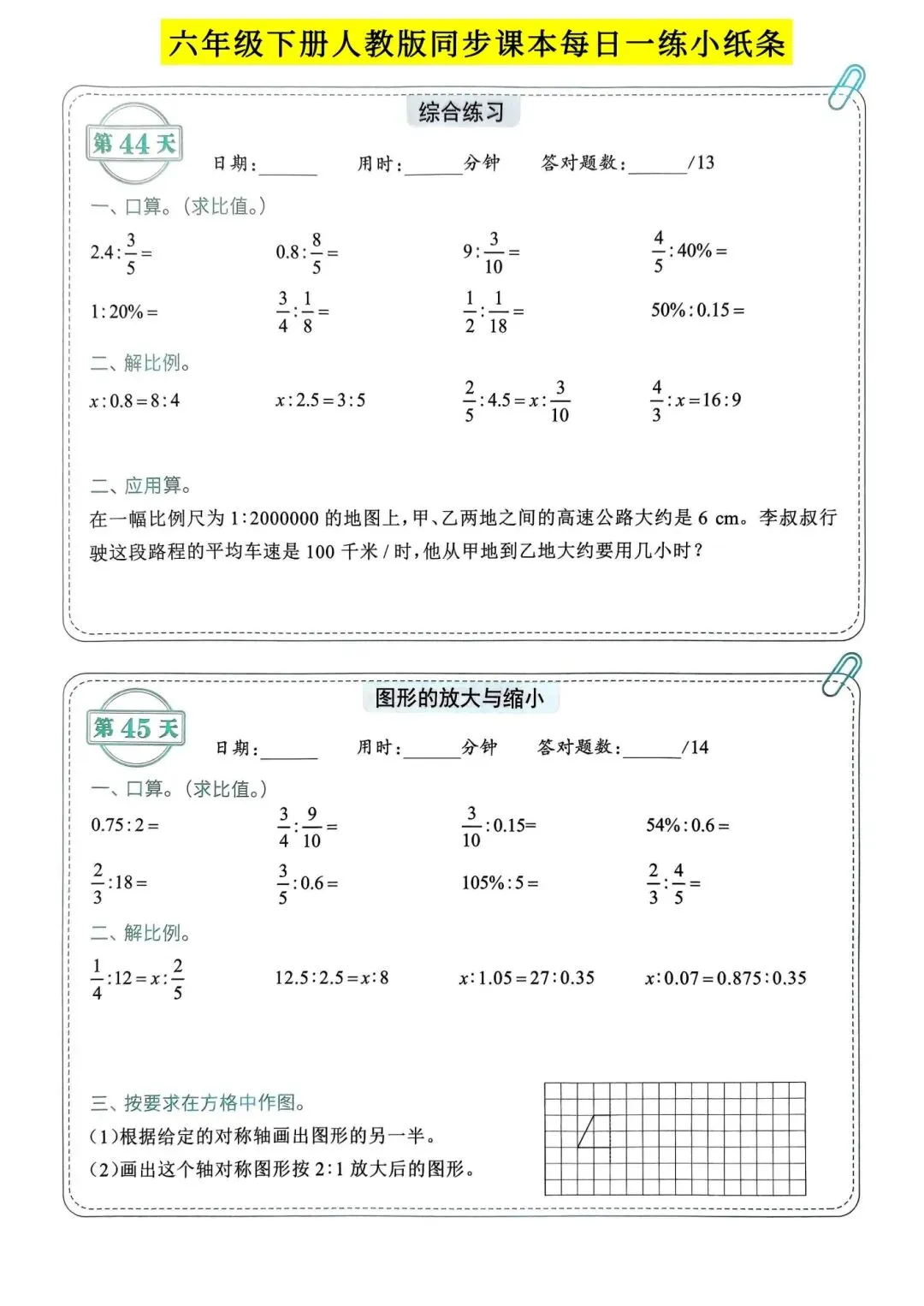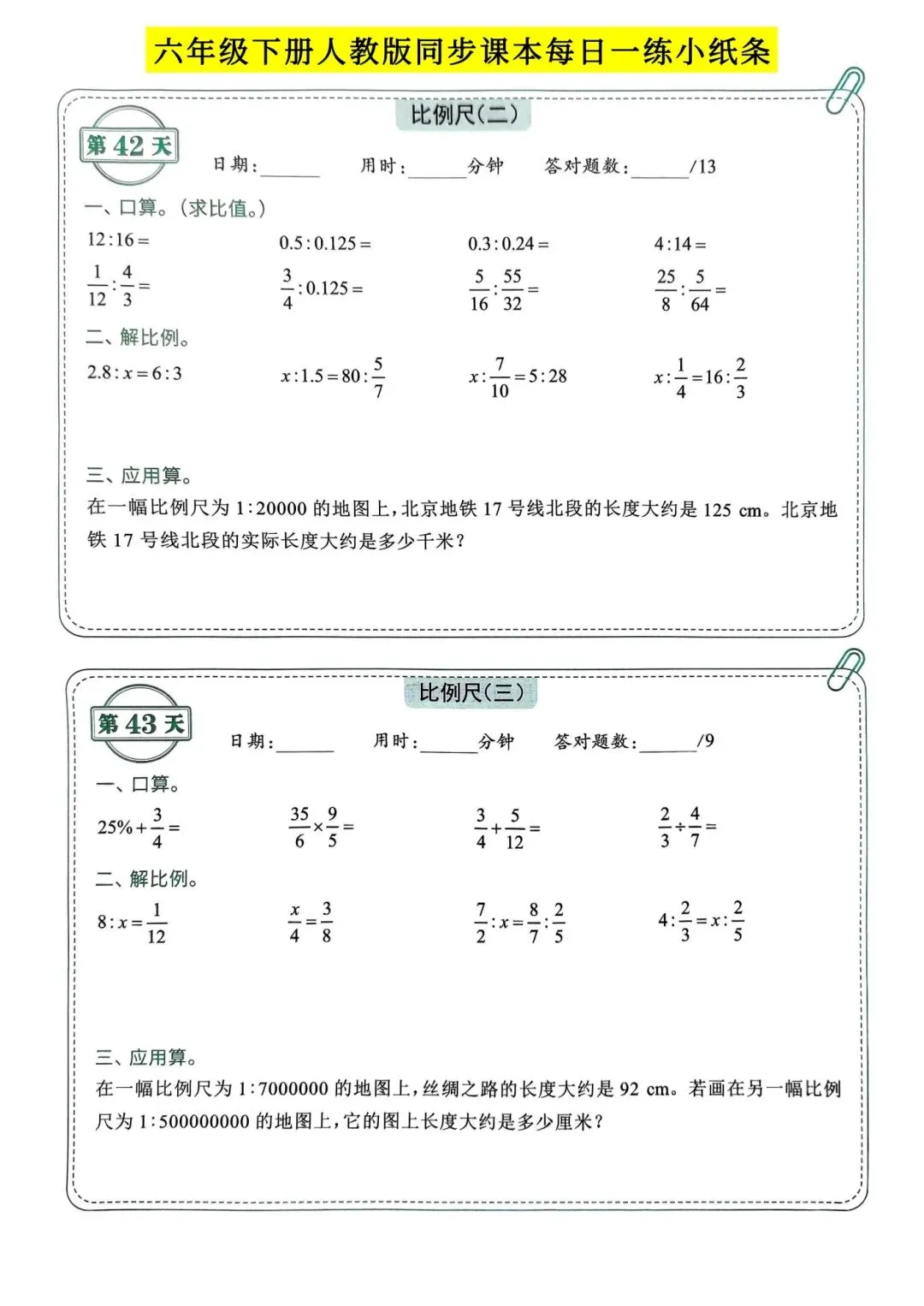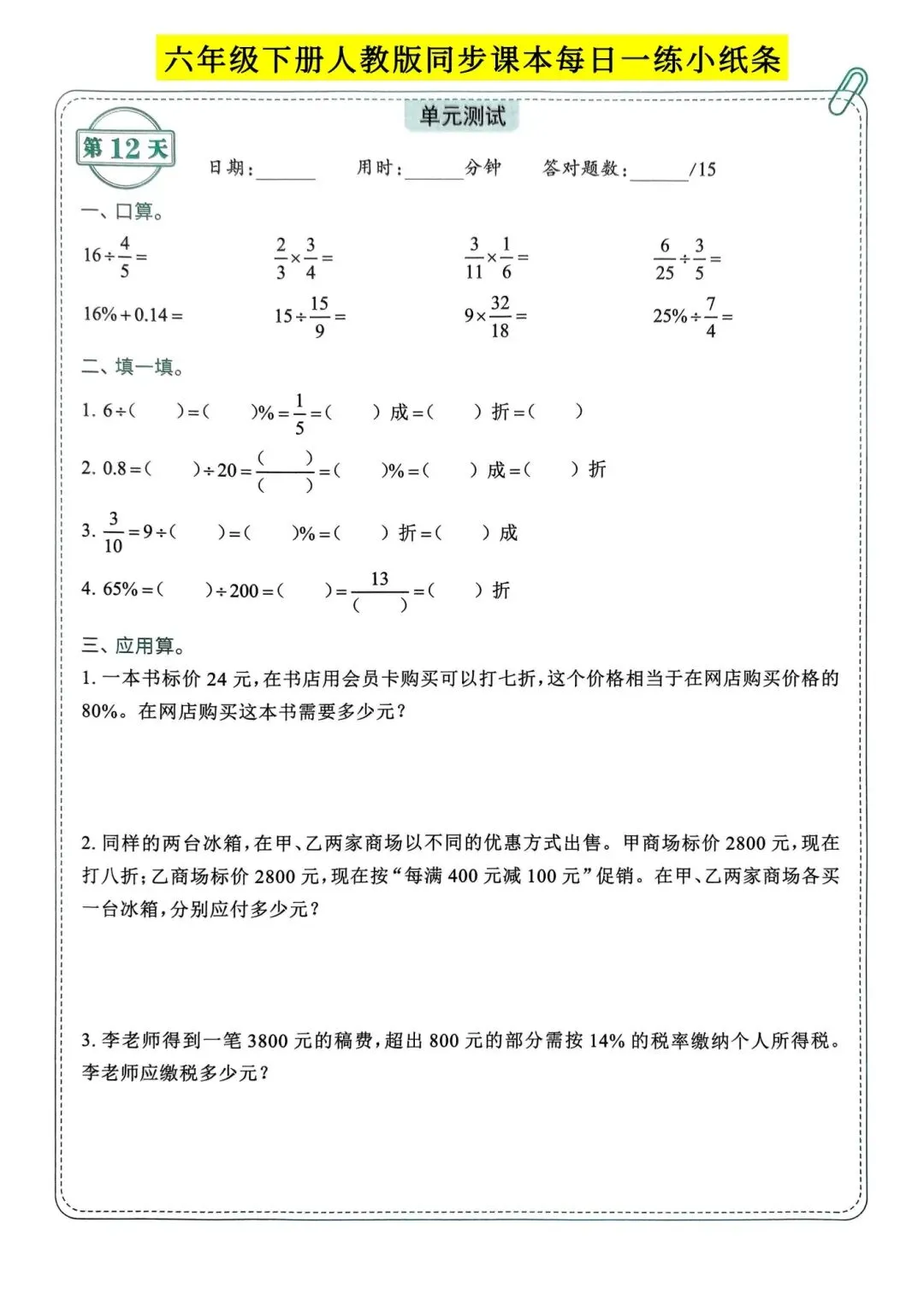 >人教版小学数学六年级下册同步课本每日一练小纸条