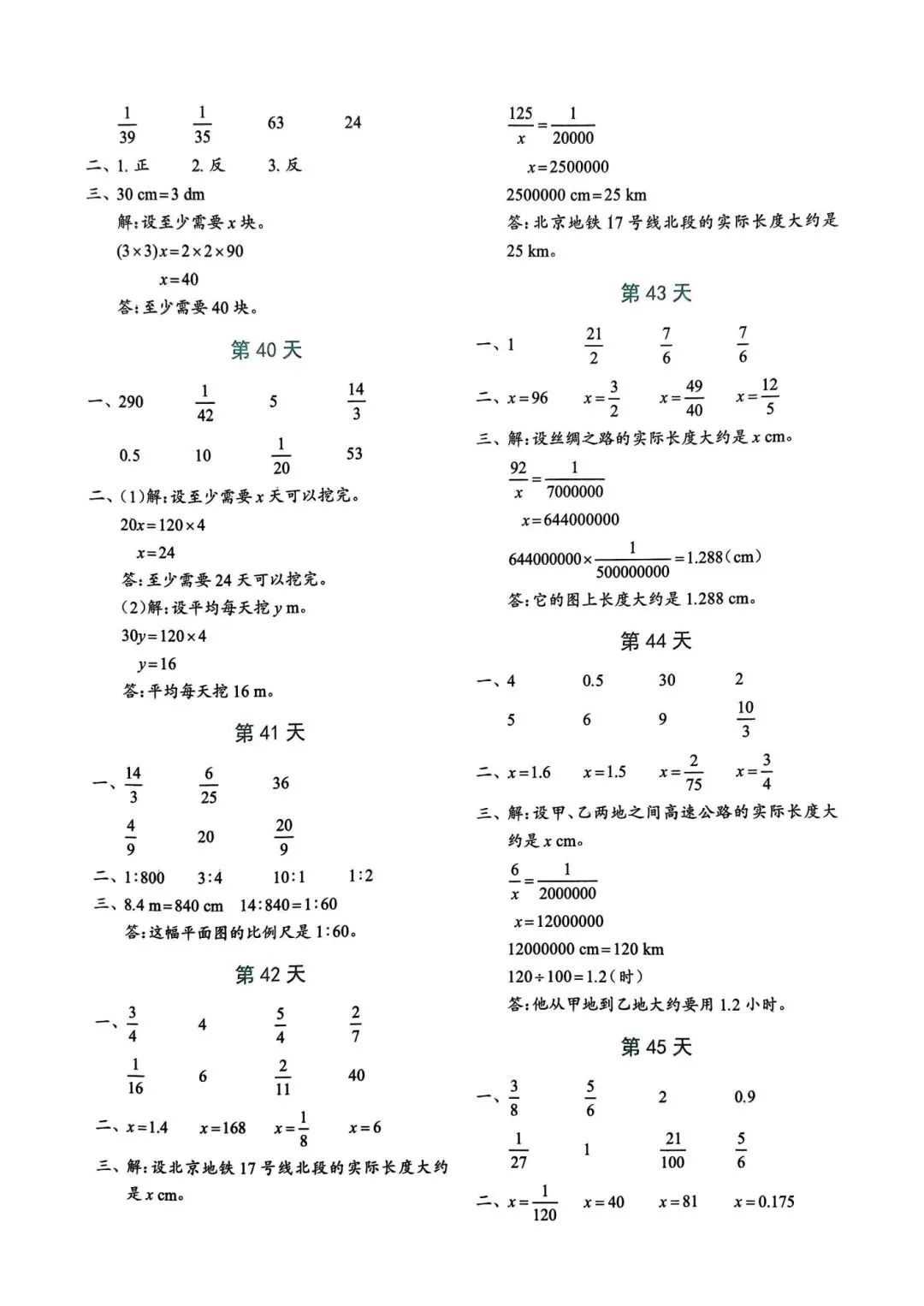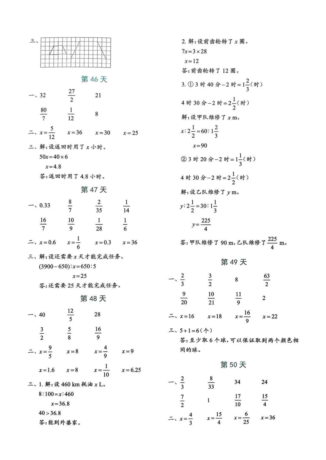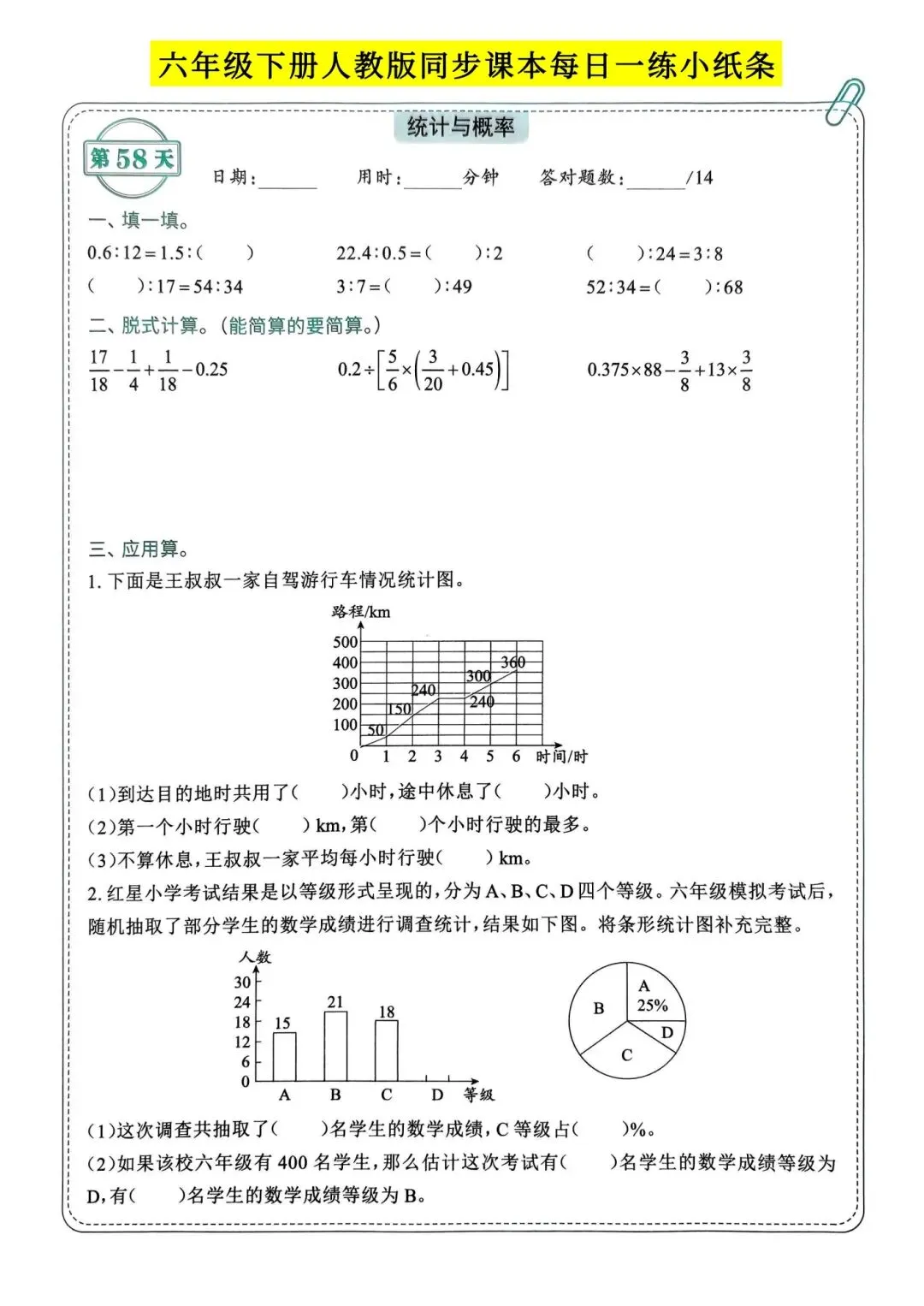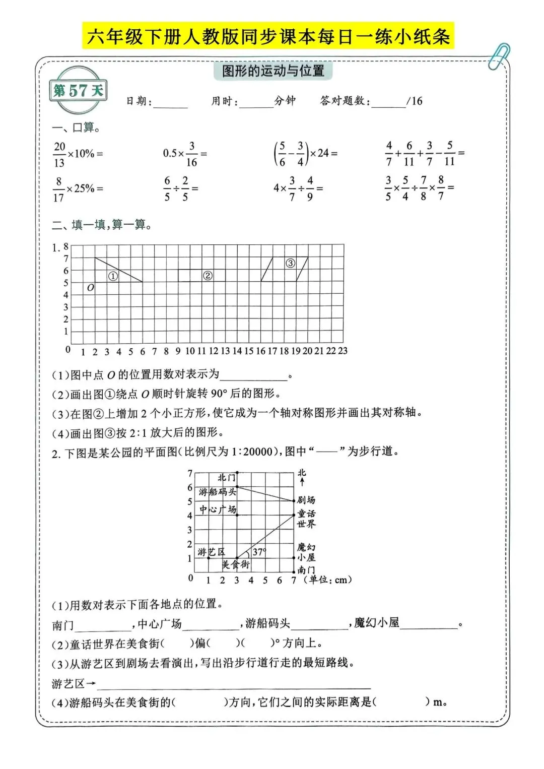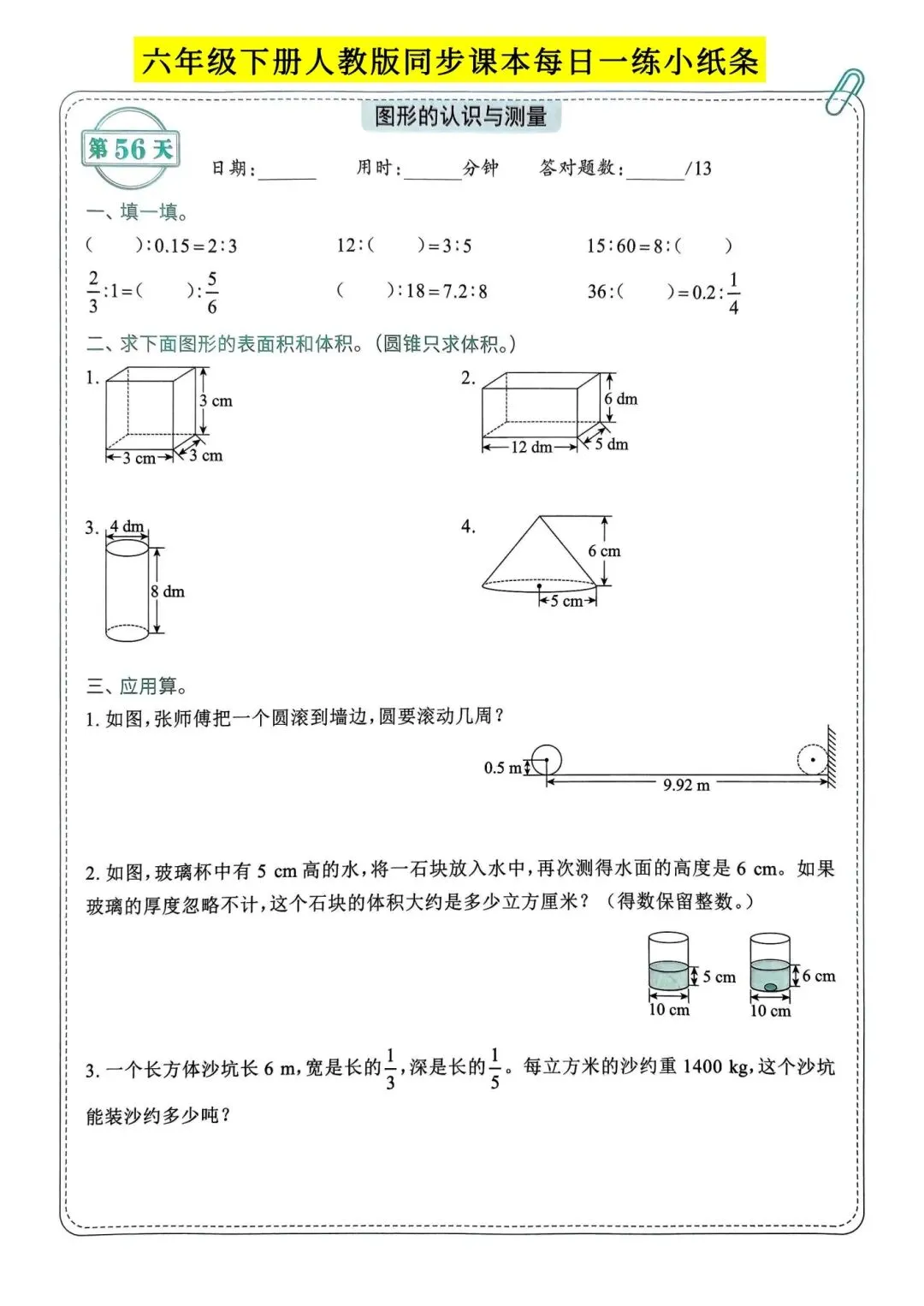 >人教版小学数学六年级下册同步课本每日一练小纸条