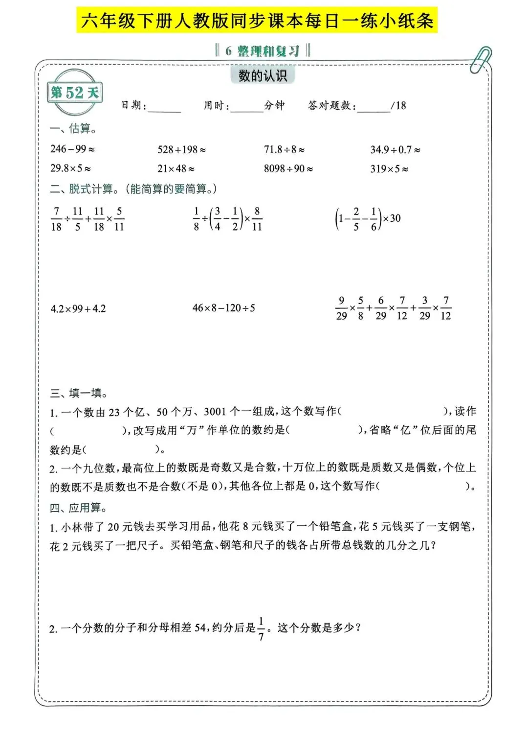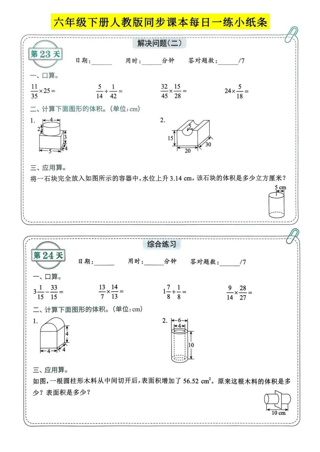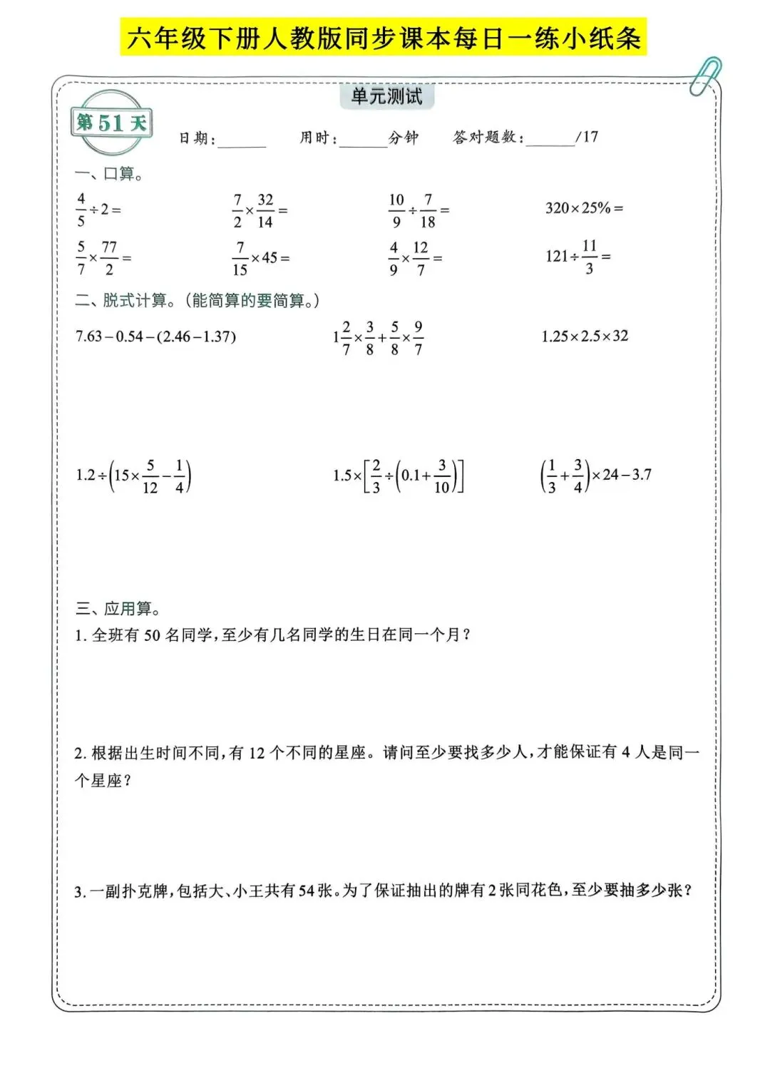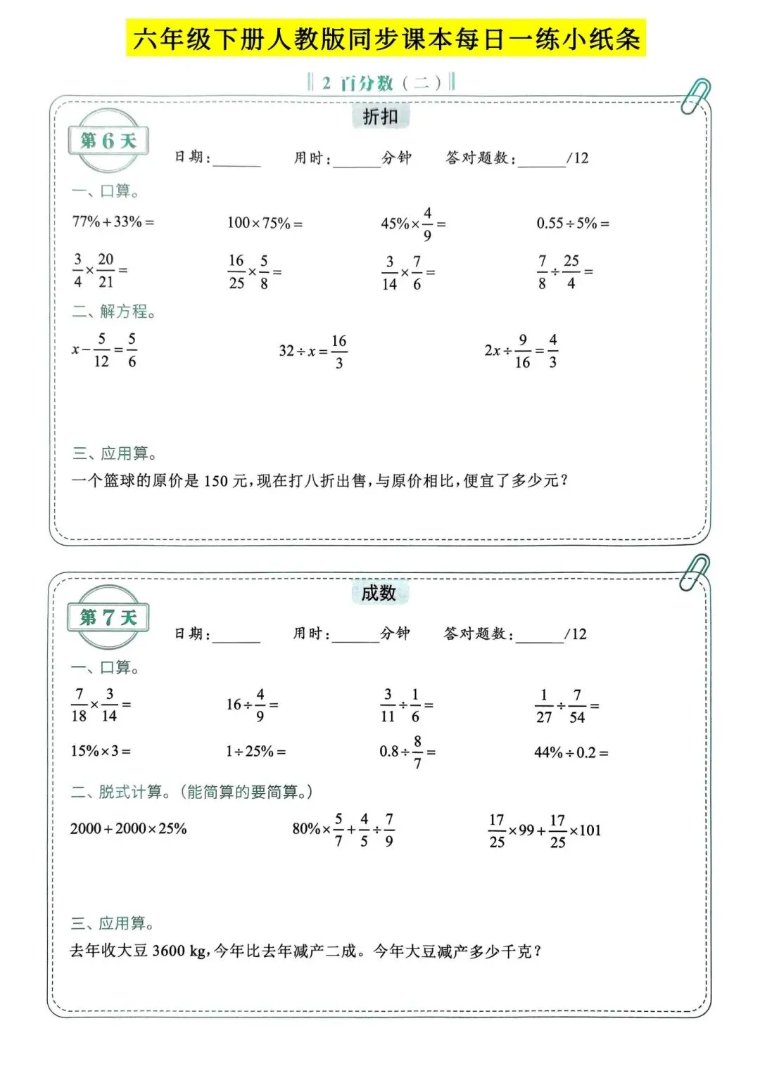 人教版小学数学六年级下册同步课本每日一练小纸条