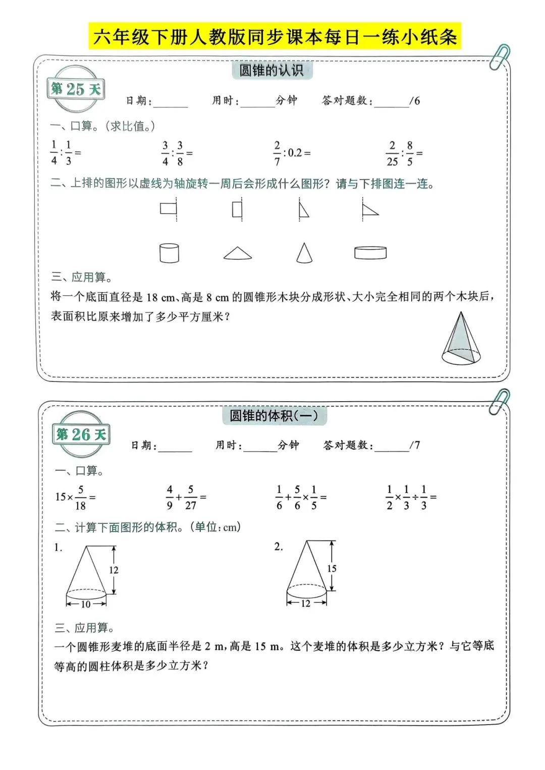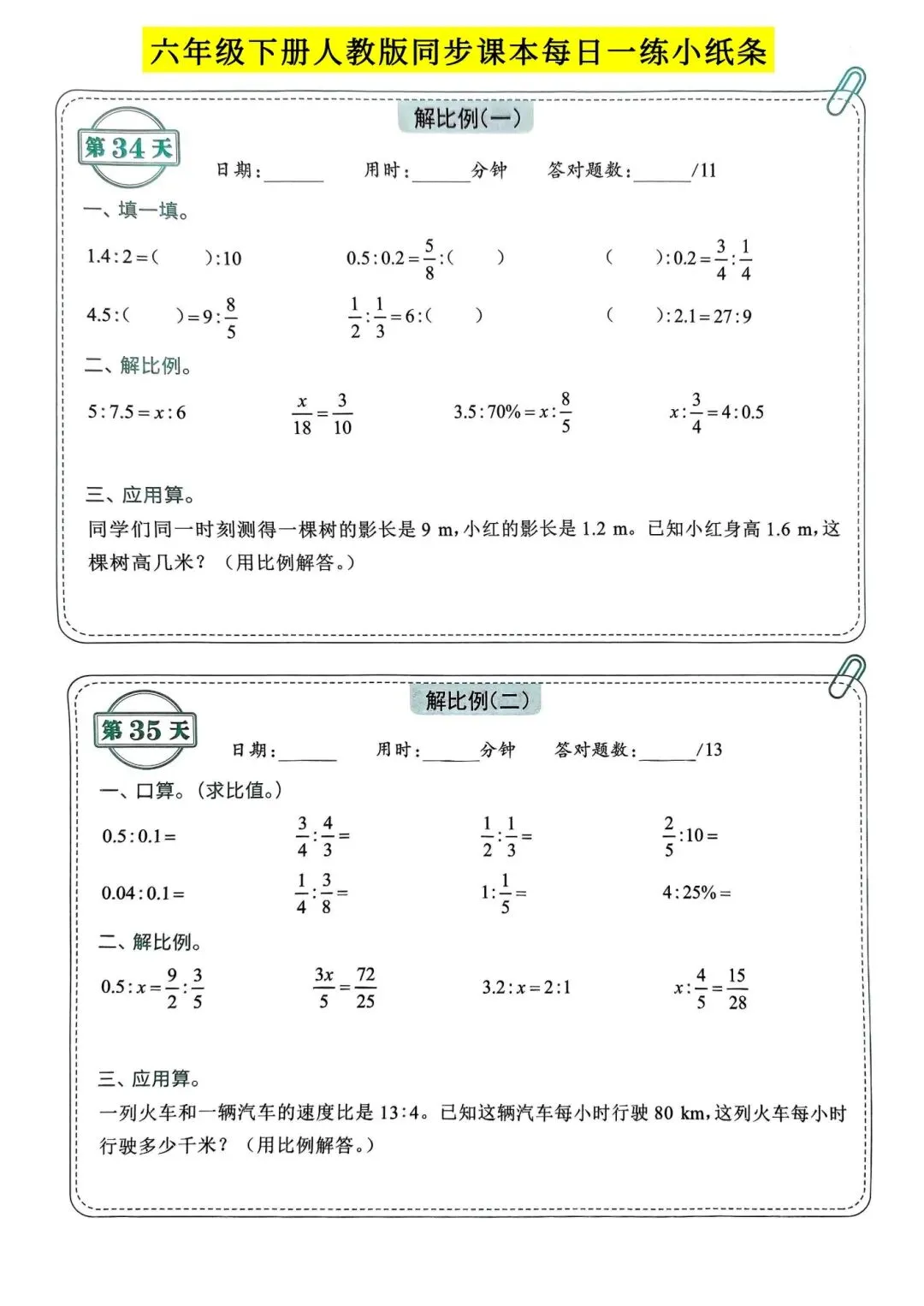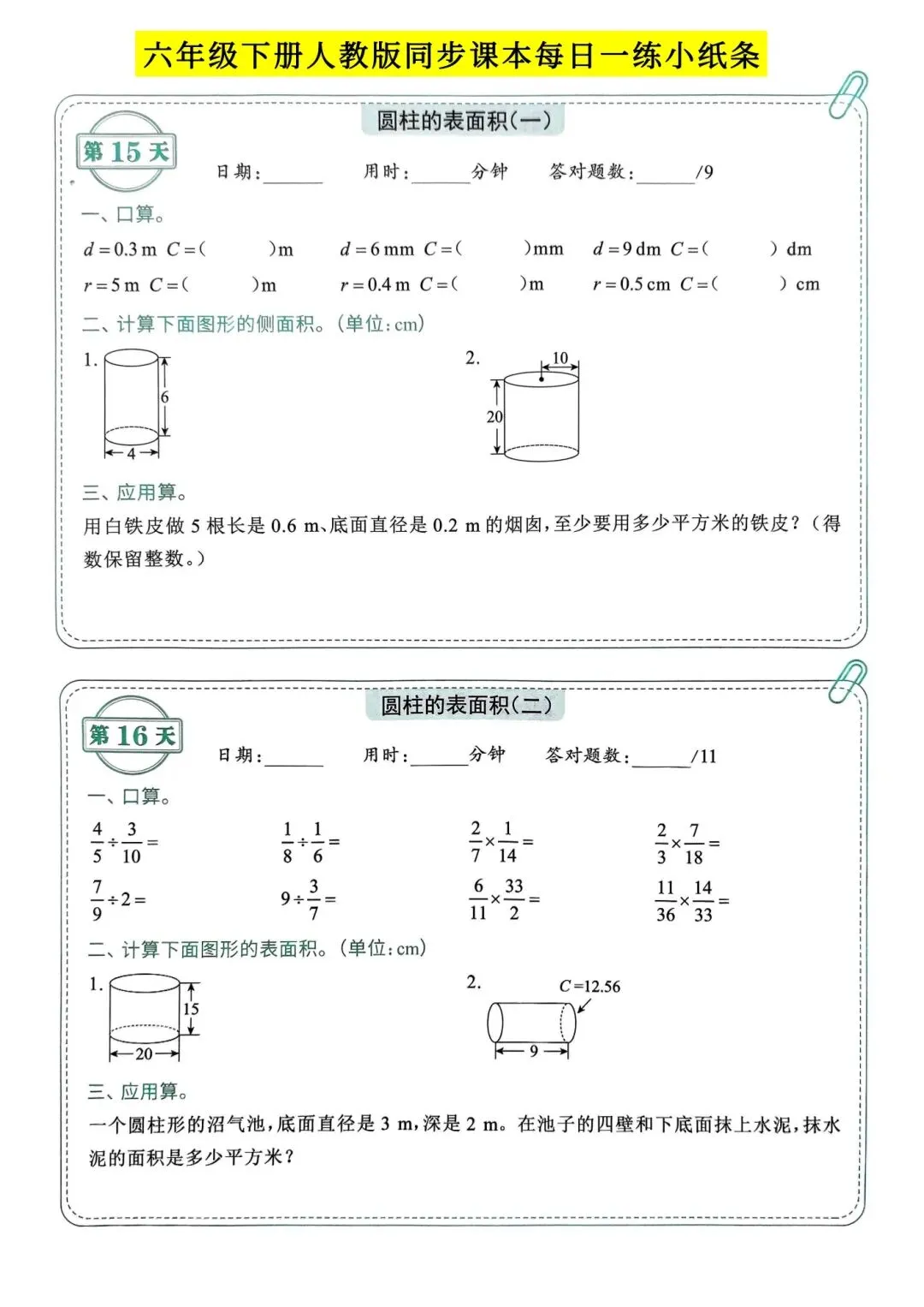 人教版小学数学六年级下册同步课本每日一练小纸条