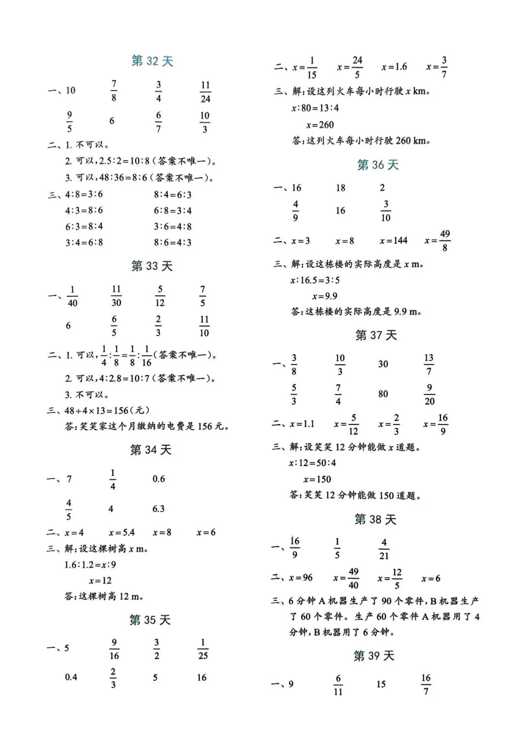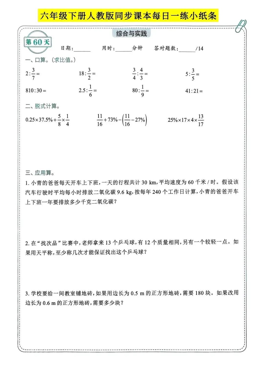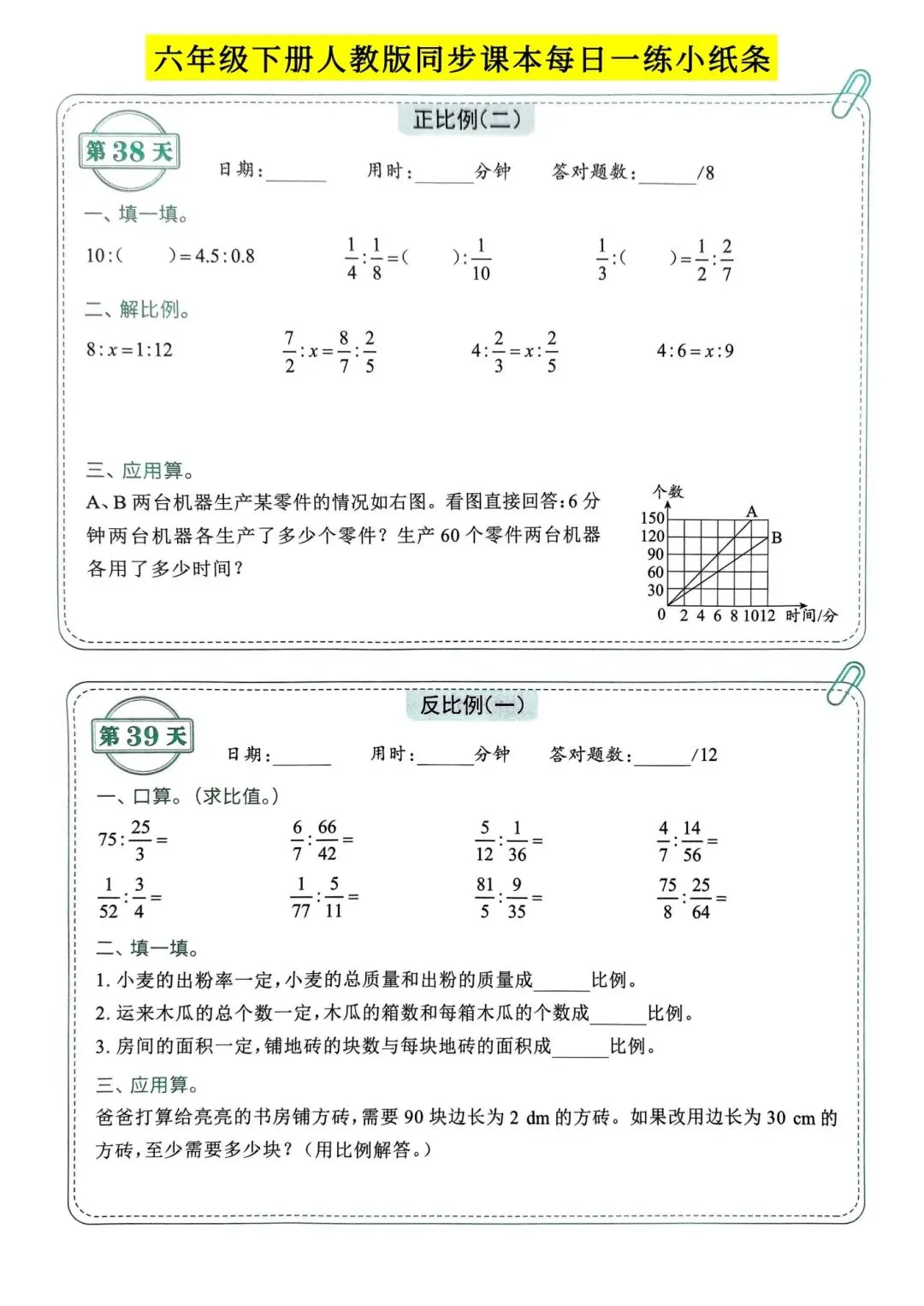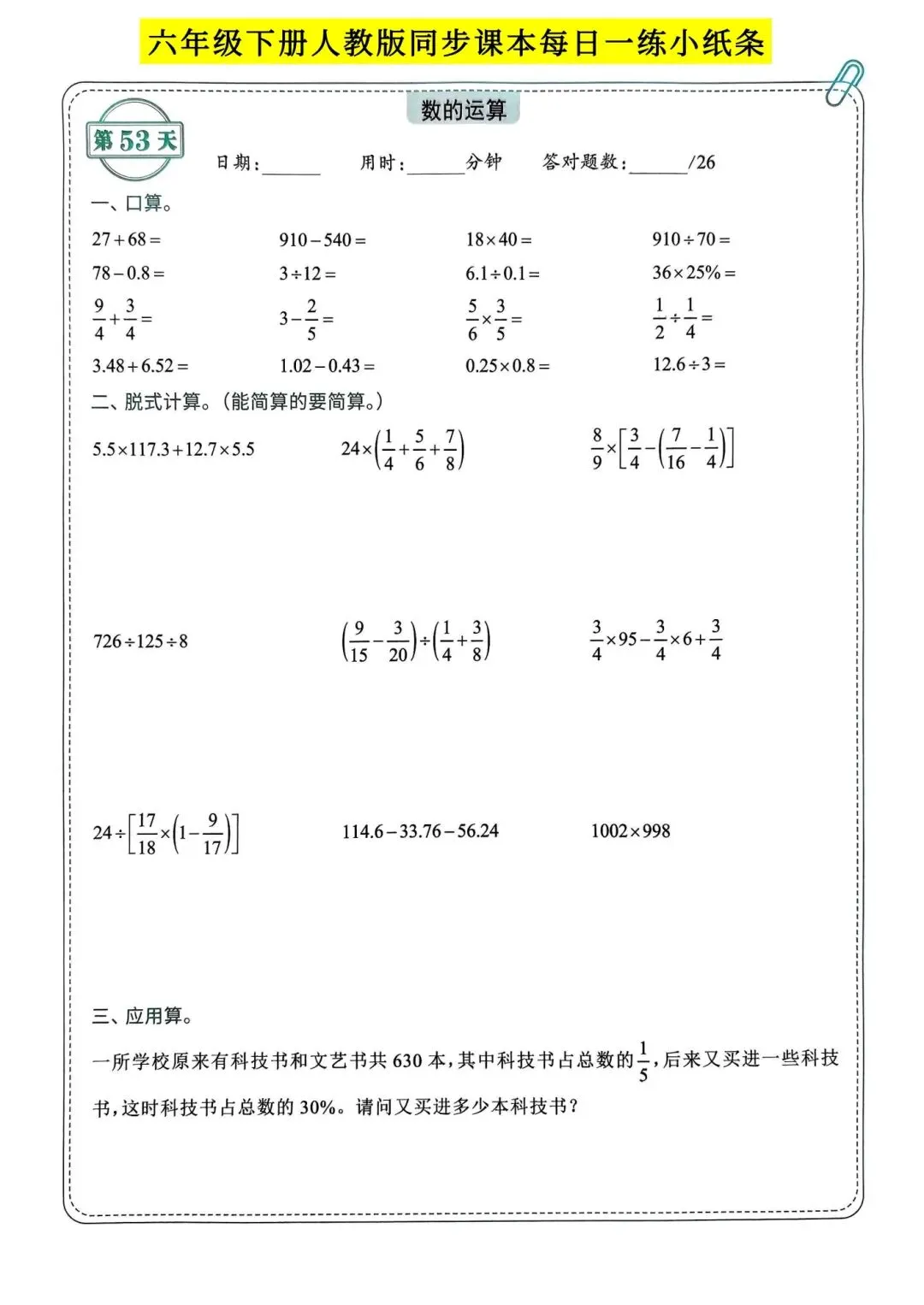 人教版小学数学六年级下册同步课本每日一练小纸条