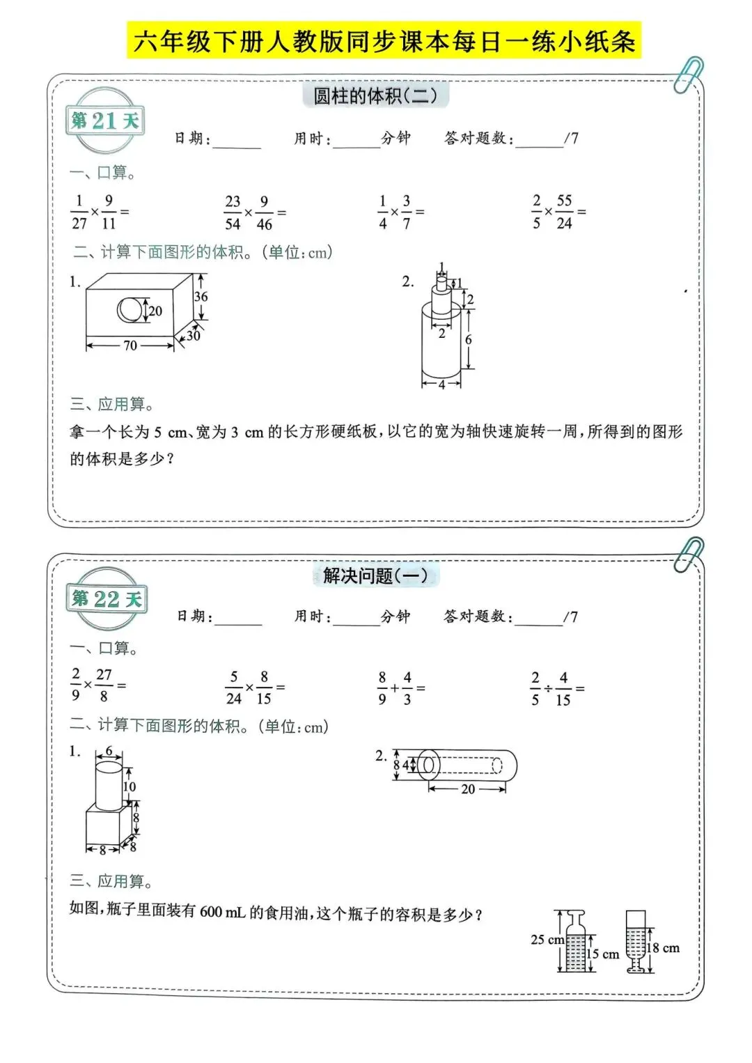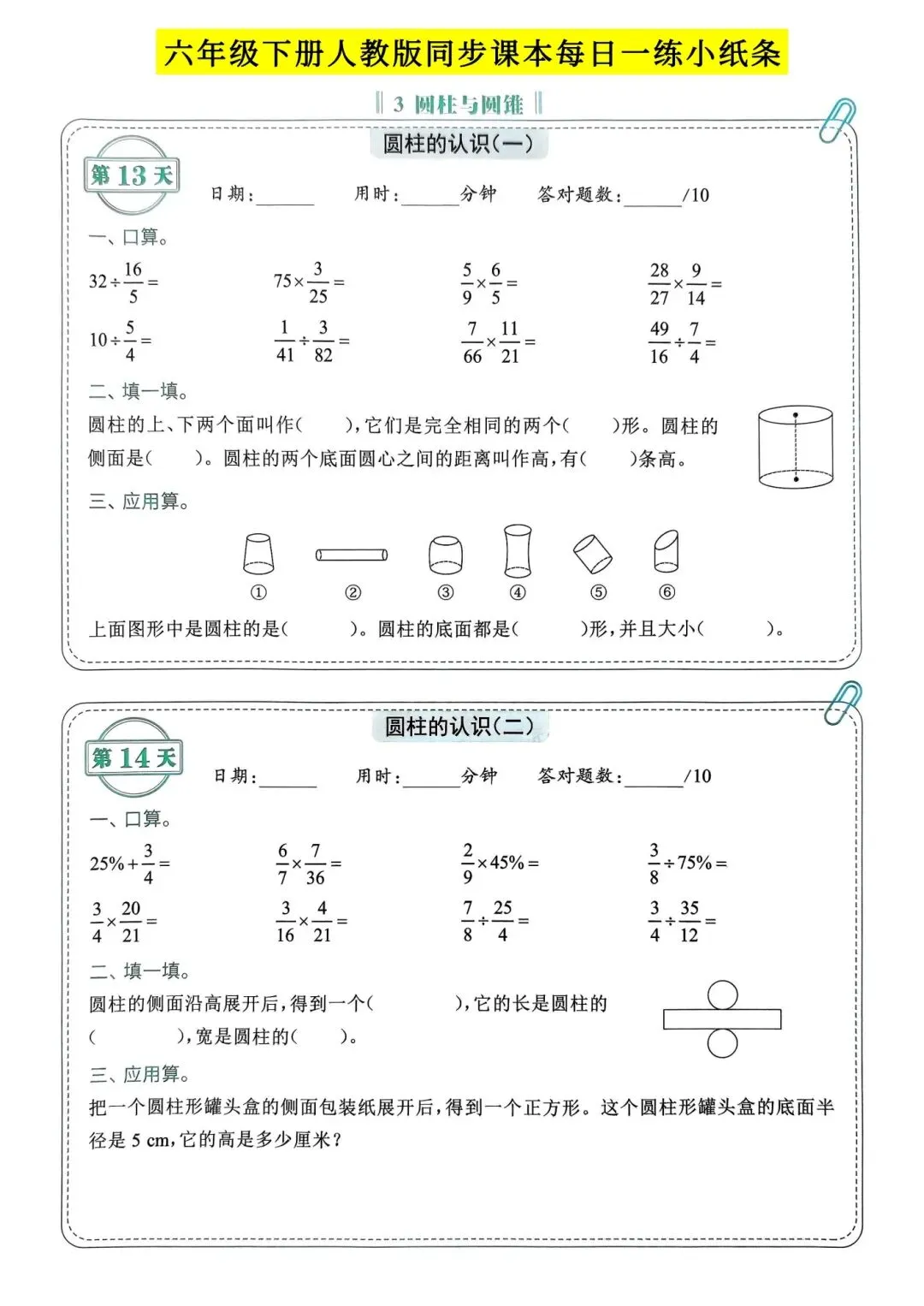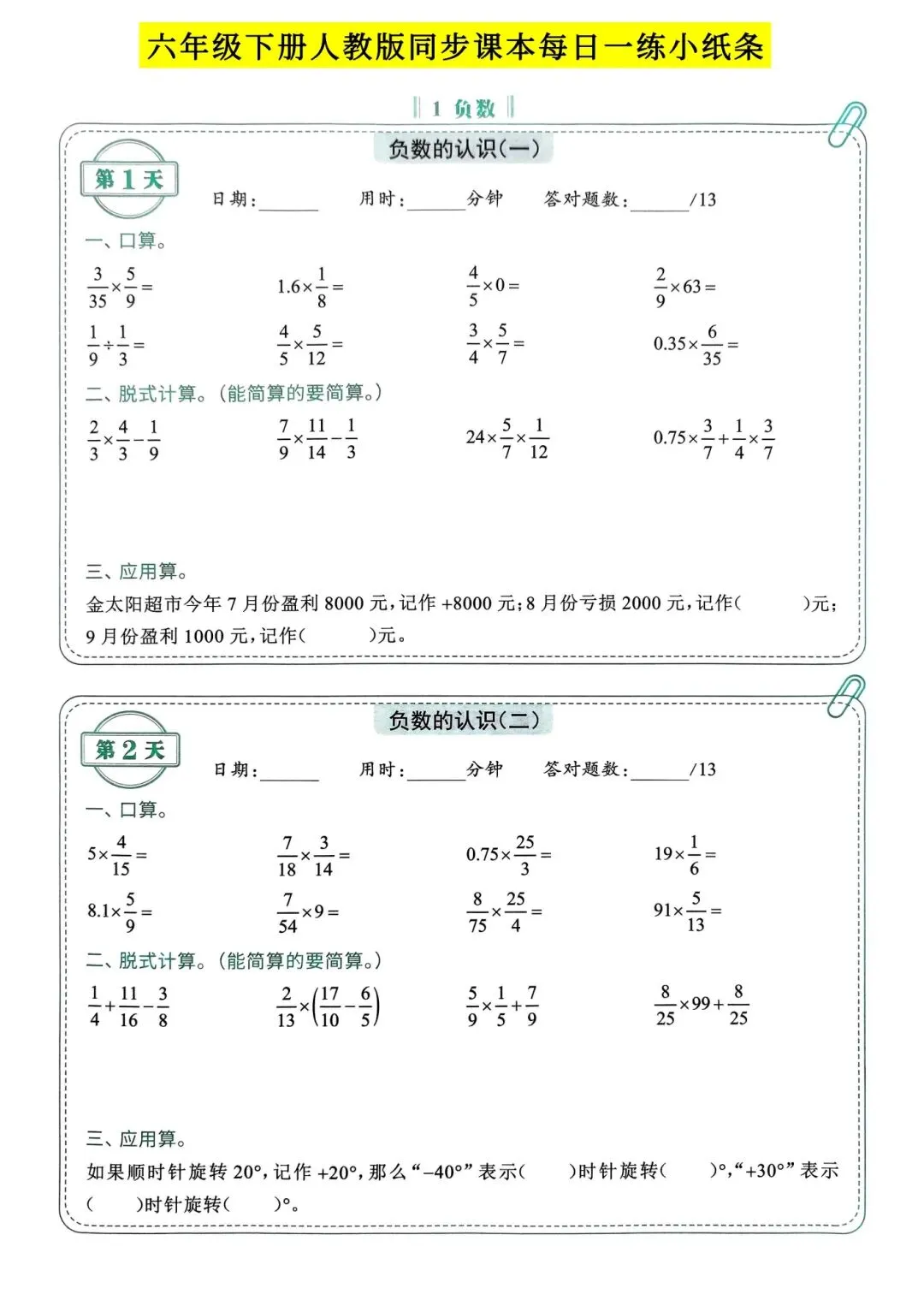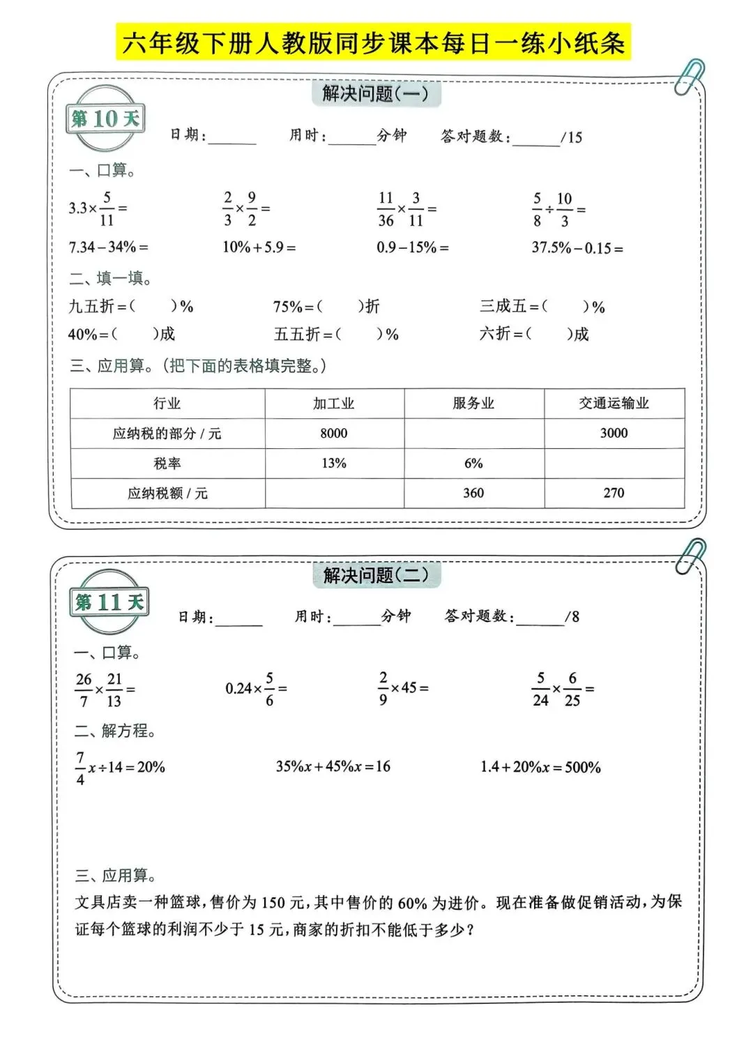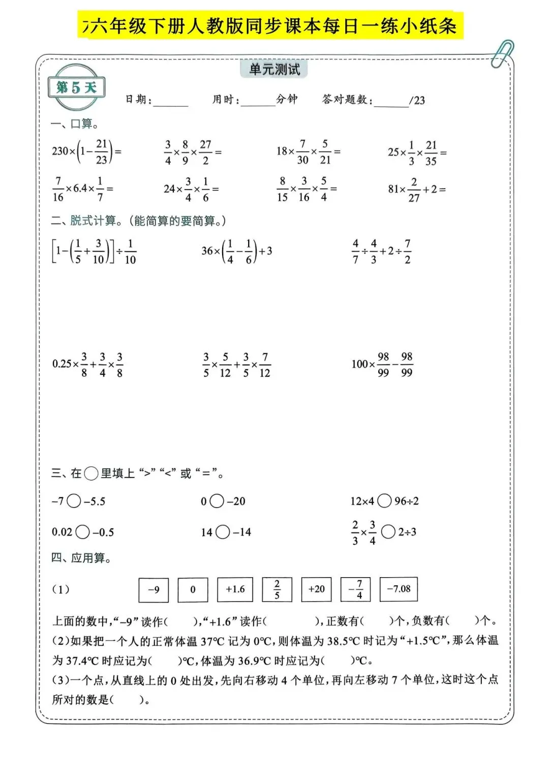 >人教版小学数学六年级下册同步课本每日一练小纸条