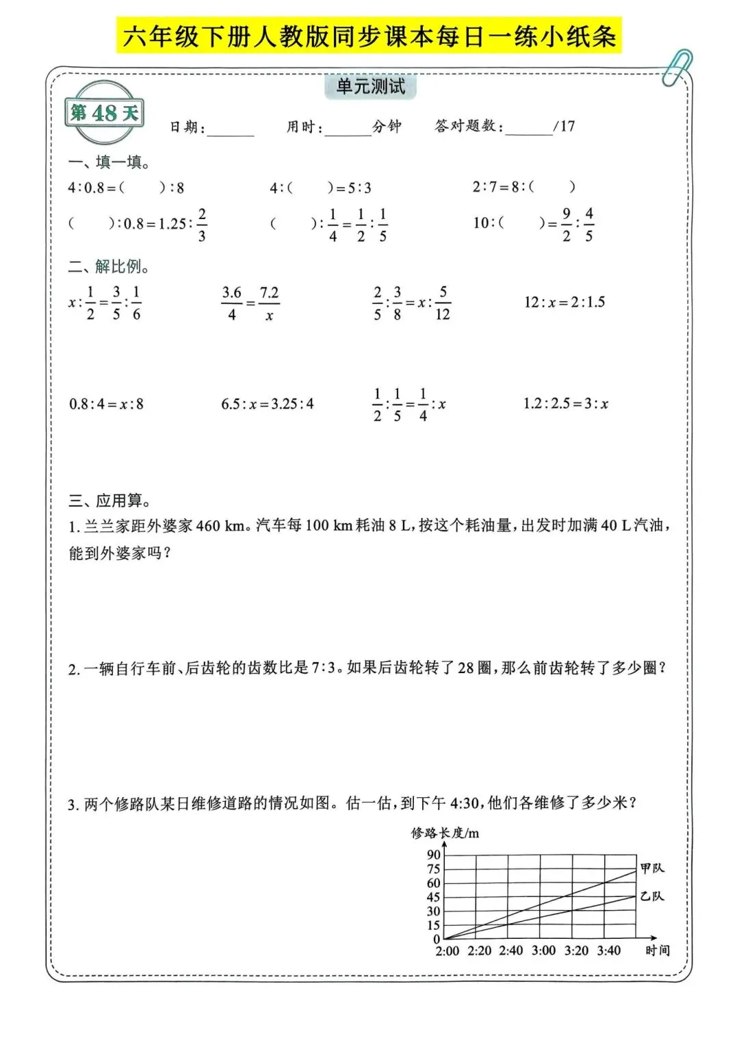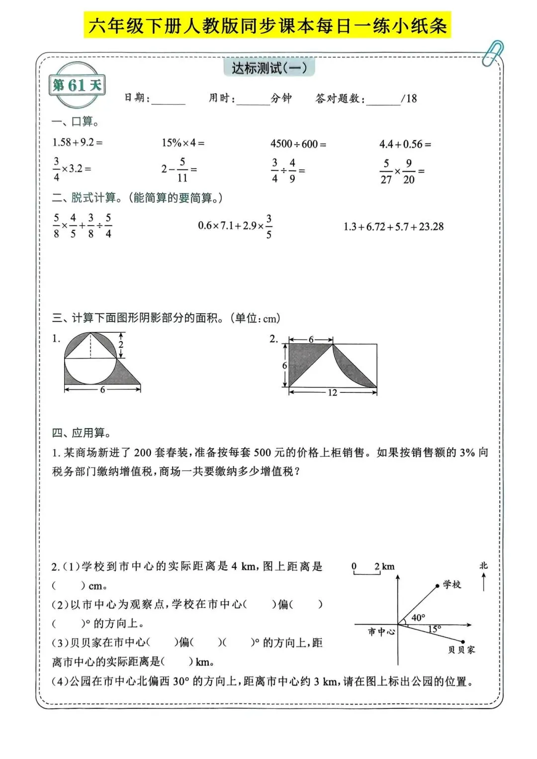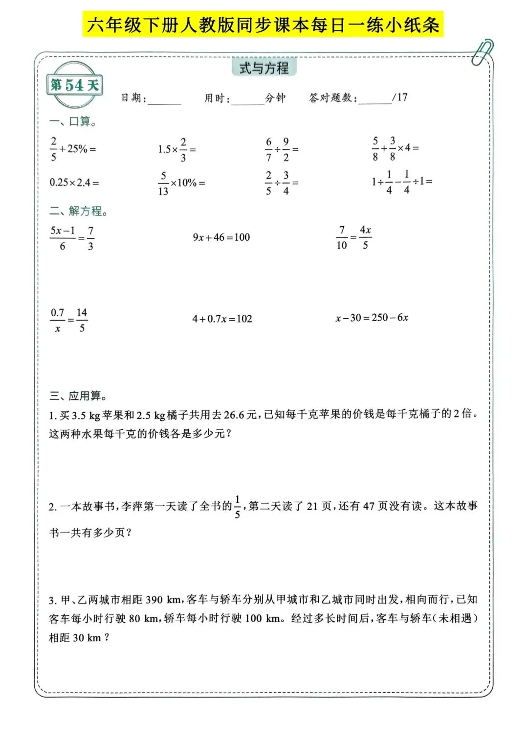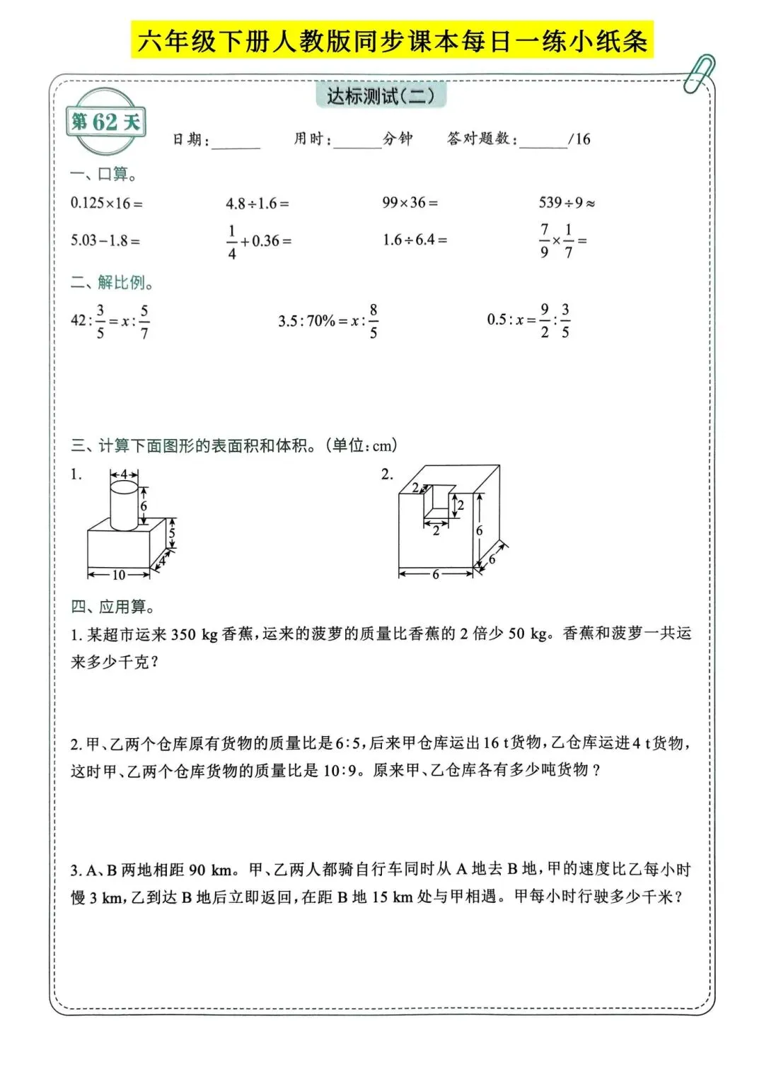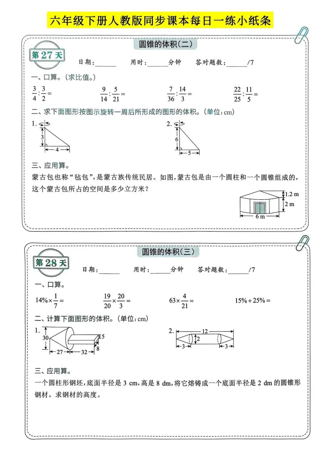 >人教版小学数学六年级下册同步课本每日一练小纸条