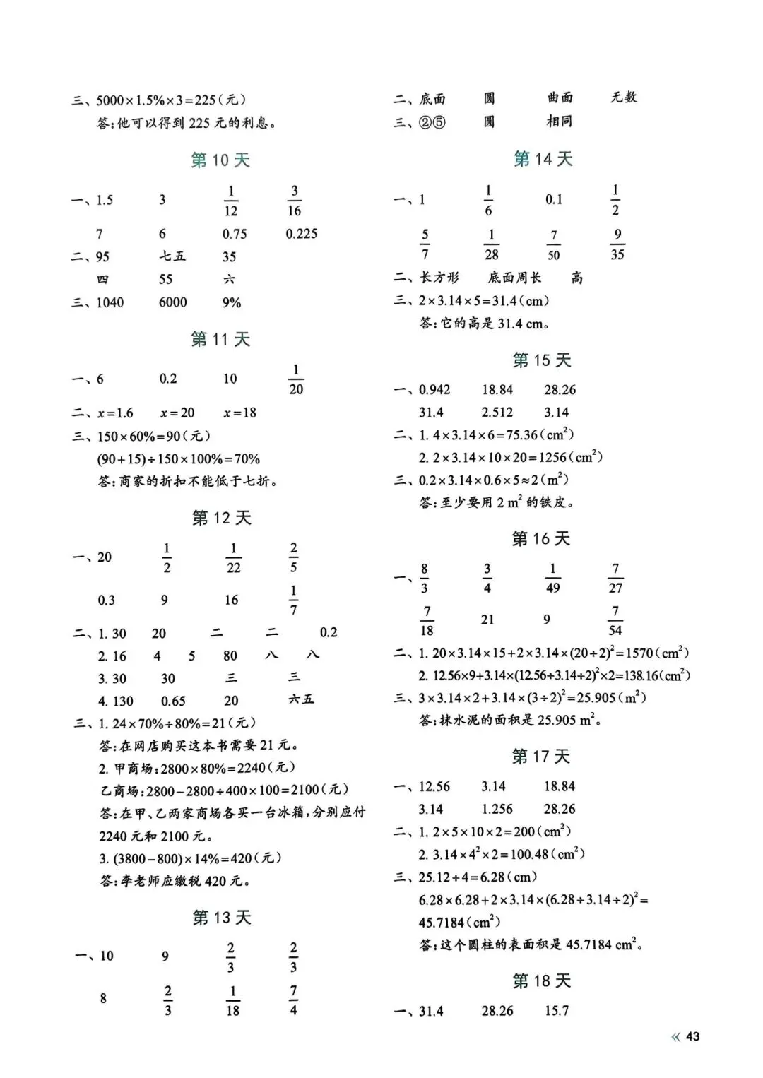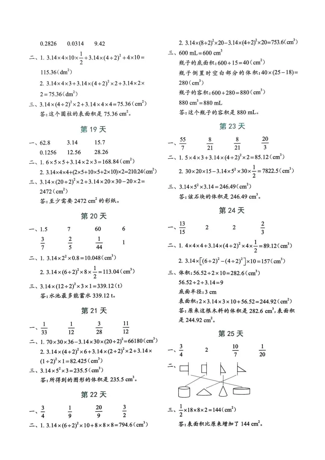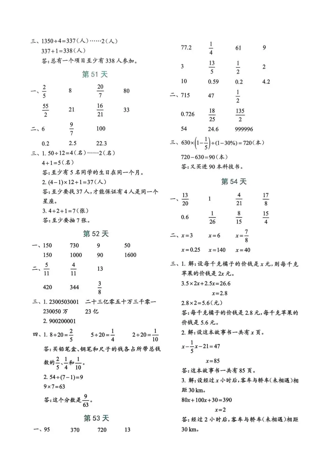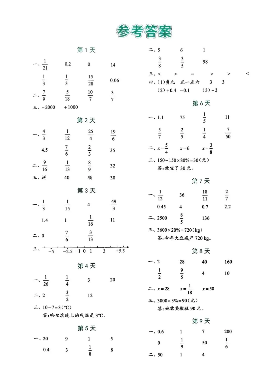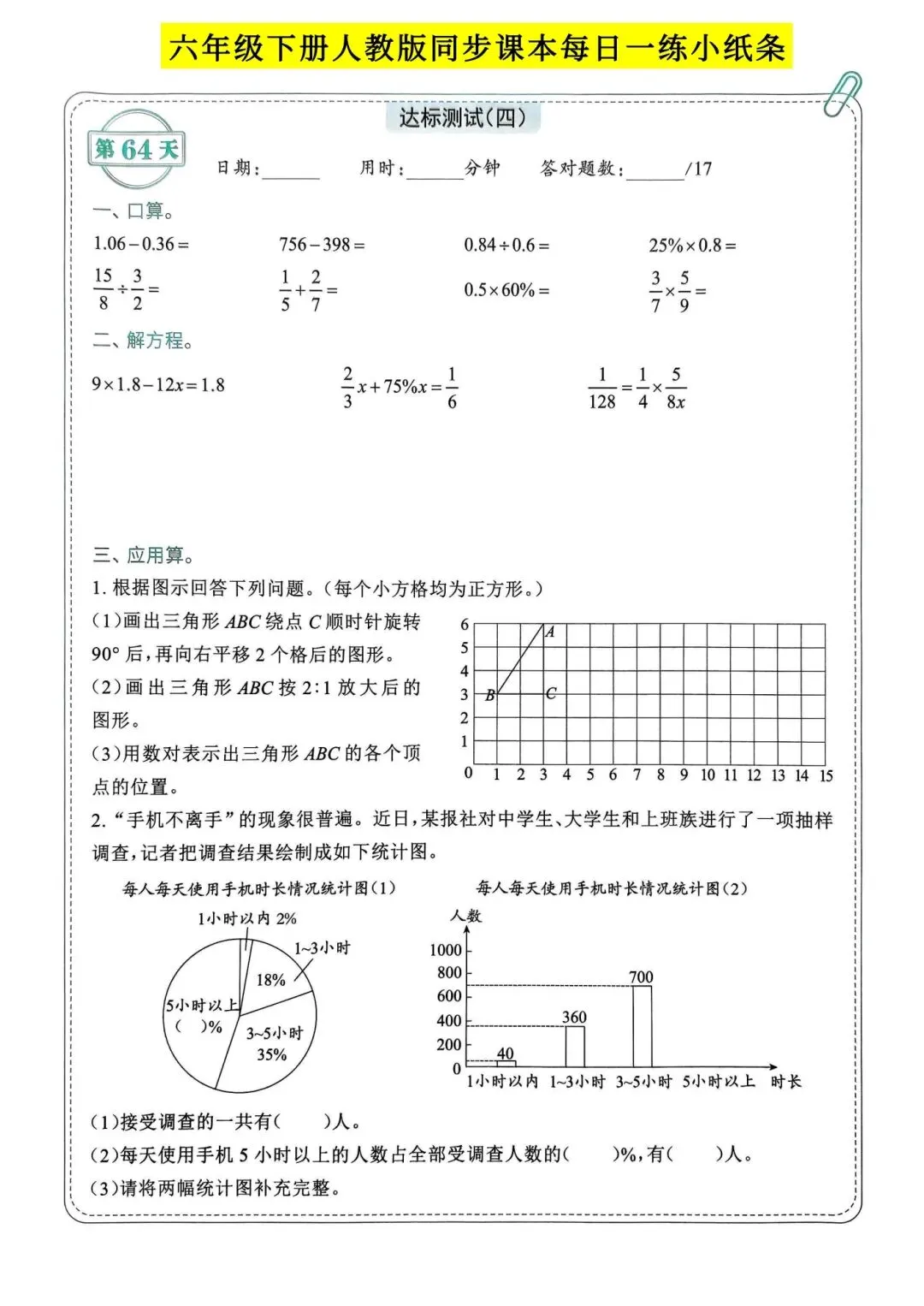 >人教版小学数学六年级下册同步课本每日一练小纸条