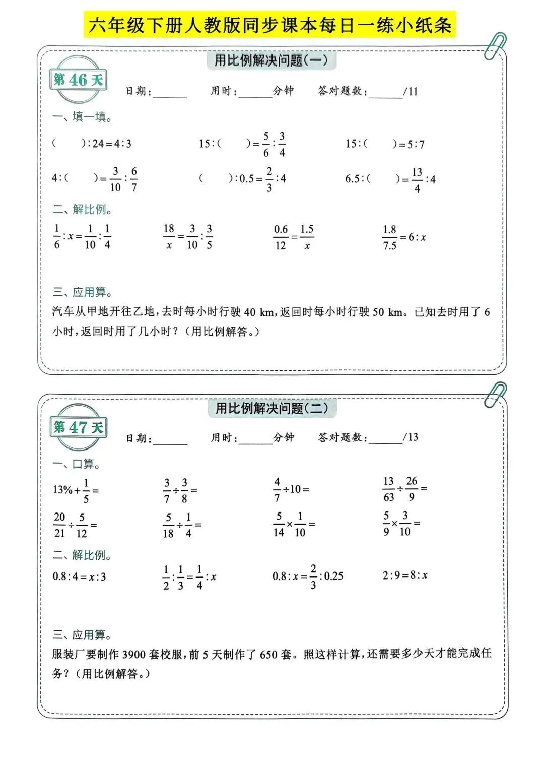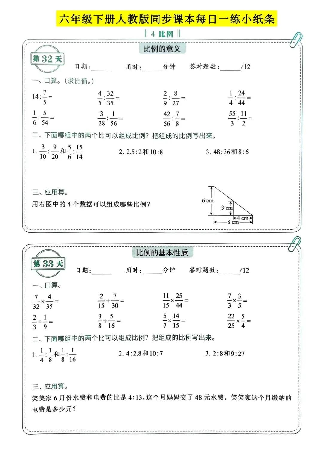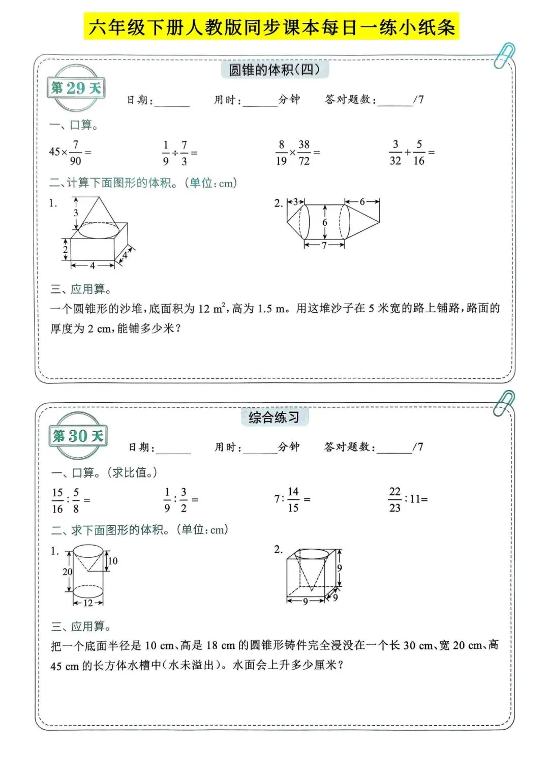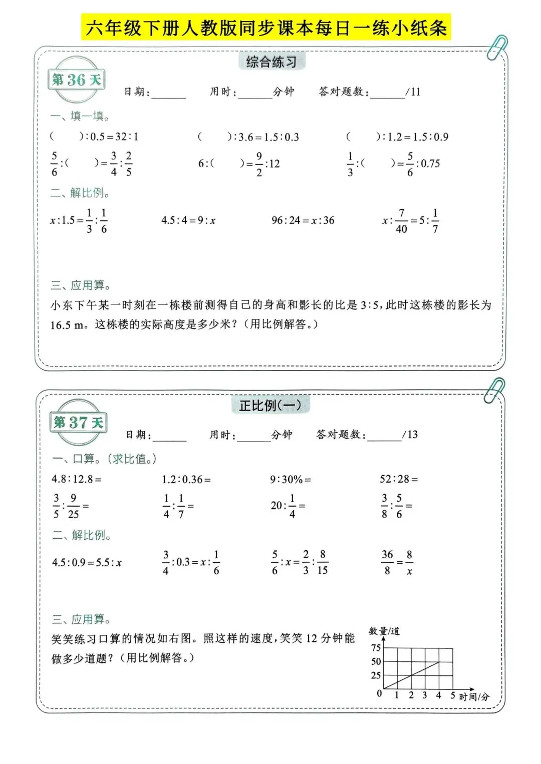人教版小学数学六年级下册同步课本每日一练小纸条
