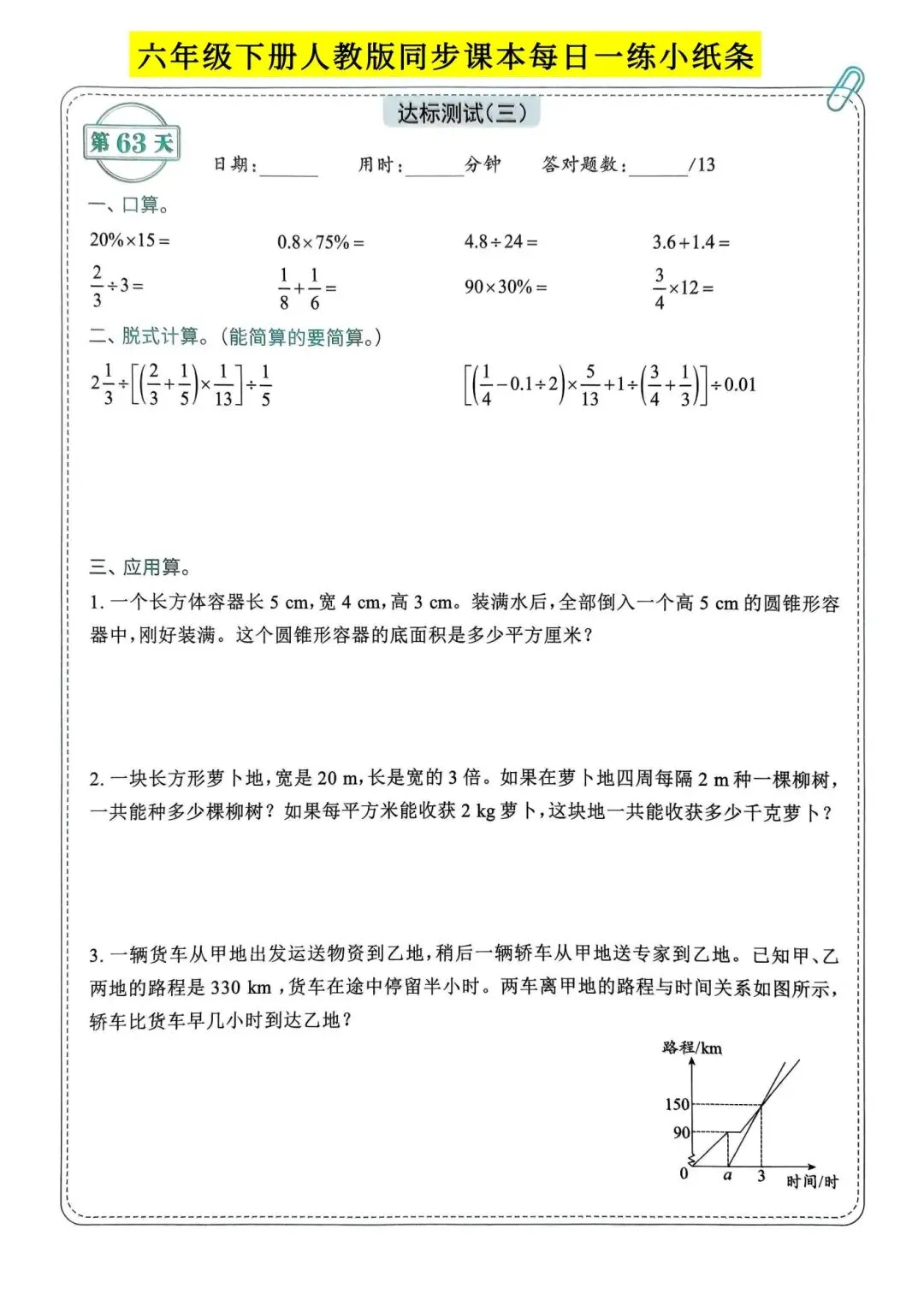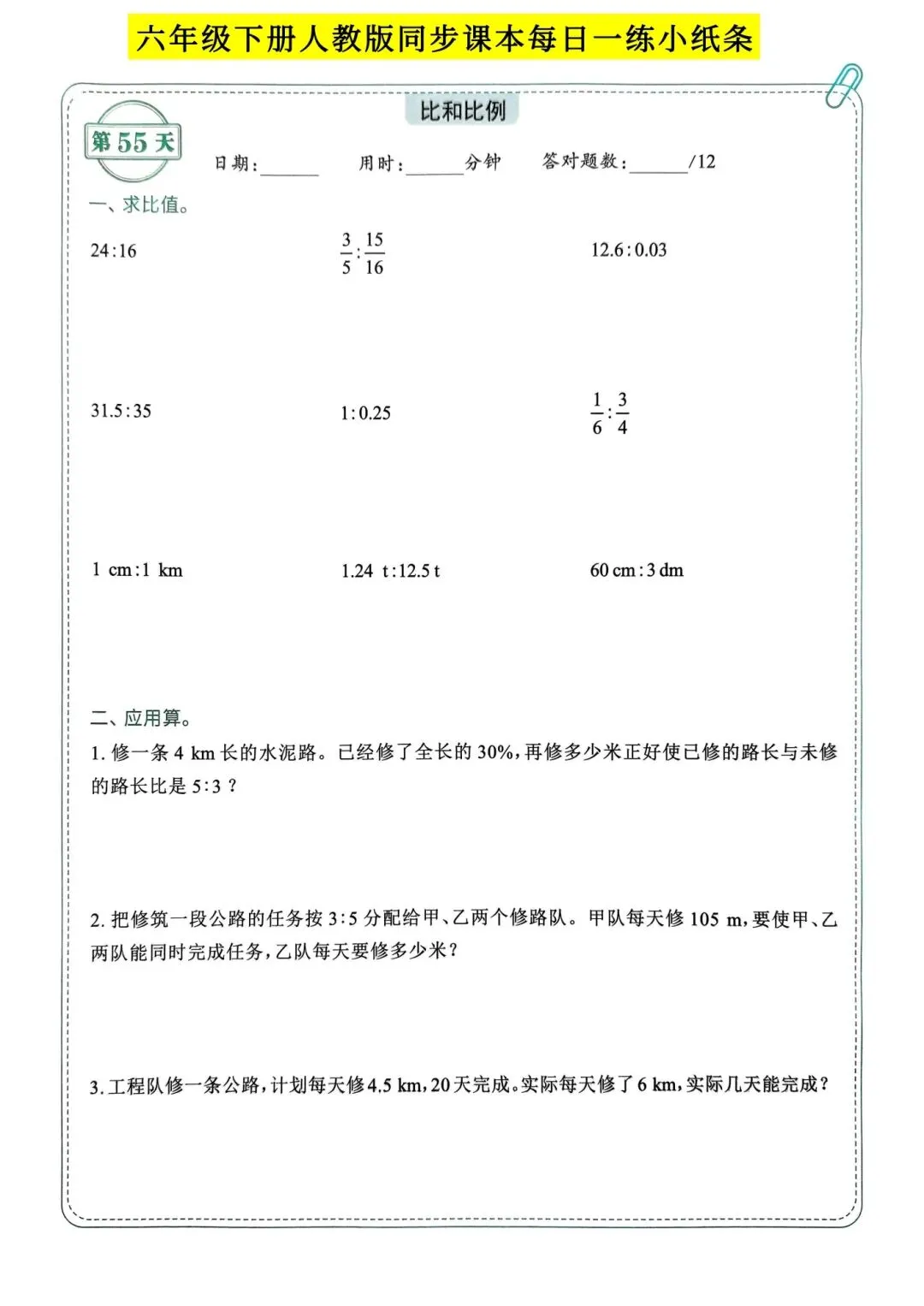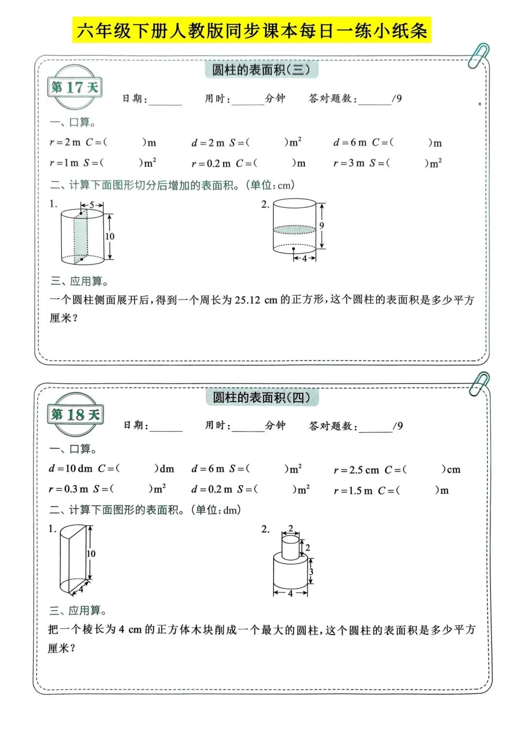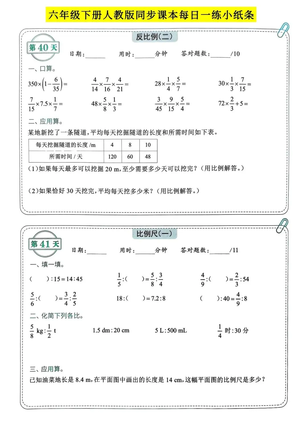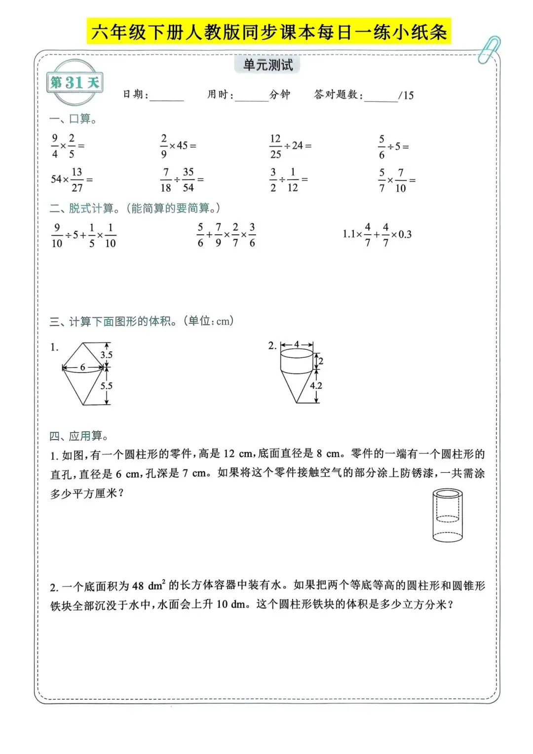 人教版小学数学六年级下册同步课本每日一练小纸条