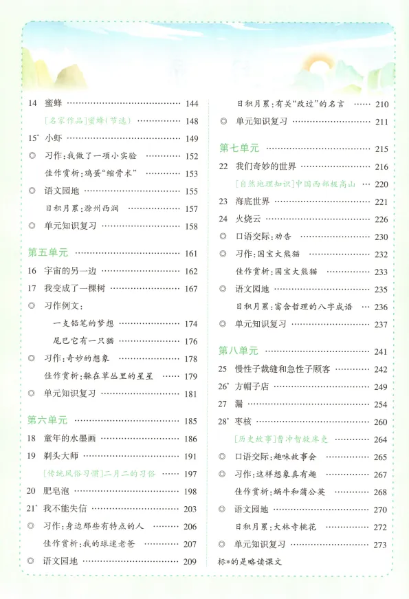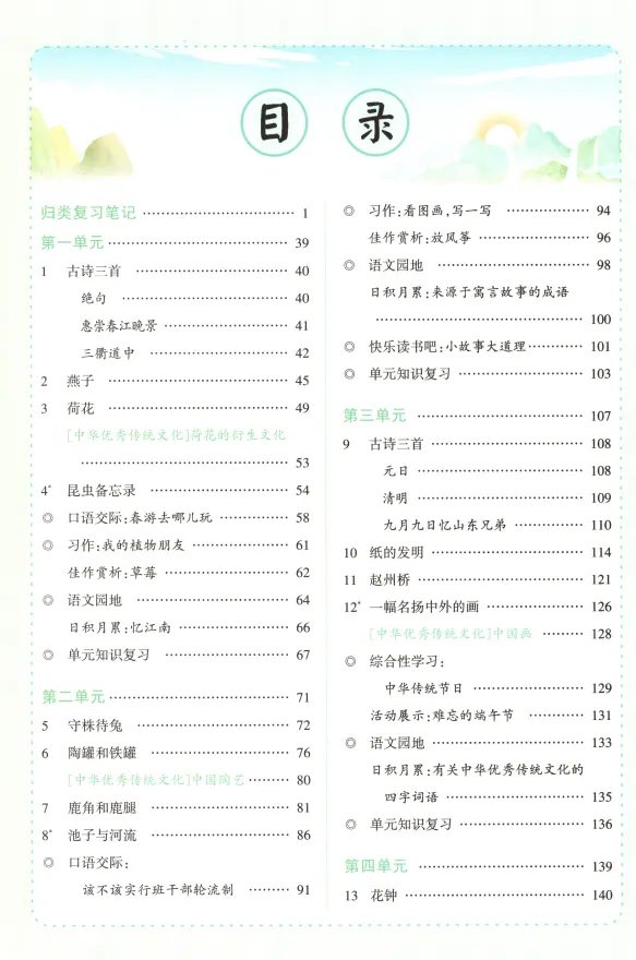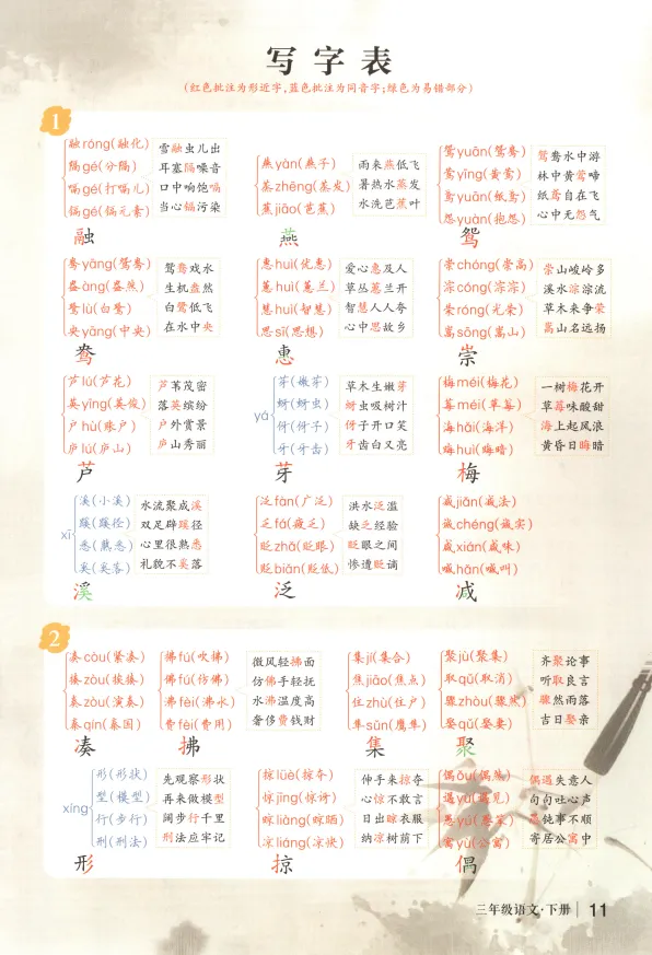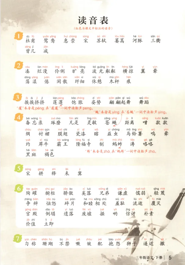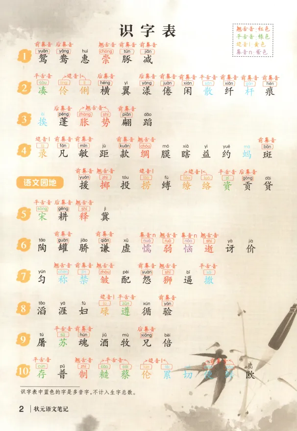 含识字表、读字表、多音字表、学习表、词语表、近义词、反义词、课外成语积累、作家作品介绍