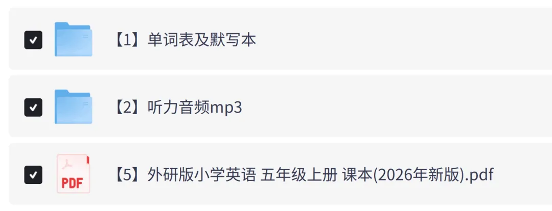 外研社版小学英语五年级上册电子课本教材+单词表+单词默写表+听力音频完整版(2026年新版教材),可下载打印!