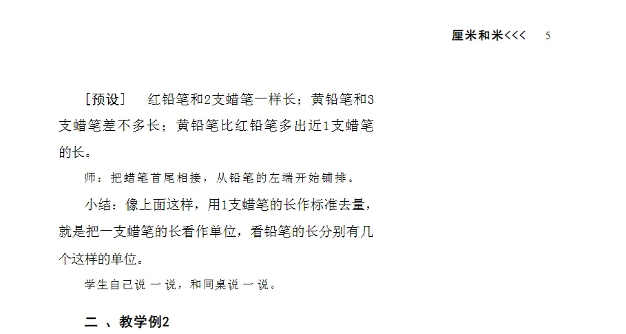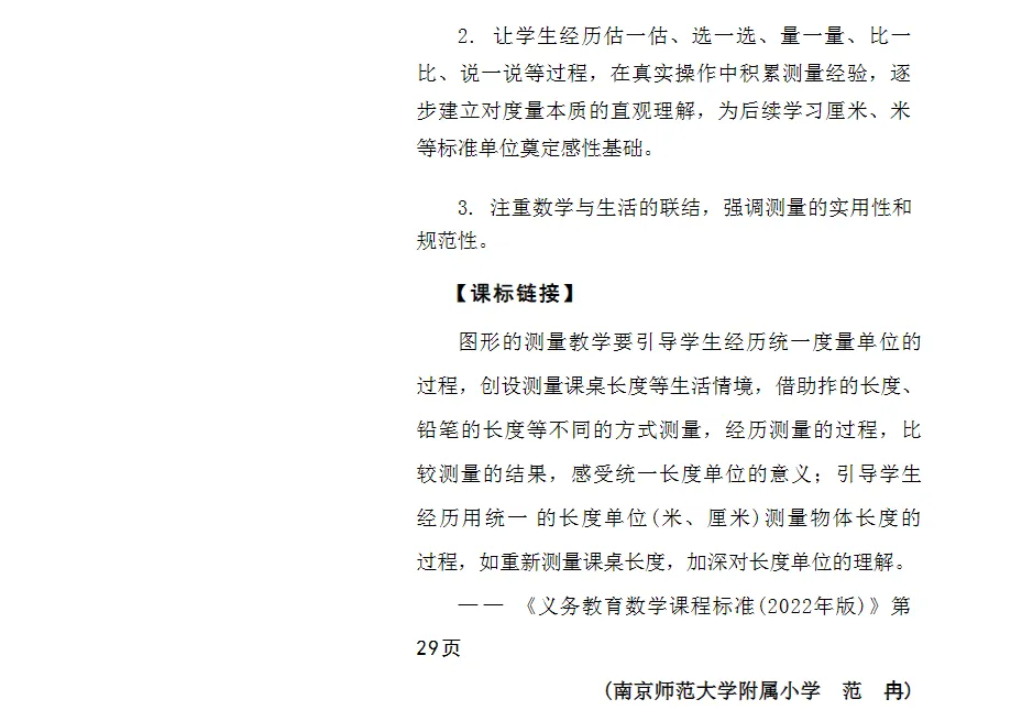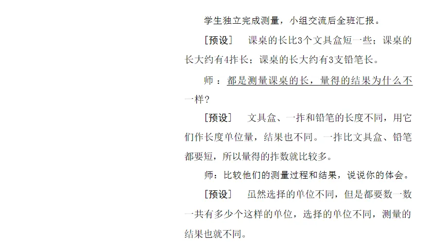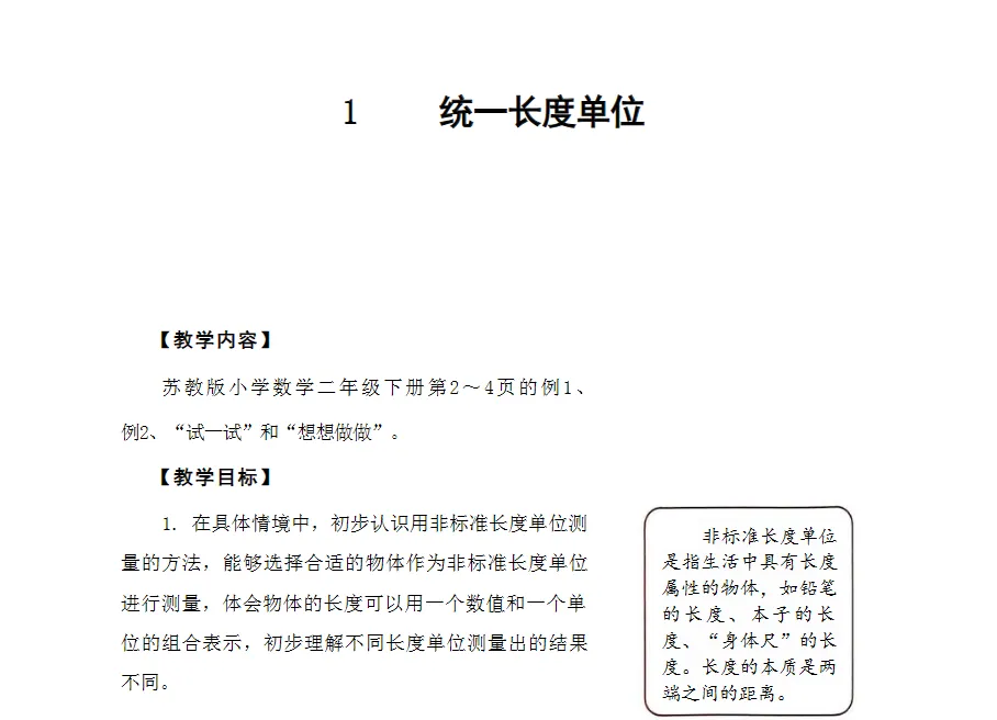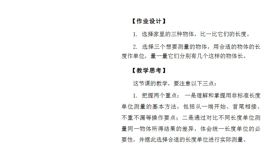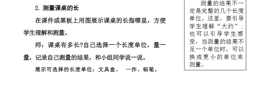 1.把握两个重点:一是理解和掌握用非标准长度单位测量的基本方法,包括从一端开始、首尾相接、不重不漏等操作要点;二是通过对比不同长度单位测量同一物体所得结果的差异,体会统一长度单位的必要性,并据此选择合适的长度单位进行实际测量。