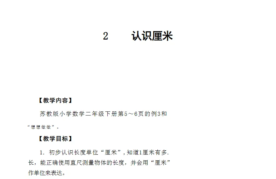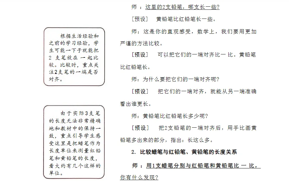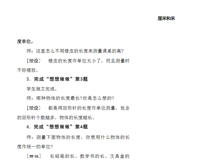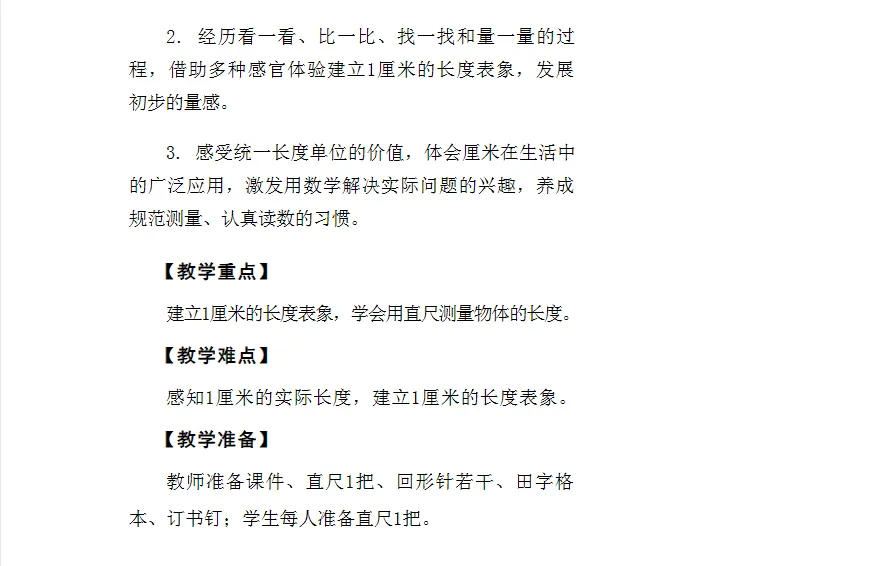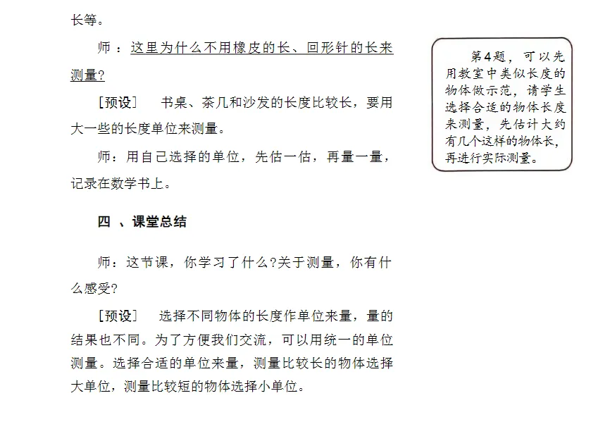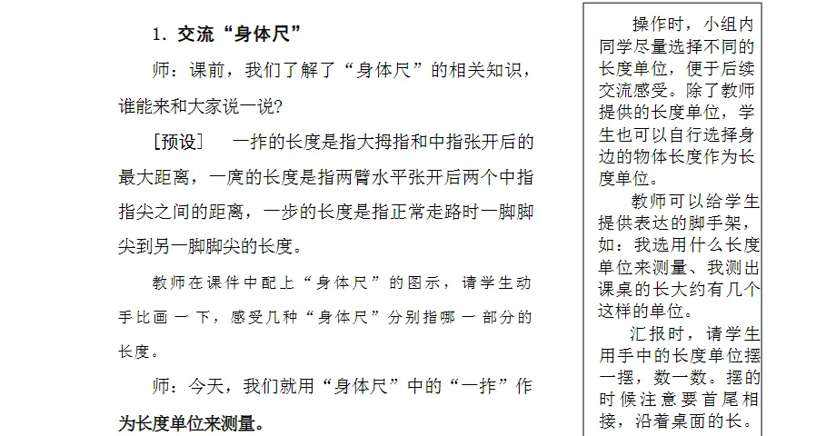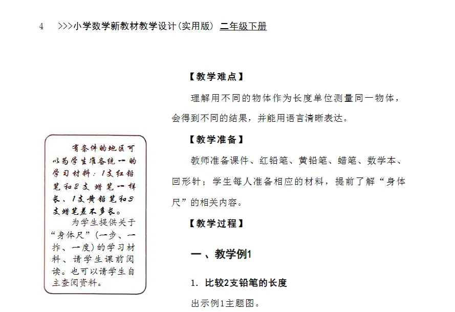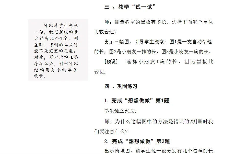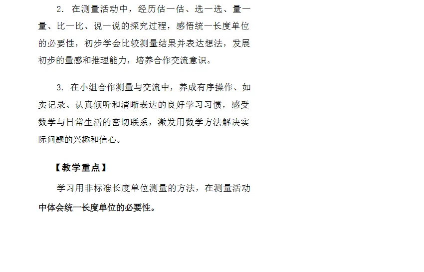 2.让学生经历估一估、选一选、量一量、比一比、说一说等过程,在真实操作中积累测量经验,逐步建立对度量本质的直观理解,为后续学习厘米、米等标准单位奠定感性基础。