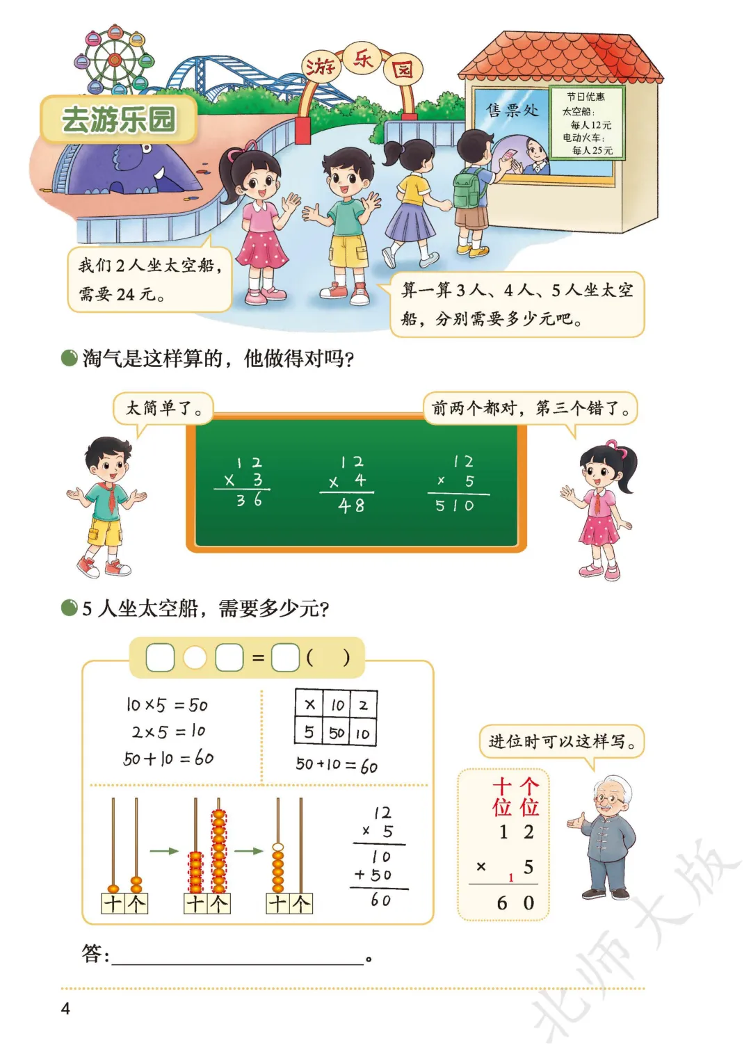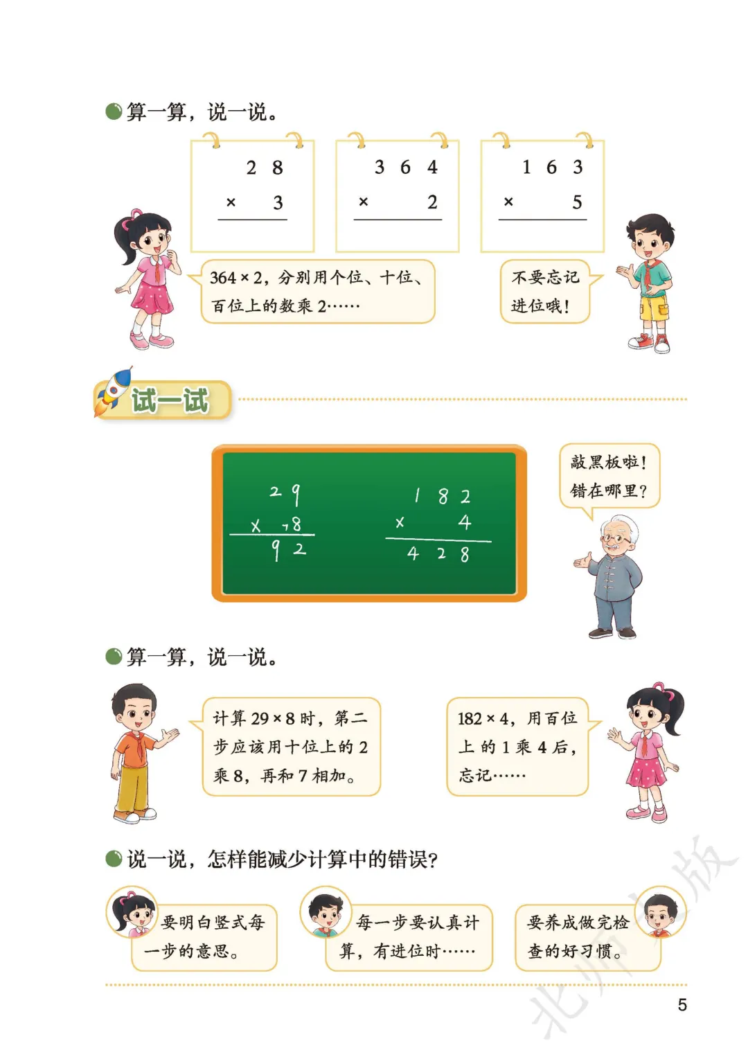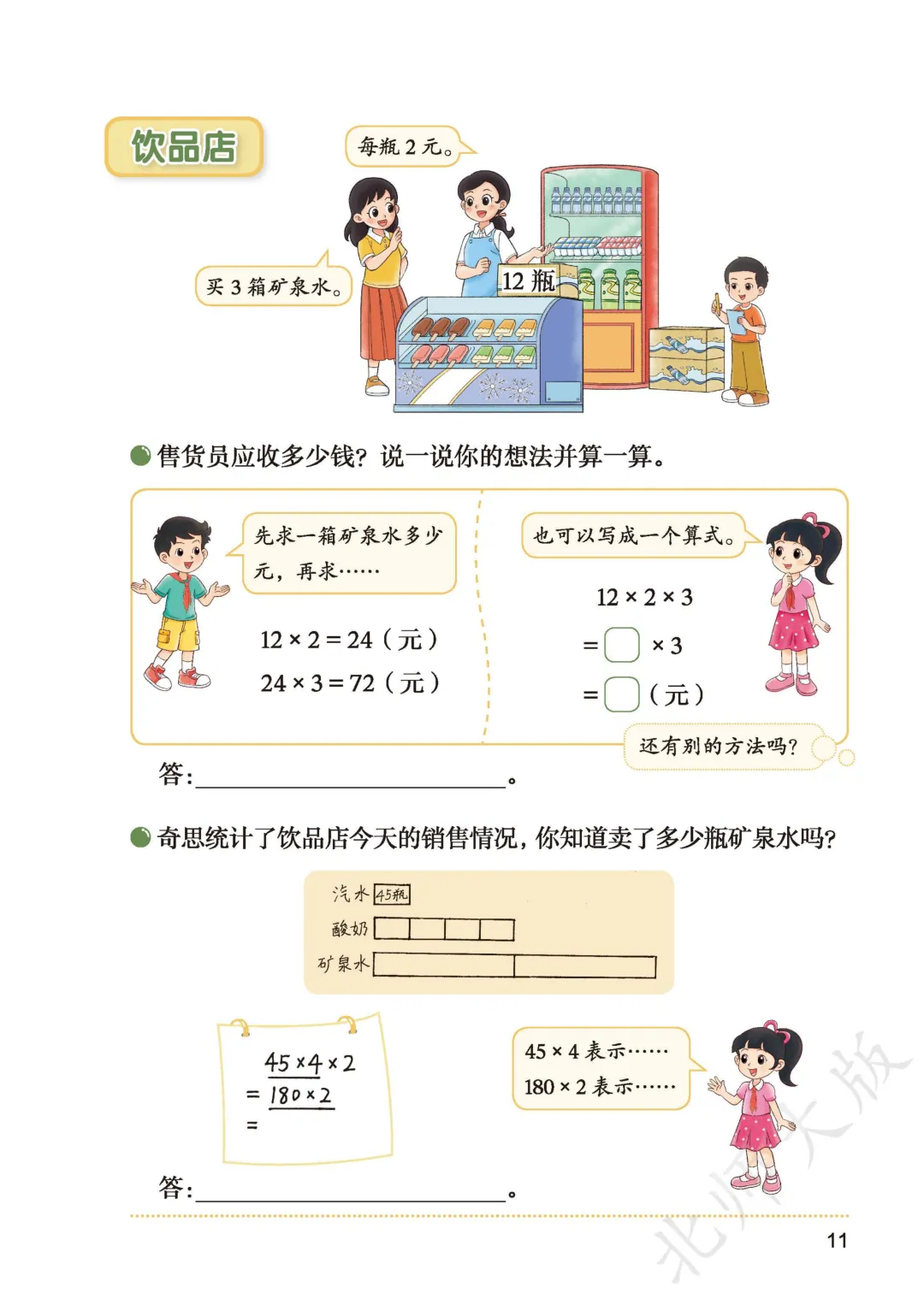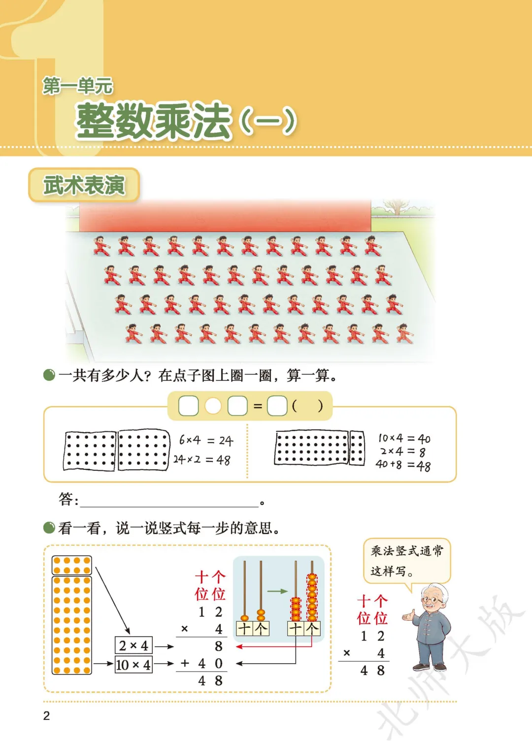 在这一单元,我们将和“武术表演”中的同学们一起,学习两位数、三位数乘一位数的乘法。你会在“点子图”上圈一圈,发现原来乘法可以拆开来算。我们还会去“游乐园”玩,买票时遇到进位乘法,看看淘气算得对不对。神奇的“0”也会加入我们,探索0乘任何数都得0的秘密。最后,我们还要帮“饮品店”老板算账,用连乘解决实际问题;去体育场估计观众人数,学习如何估算大数;还要做一个小小理财师,用列表法找到最省钱的购物方案。学完这个单元,你就是一位乘法小专家啦!