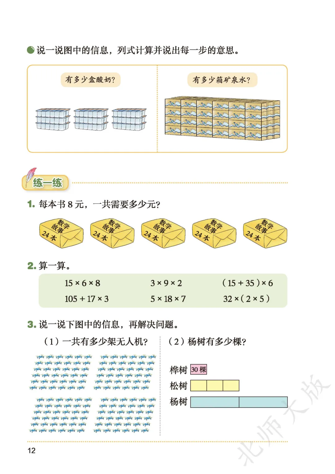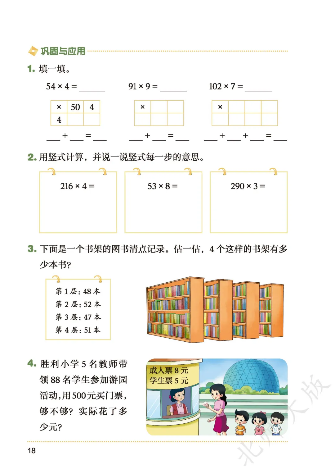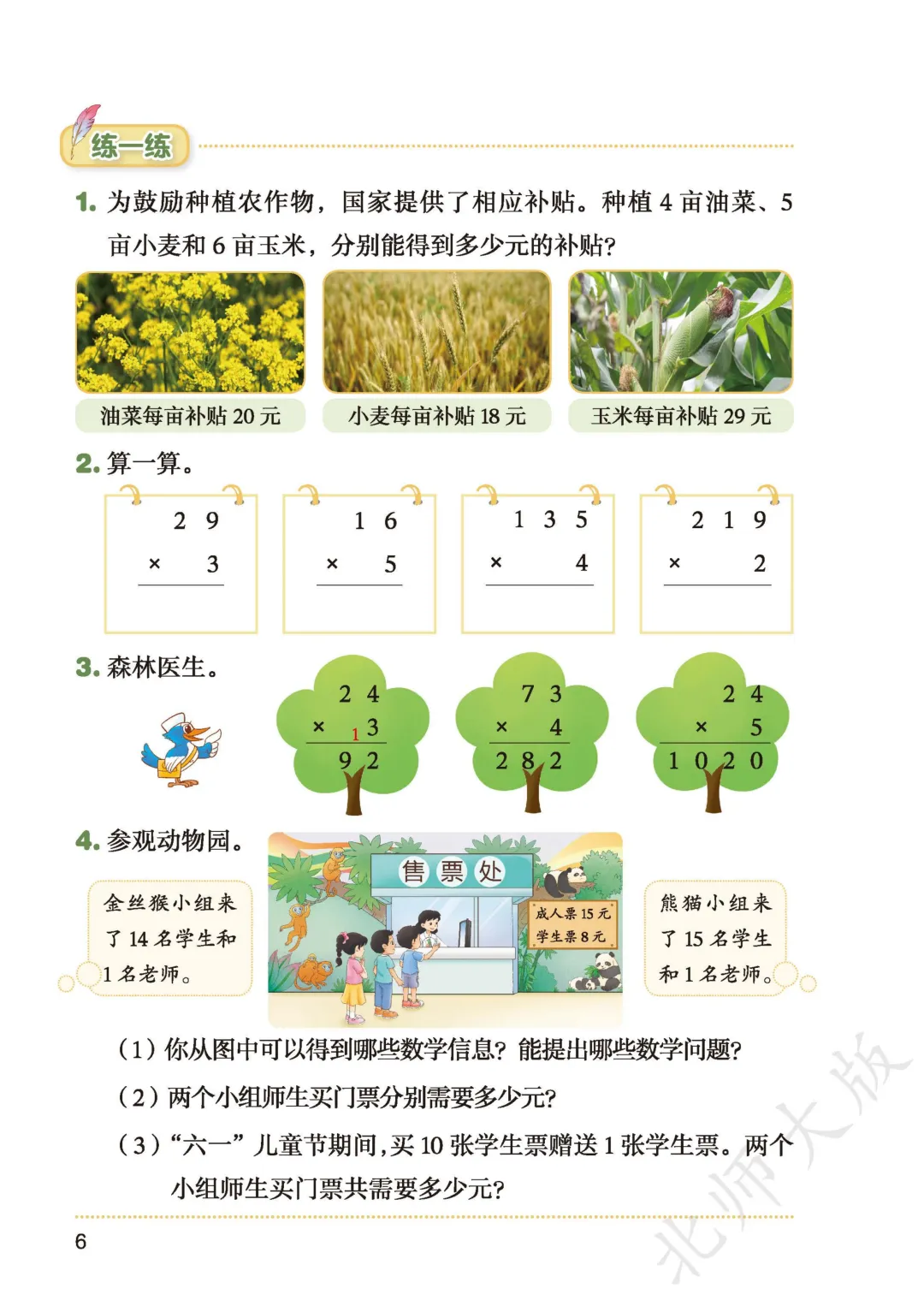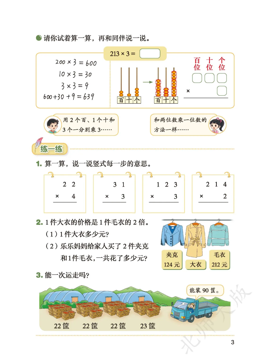 在这一单元,我们将和“武术表演”中的同学们一起,学习两位数、三位数乘一位数的乘法。你会在“点子图”上圈一圈,发现原来乘法可以拆开来算。我们还会去“游乐园”玩,买票时遇到进位乘法,看看淘气算得对不对。神奇的“0”也会加入我们,探索0乘任何数都得0的秘密。最后,我们还要帮“饮品店”老板算账,用连乘解决实际问题;去体育场估计观众人数,学习如何估算大数;还要做一个小小理财师,用列表法找到最省钱的购物方案。学完这个单元,你就是一位乘法小专家啦!