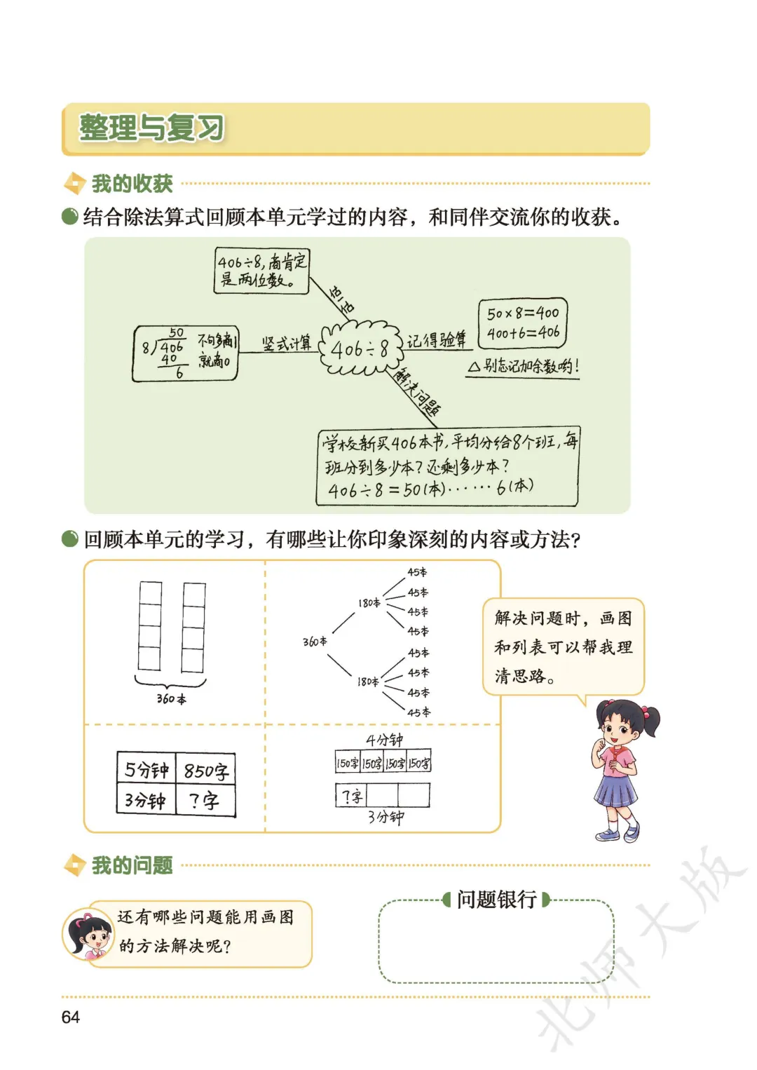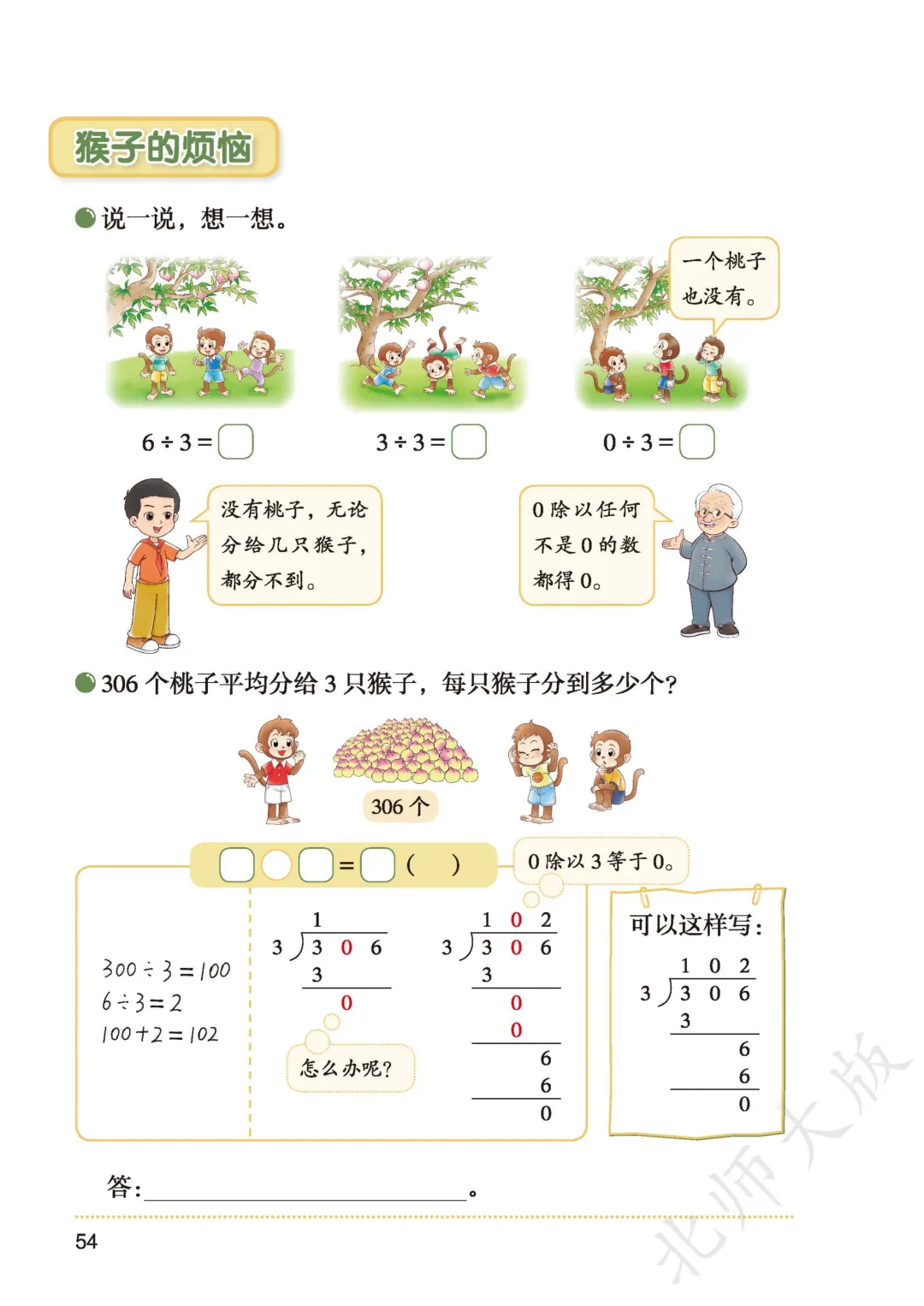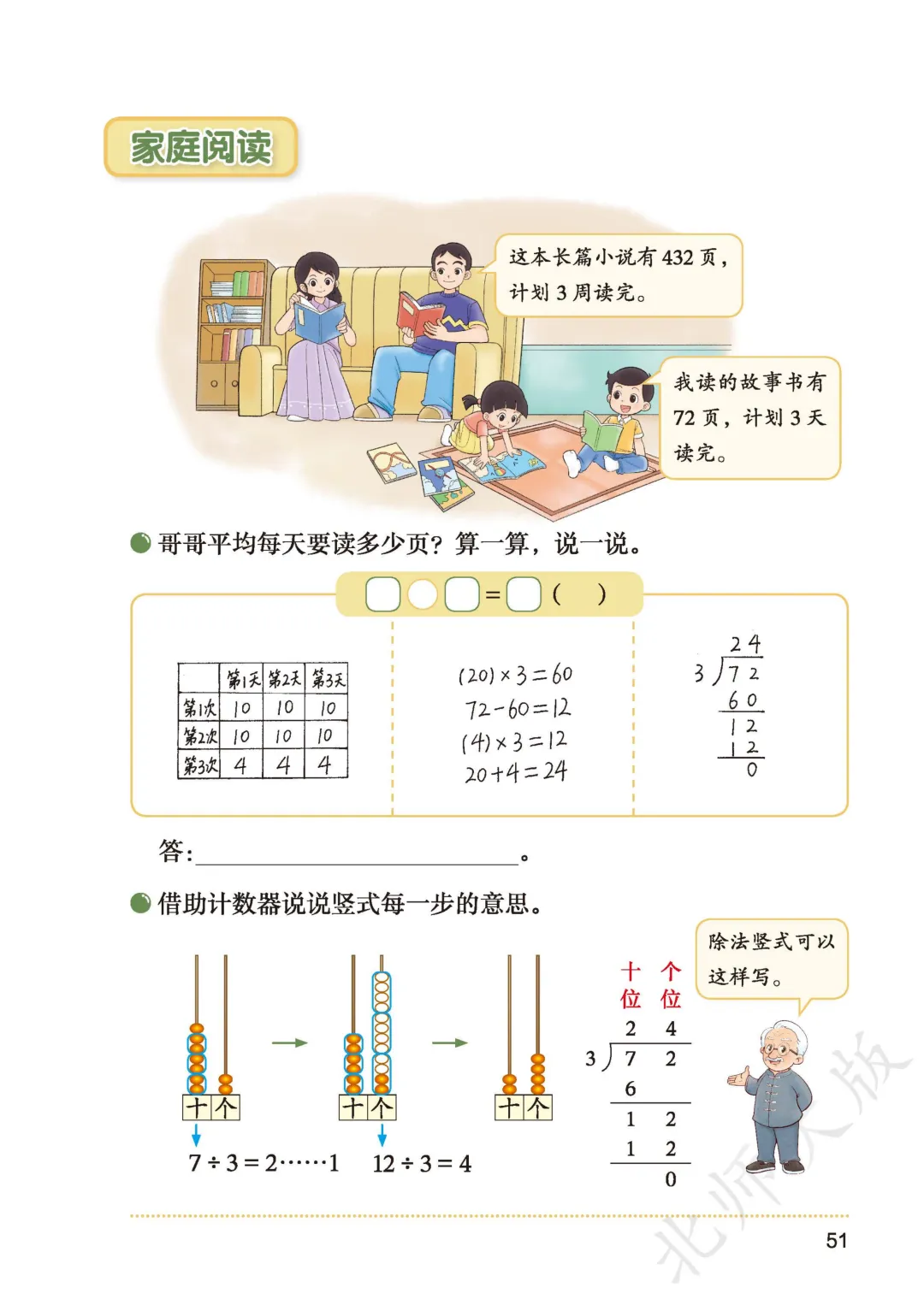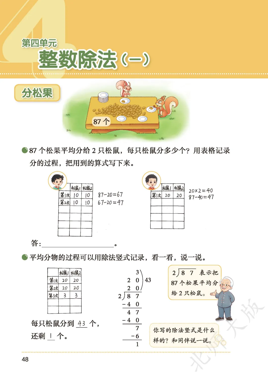 分松果、分幸运星、家庭阅读……这个单元我们学习除法。我们会用表格记录分的过程,学习用竖式计算除法,理解从高位算起的道理。我们会遇到“猴子的烦恼”——306个桃子平均分给3只猴子,每只分多少?原来商的中间有0!我们还会学习验算,确保计算正确。最后,我们要用除法解决生活中的问题,比如买新书、讲故事,看看怎样安排最合理。