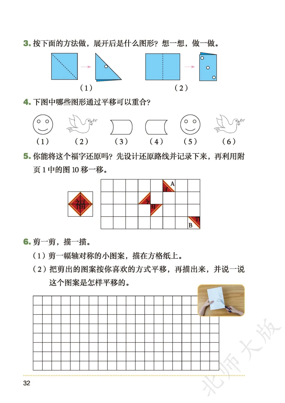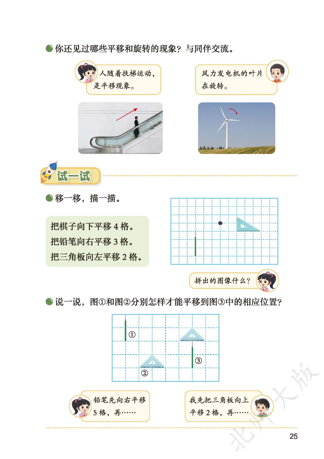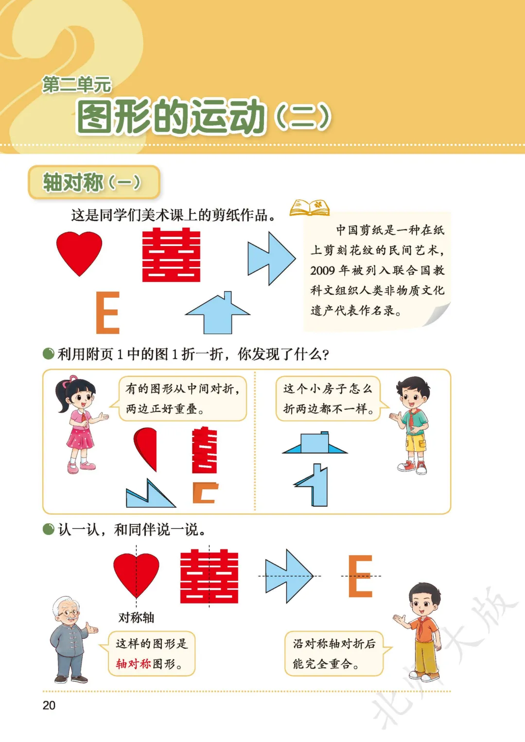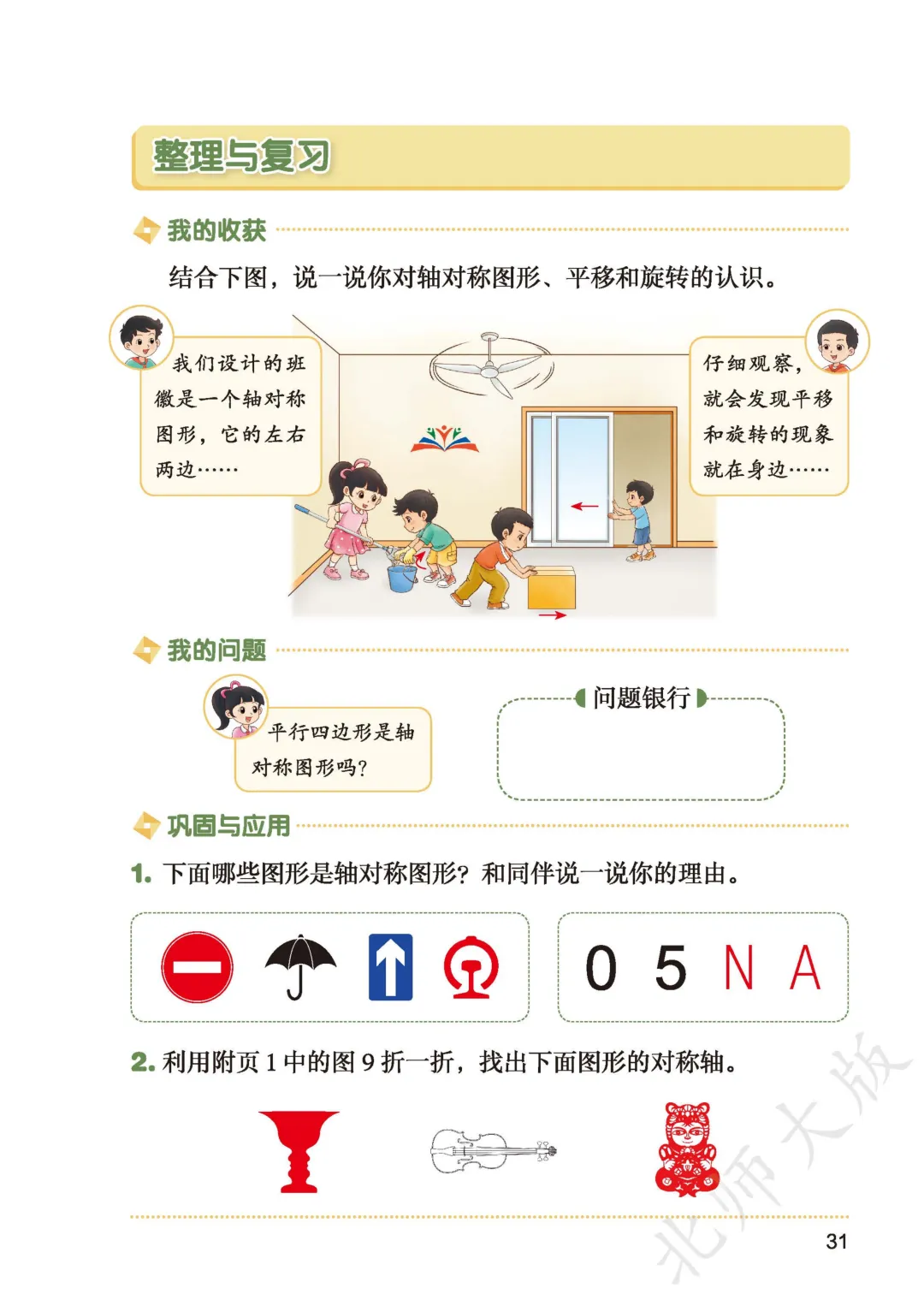 剪纸、折纸、拼图……这个单元我们动手又动脑!我们会认识轴对称图形,发现很多漂亮的图案都是对称的。我们还会研究平移和旋转,看看生活中的电梯、风车是怎么运动的。最有趣的是“能移回去吗”,我们要用平移的方法,把打乱的拼图恢复原状,还要记录移动的路线呢!最后,我们还要当“小小设计师”,为艺术节设计一个漂亮的徽标,把学到的图形知识都用上。