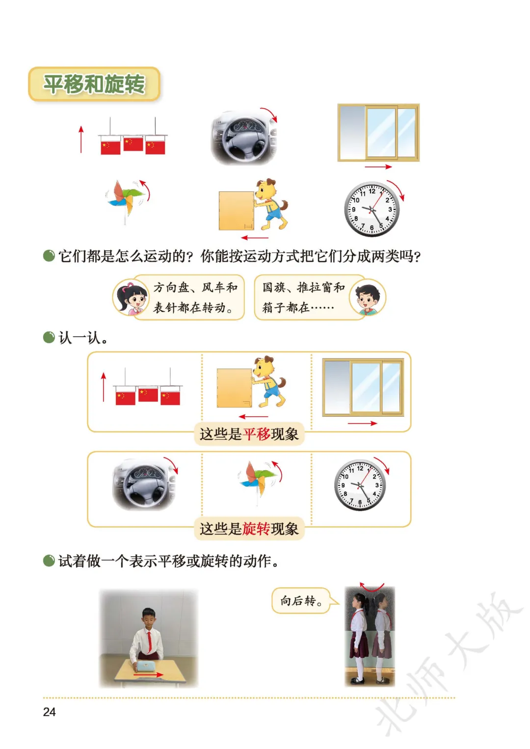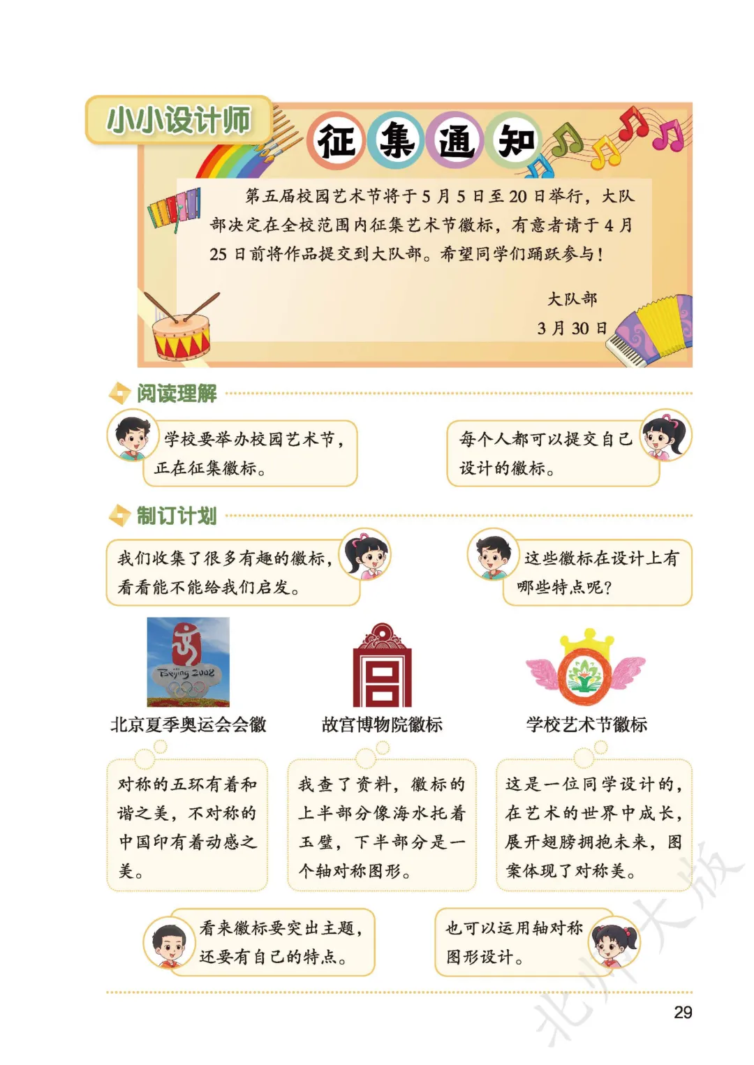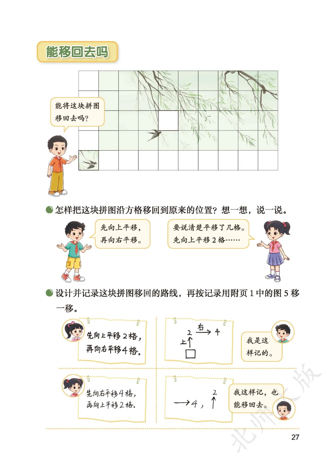 剪纸、折纸、拼图……这个单元我们动手又动脑!我们会认识轴对称图形,发现很多漂亮的图案都是对称的。我们还会研究平移和旋转,看看生活中的电梯、风车是怎么运动的。最有趣的是“能移回去吗”,我们要用平移的方法,把打乱的拼图恢复原状,还要记录移动的路线呢!最后,我们还要当“小小设计师”,为艺术节设计一个漂亮的徽标,把学到的图形知识都用上。