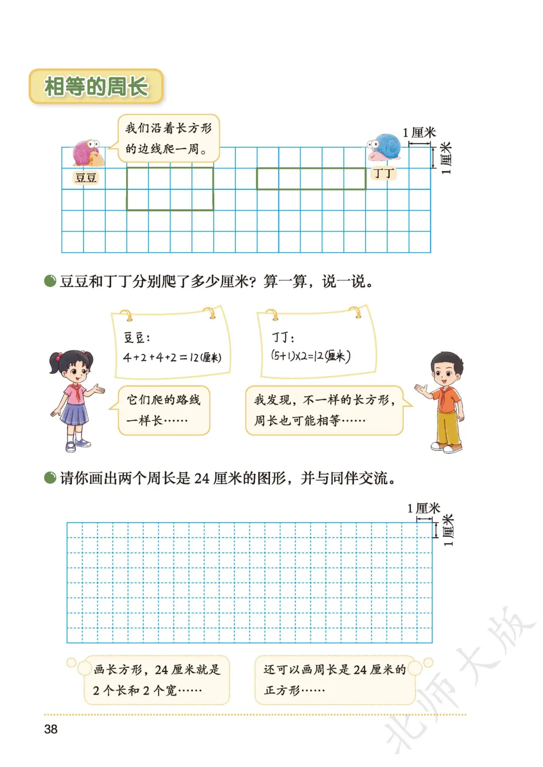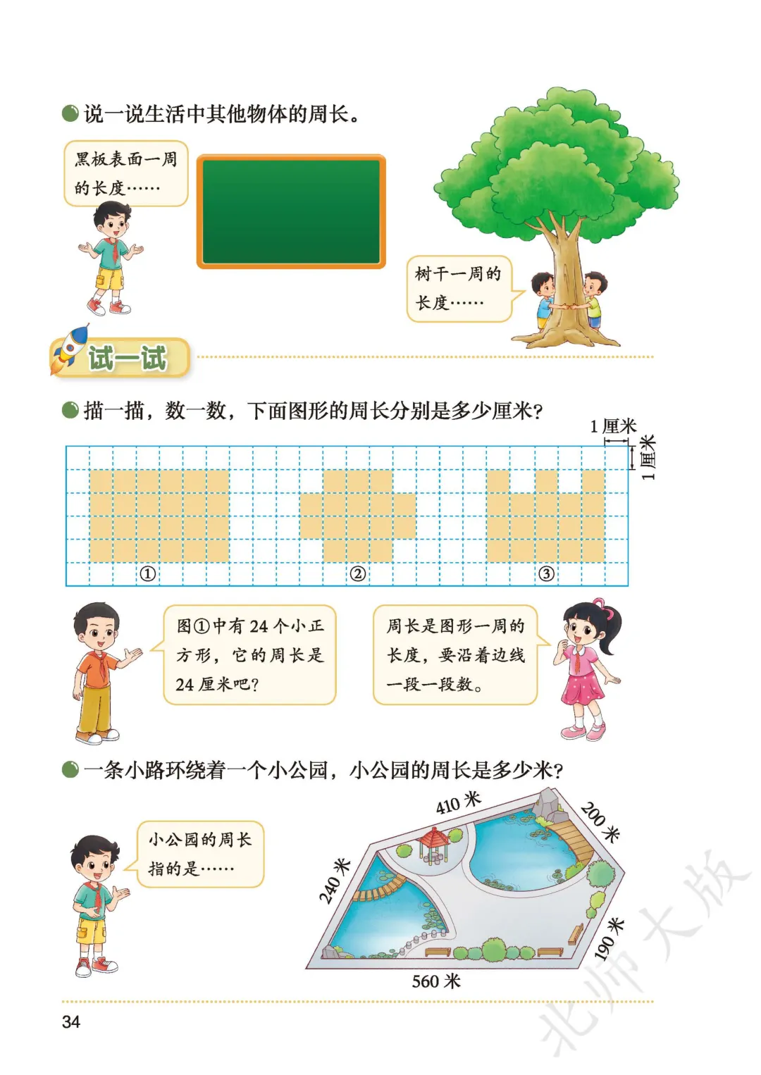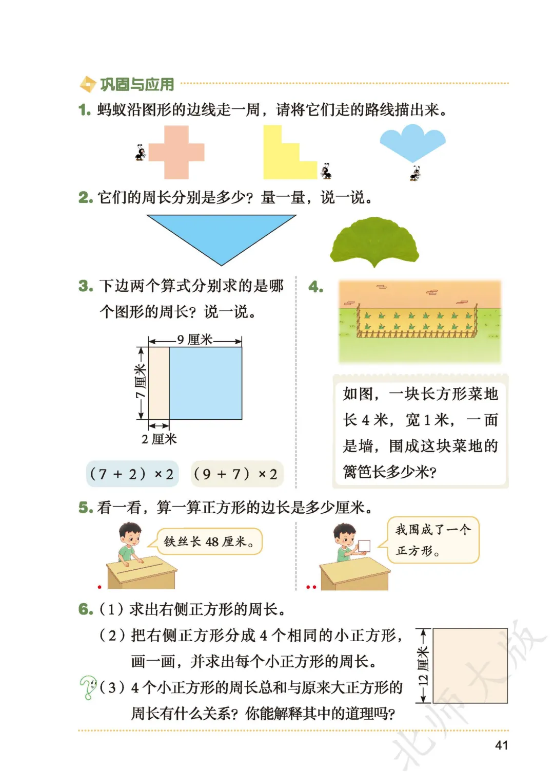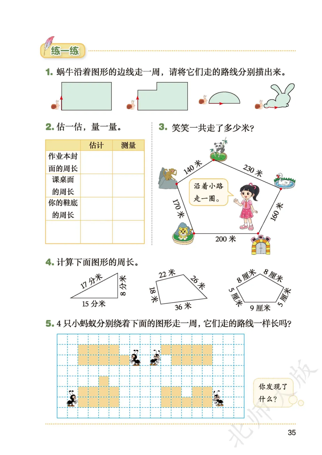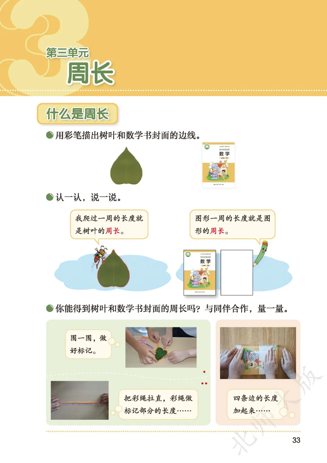 蚂蚁爬树叶、蜗牛走一周,它们走的路程就是图形的周长。这个单元,我们会用绳子、尺子去测量树叶、书本封面的周长,还会学习计算长方形和正方形的周长。你还会发现,形状不一样的图形,周长可能相等哦!生活中很多地方都要用到周长,比如给菜园围篱笆、给照片镶边框,你都能算出需要多长的材料。
