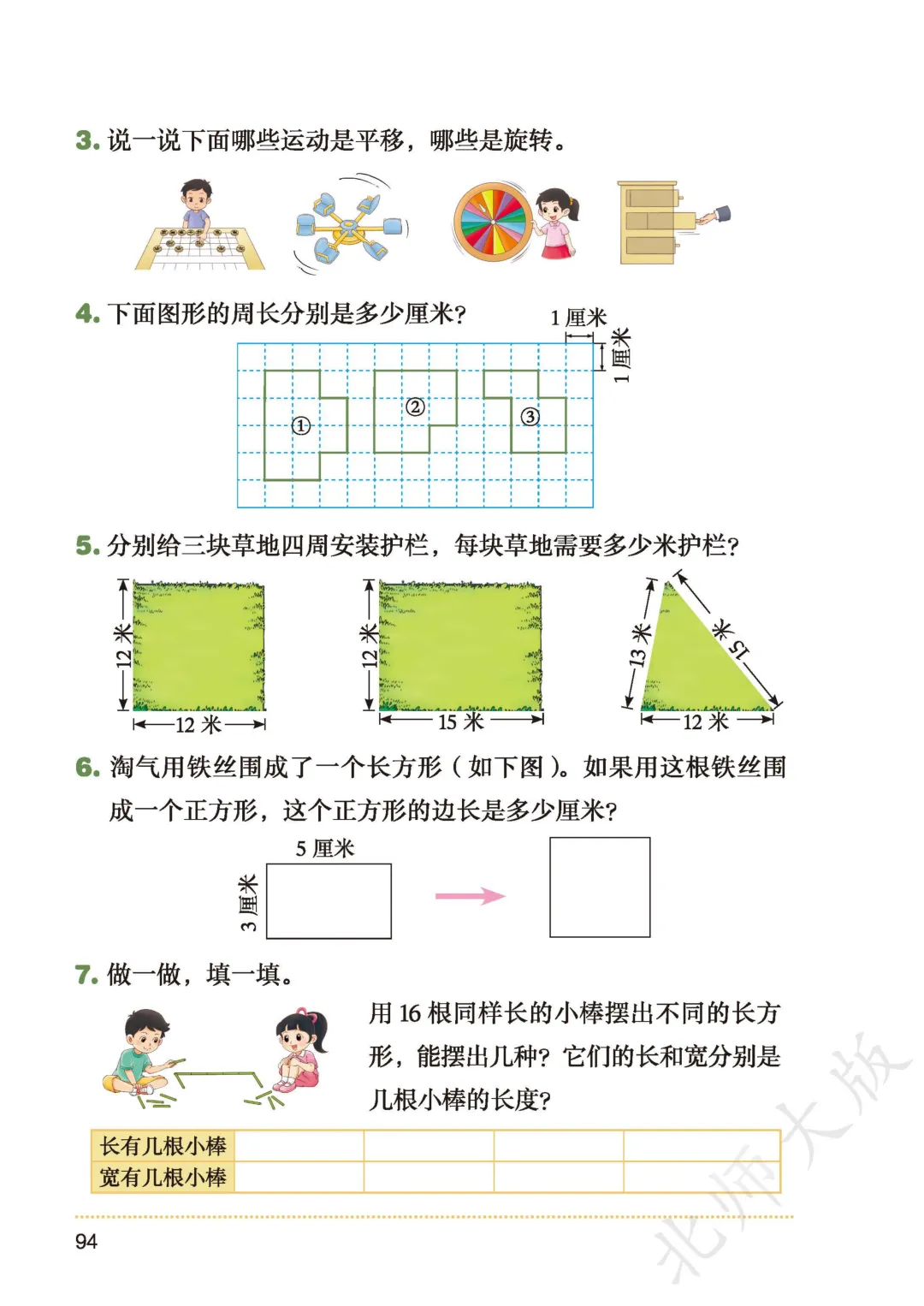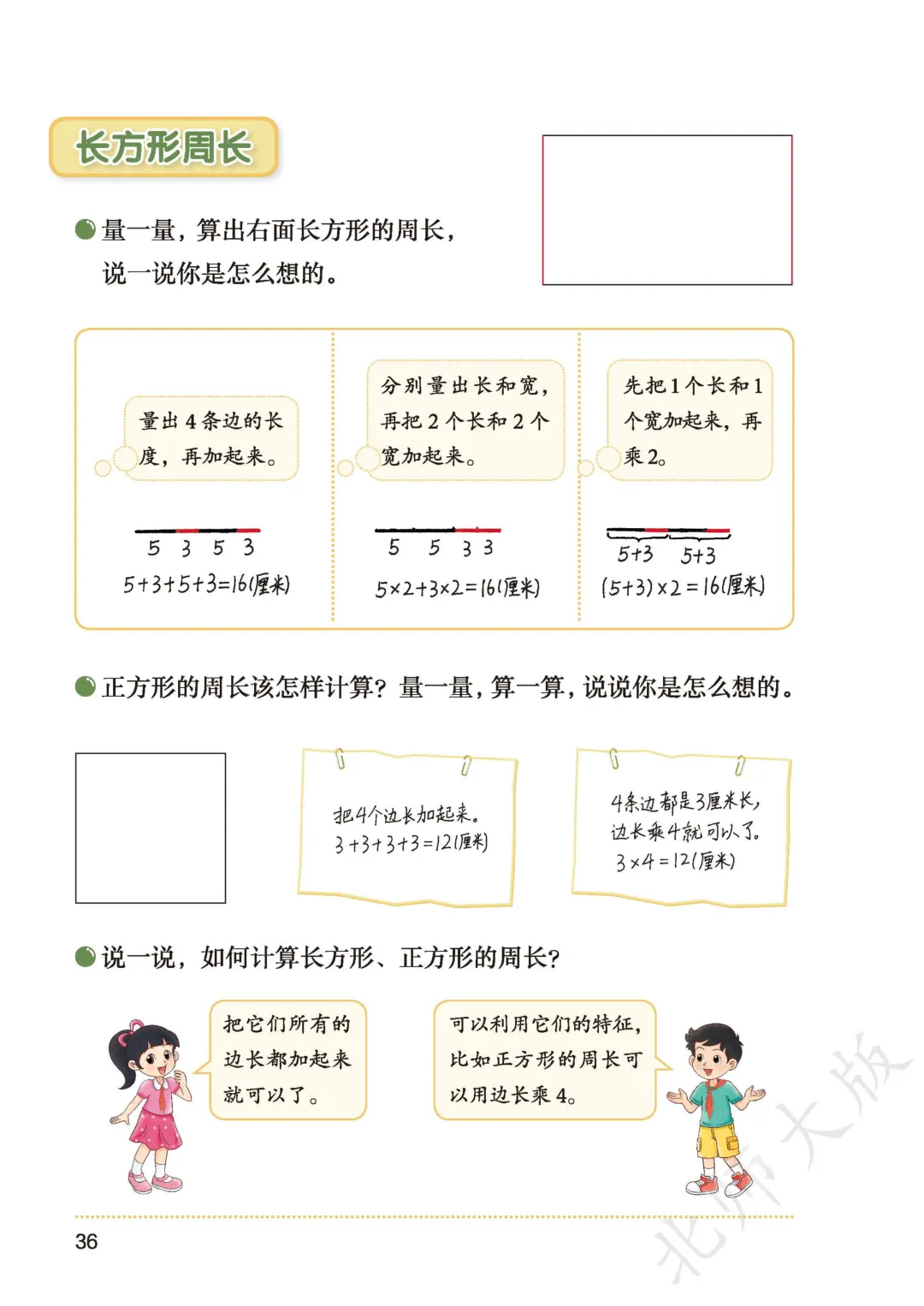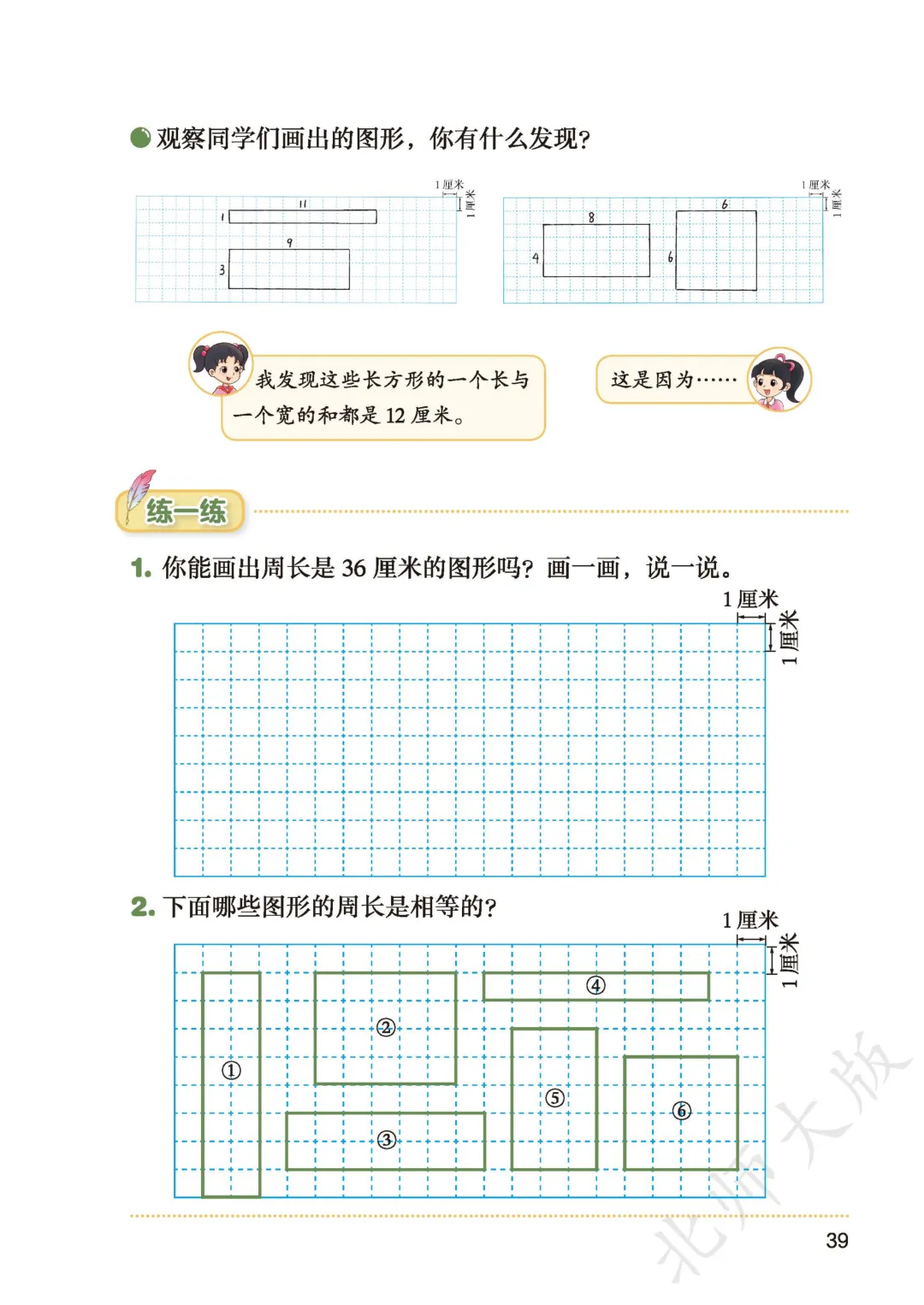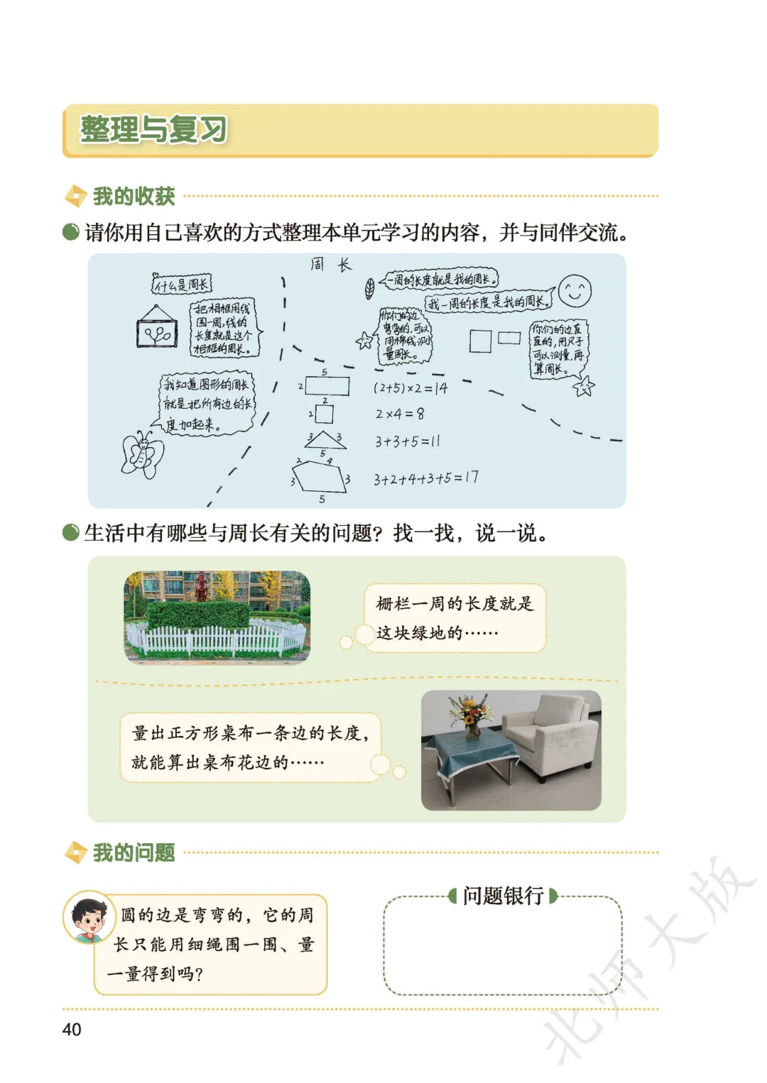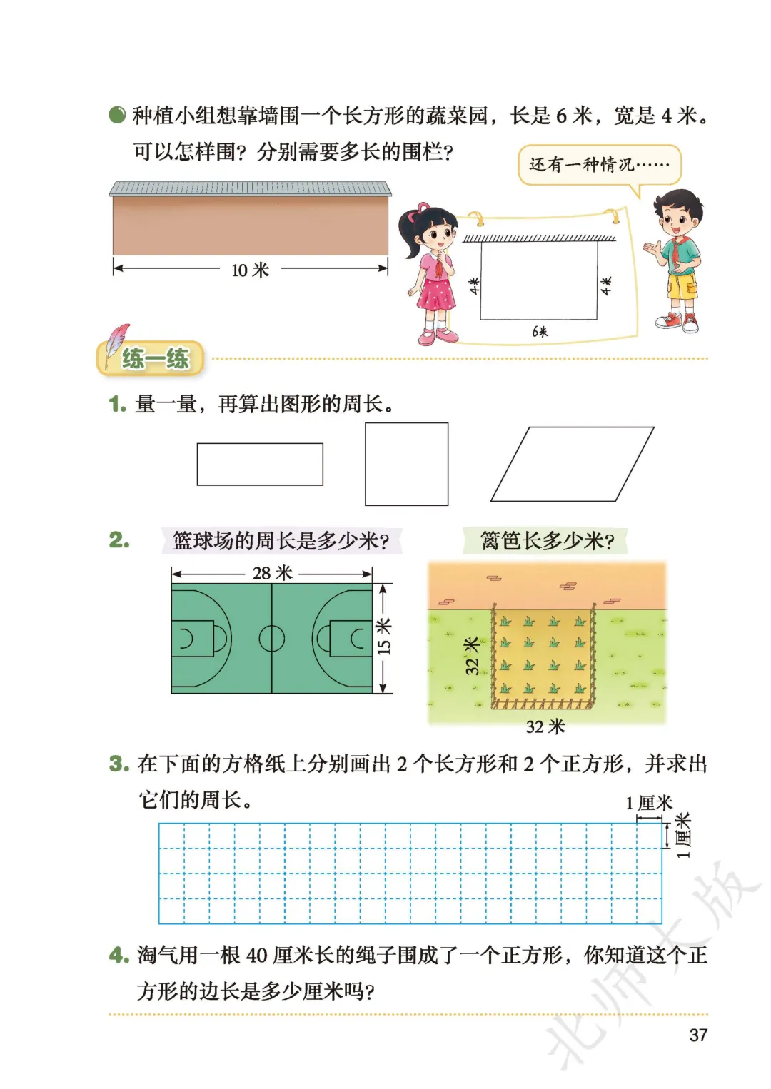 蚂蚁爬树叶、蜗牛走一周,它们走的路程就是图形的周长。这个单元,我们会用绳子、尺子去测量树叶、书本封面的周长,还会学习计算长方形和正方形的周长。你还会发现,形状不一样的图形,周长可能相等哦!生活中很多地方都要用到周长,比如给菜园围篱笆、给照片镶边框,你都能算出需要多长的材料。