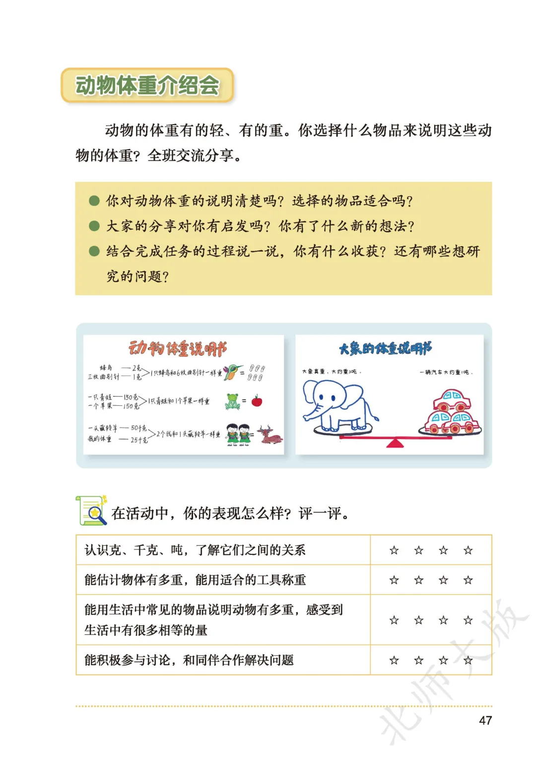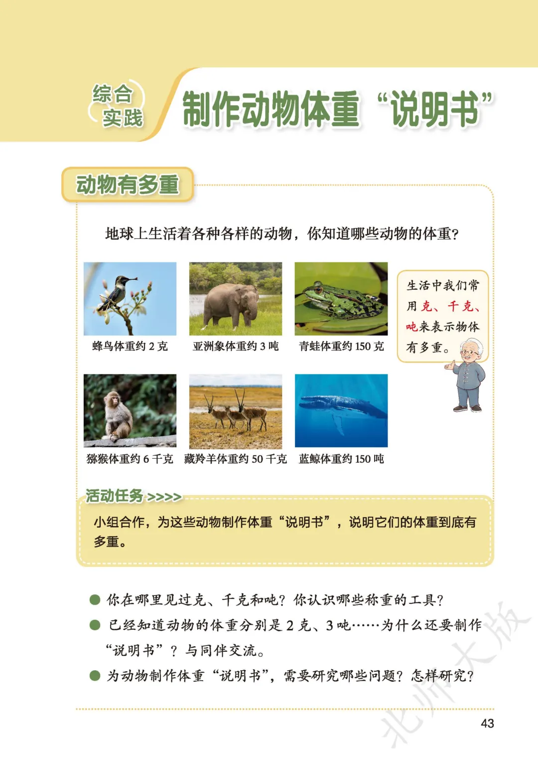 你知道吗?蜂鸟只有2克重,蓝鲸却有150吨重!“克”“千克”“吨”到底有多重?在这个主题活动中,我们将像科学家一样研究。我们会掂一掂1克的物品,抱一抱1千克的大米,推算1吨有多重。然后,我们要用生活中熟悉的物品(比如瓜子、苹果、小朋友的体重)来为这些动物制作一份体重“说明书”,让所有人都能感受到它们到底有多重。我们还会听“曹冲称象”的故事,自己动手做实验,体验古人的智慧。