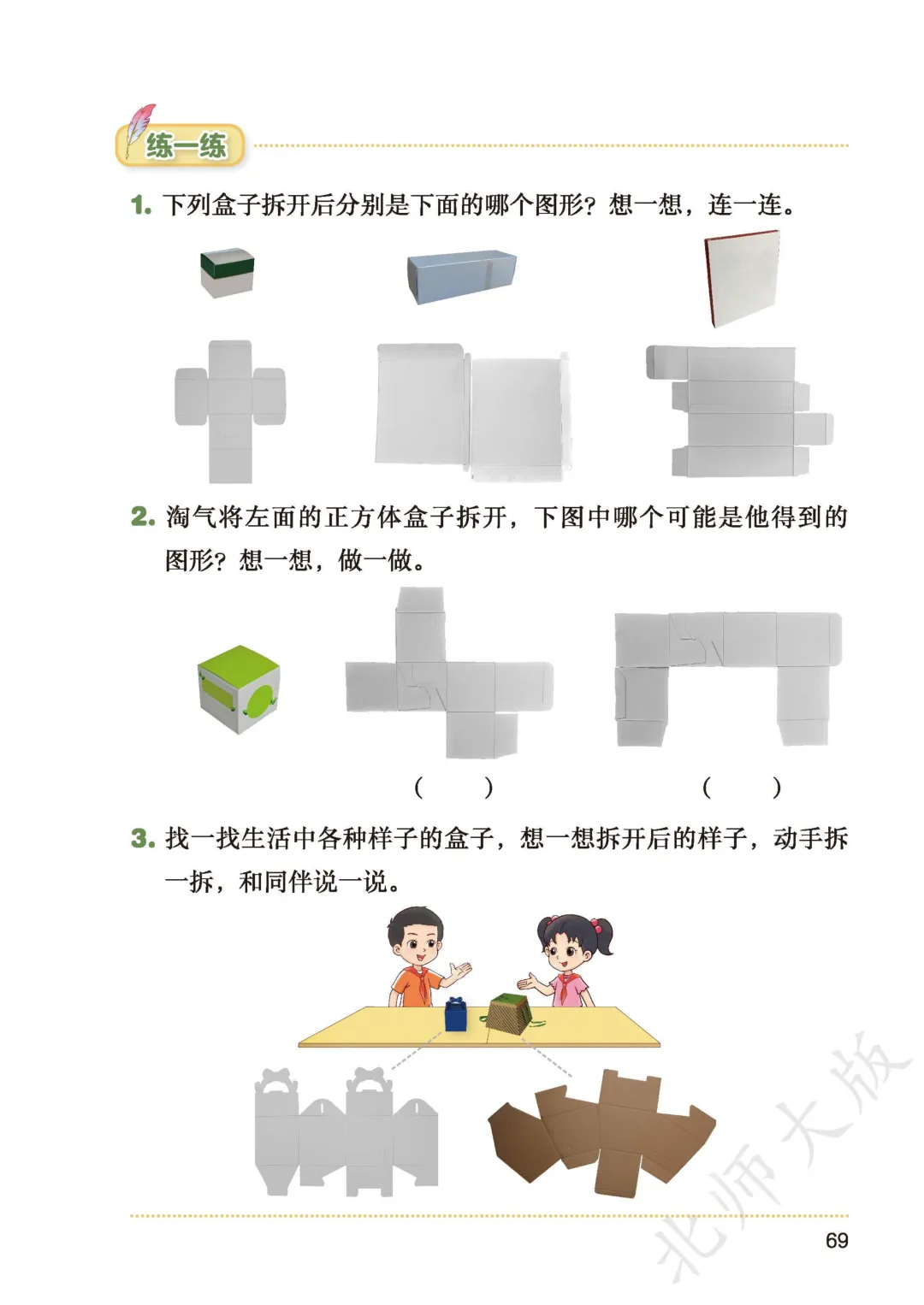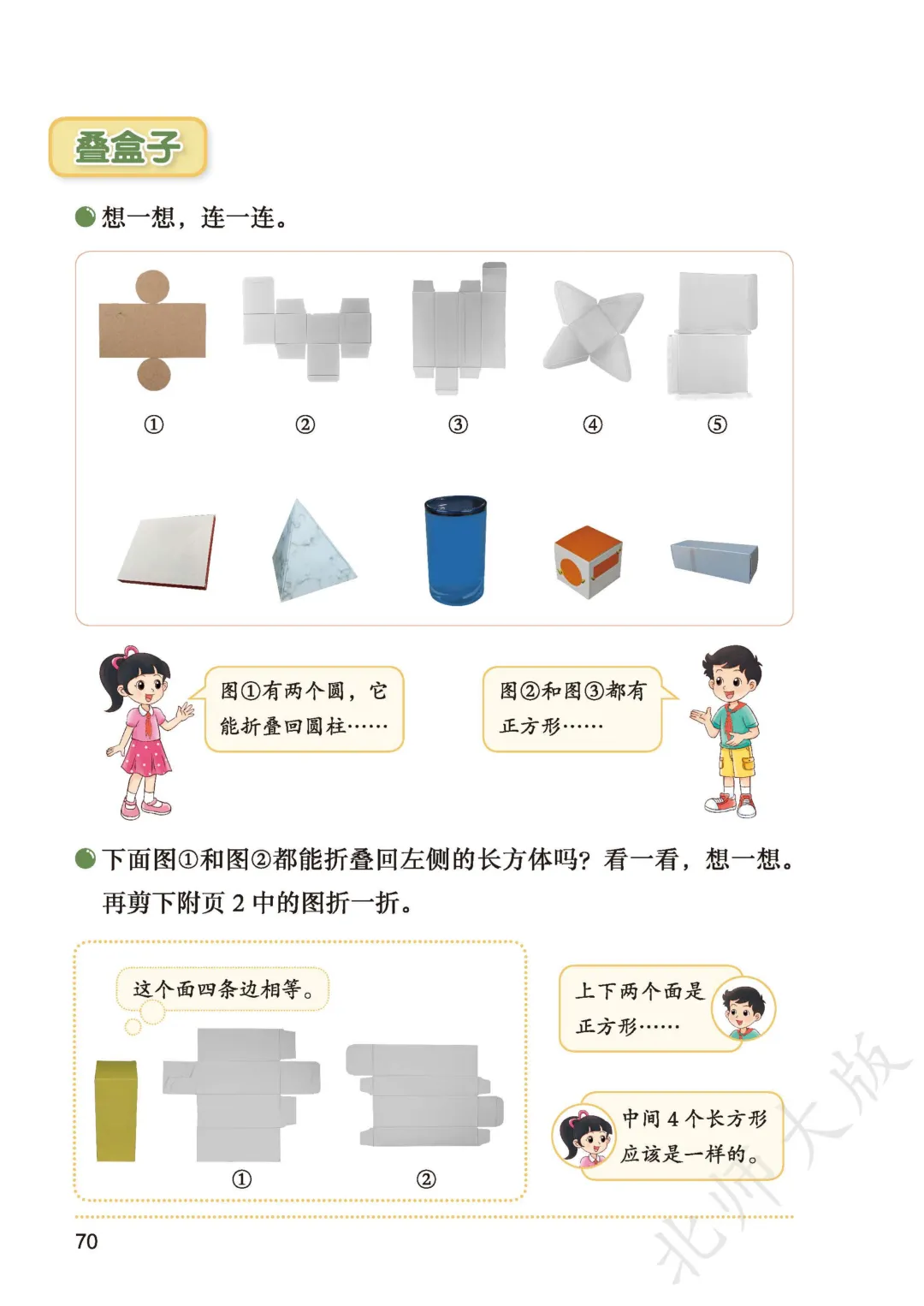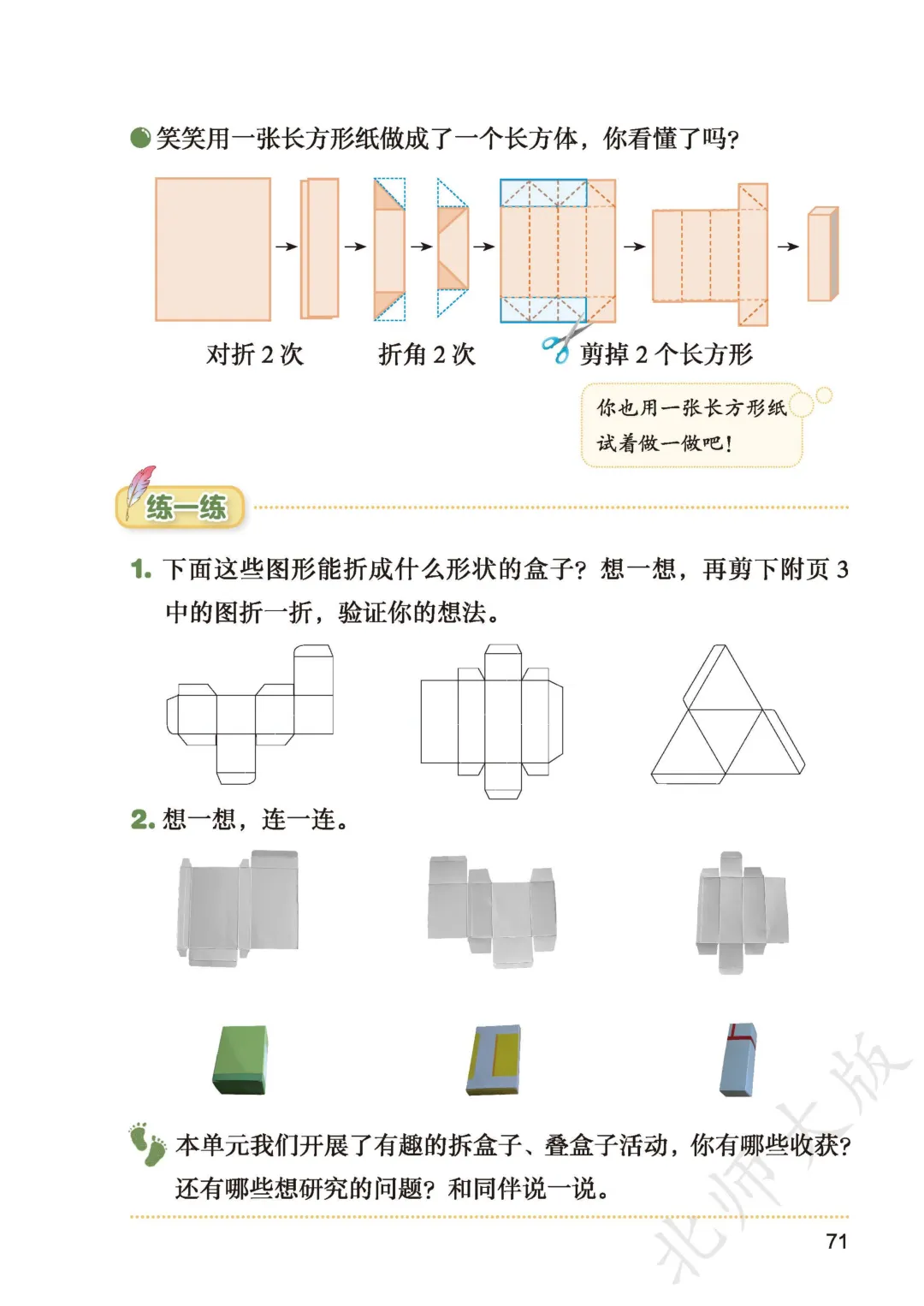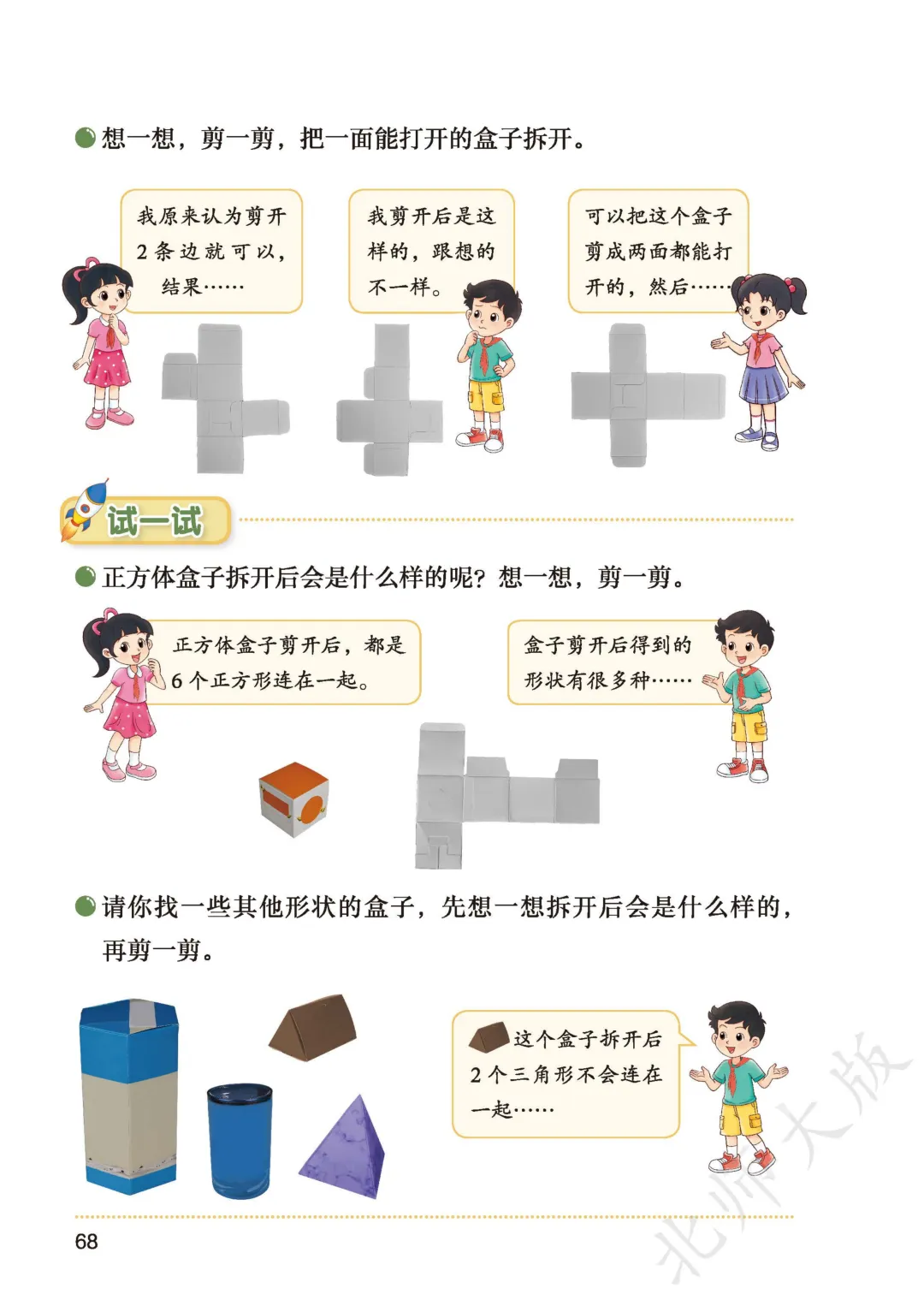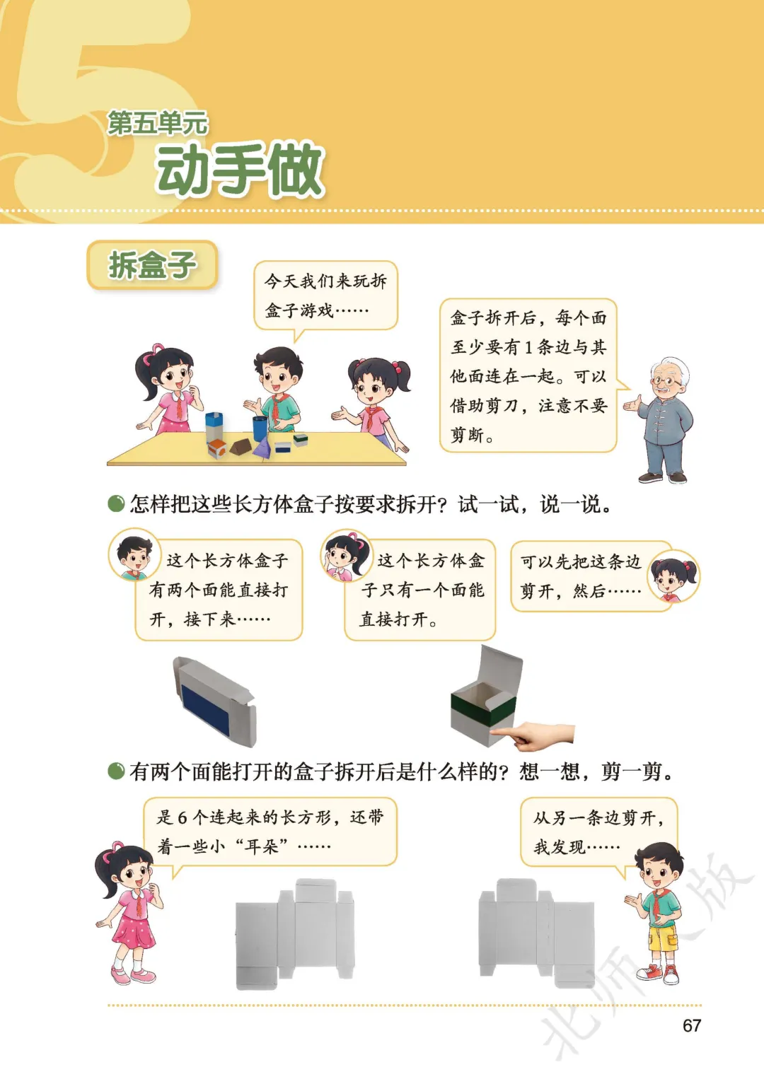 你有没有想过,一个长方体盒子拆开后是什么样子?这个单元,我们就来当“拆盒专家”。我们会把各种盒子拆开,观察它们的展开图,再尝试把展开图重新叠成盒子。你会发现,同一个盒子可能有不同的展开方式。这个活动能大大锻炼我们的空间想象力,以后看图纸、搭积木都难不倒你!