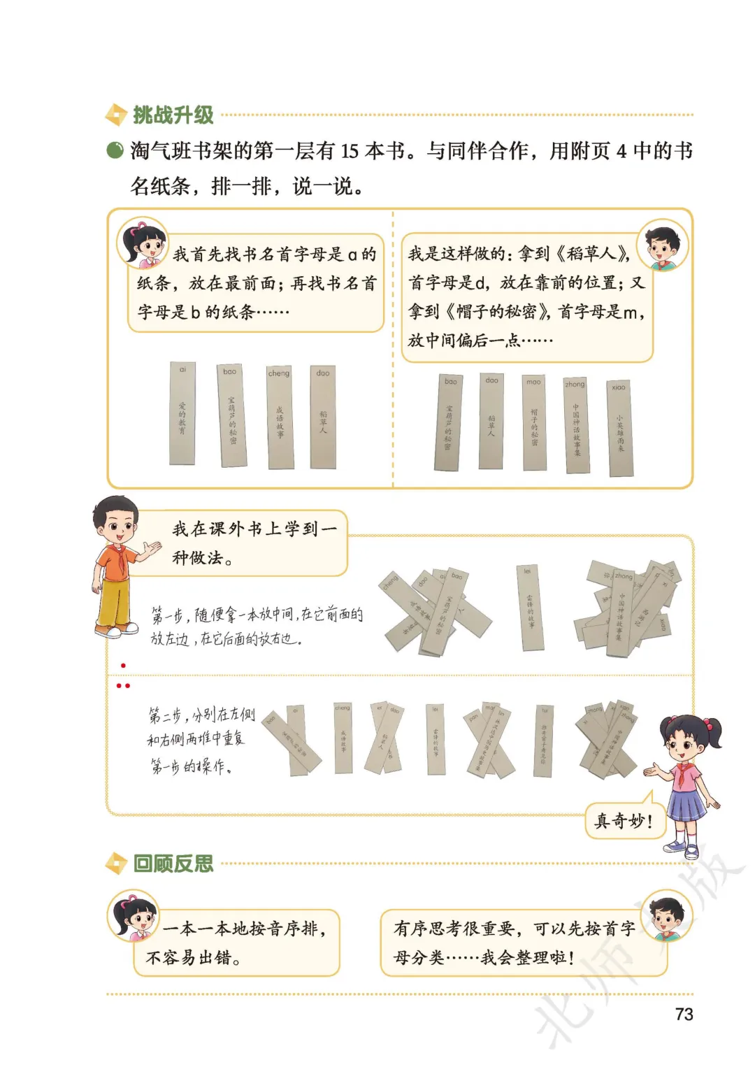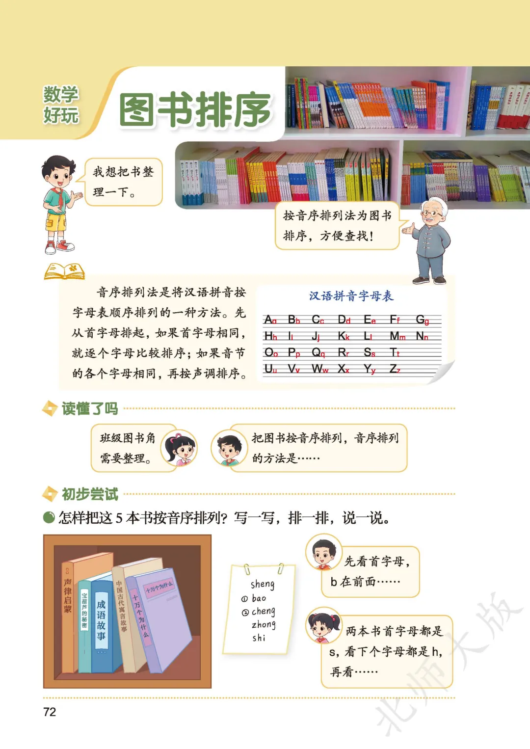 家里的书架上有很多书,怎么才能快速找到想要的那一本?这个单元,我们学习一种给图书排序的方法——音序排列法。我们会用这种方法给几本书排序,然后挑战给15本书排序。在这个过程中,你会学到有序思考的重要性,以后整理自己的书架、玩具也会更有条理。