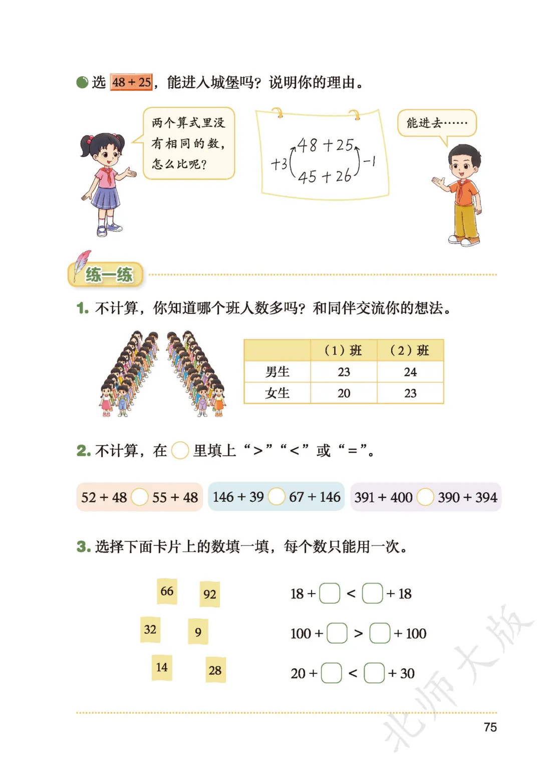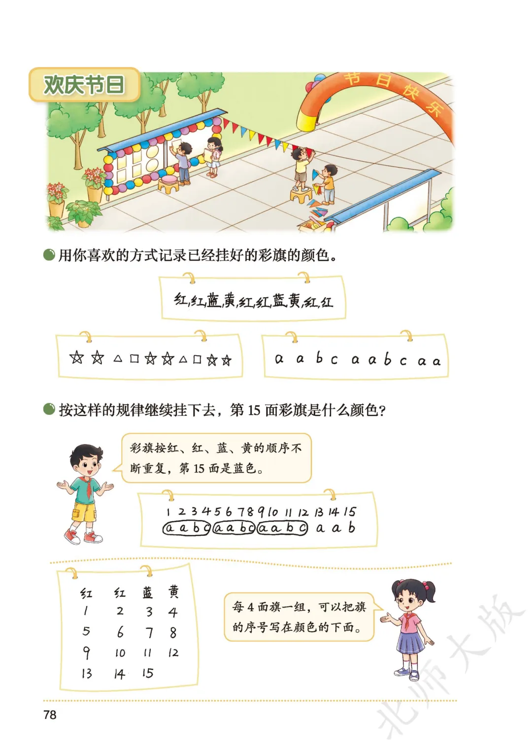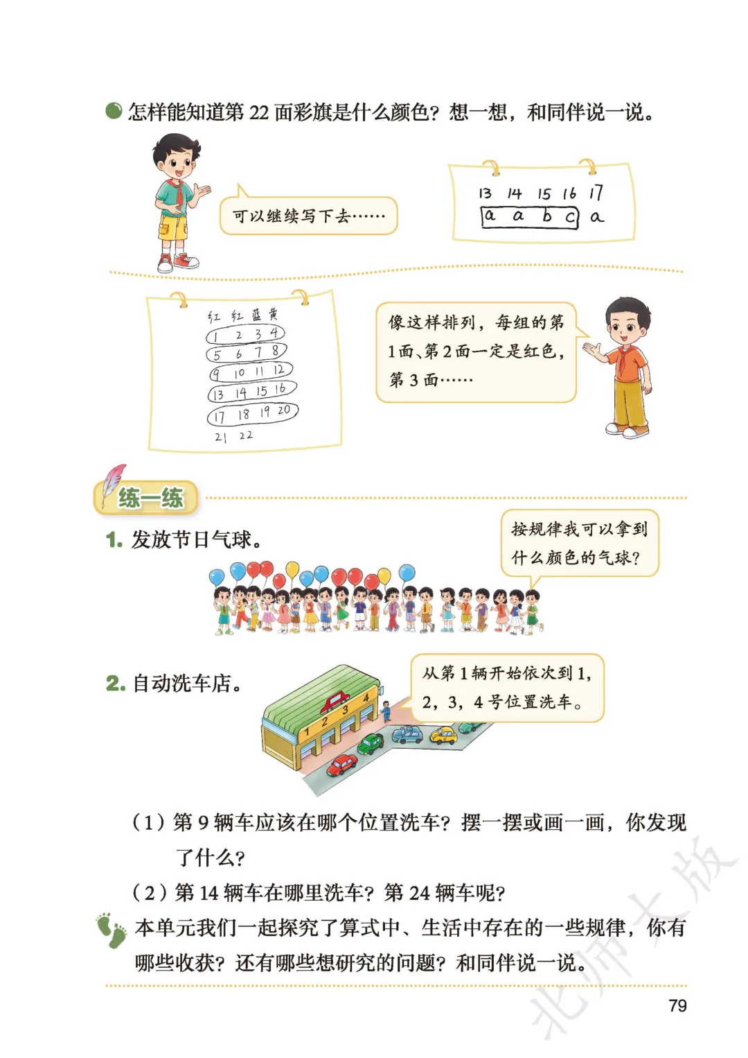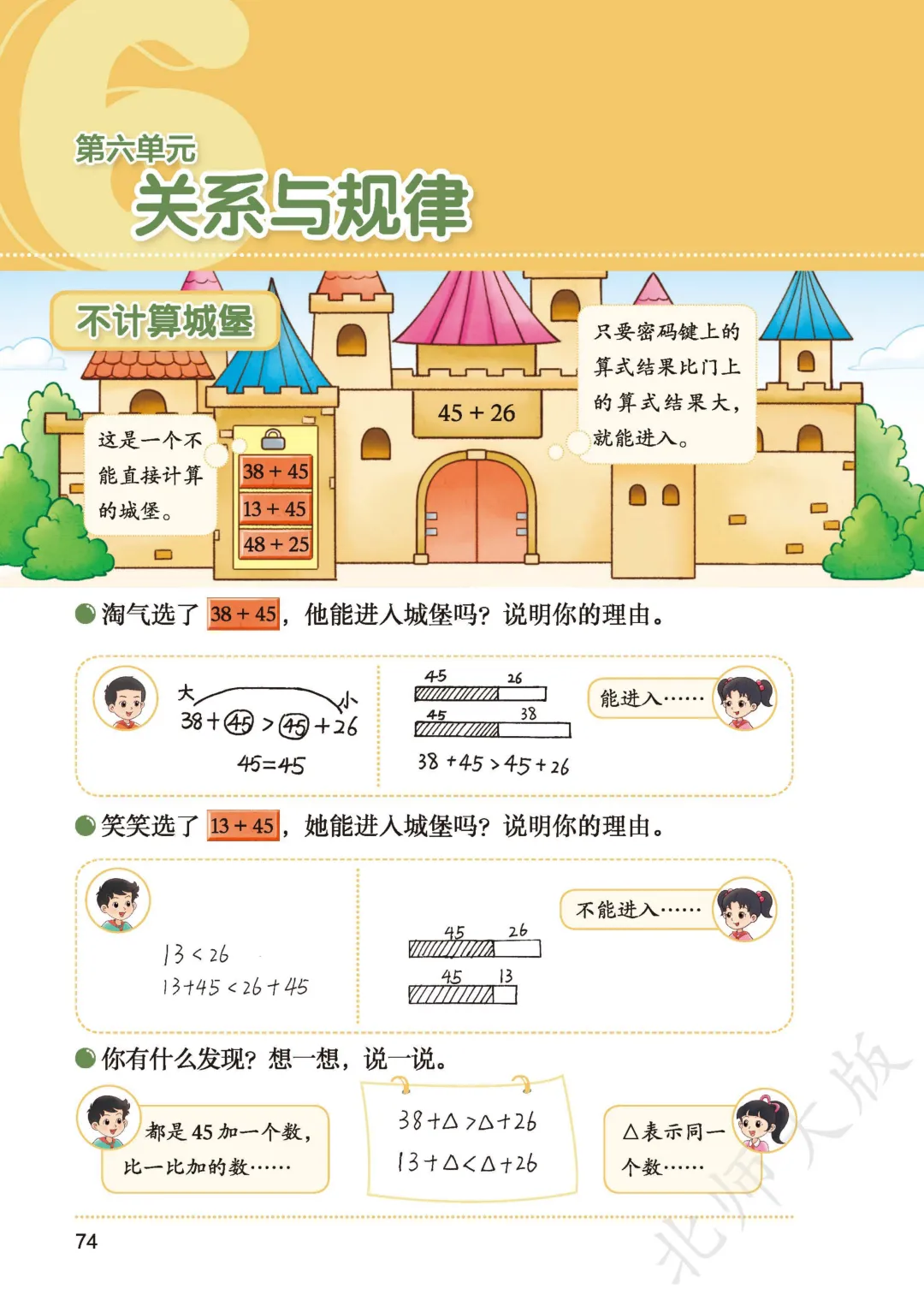 不计算,你能判断谁进“城堡”吗?这个单元,我们探索算式中的规律和生活中的规律。比如,不计算比较两个加法算式的大小,我们会发现其中的奥秘。我们还会研究彩旗的颜色排列,用除法找到第15面、第22面旗是什么颜色。数学就像侦探游戏,等着我们去发现规律!