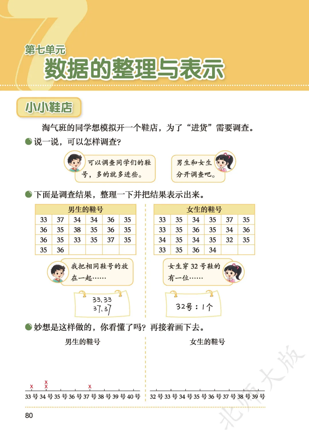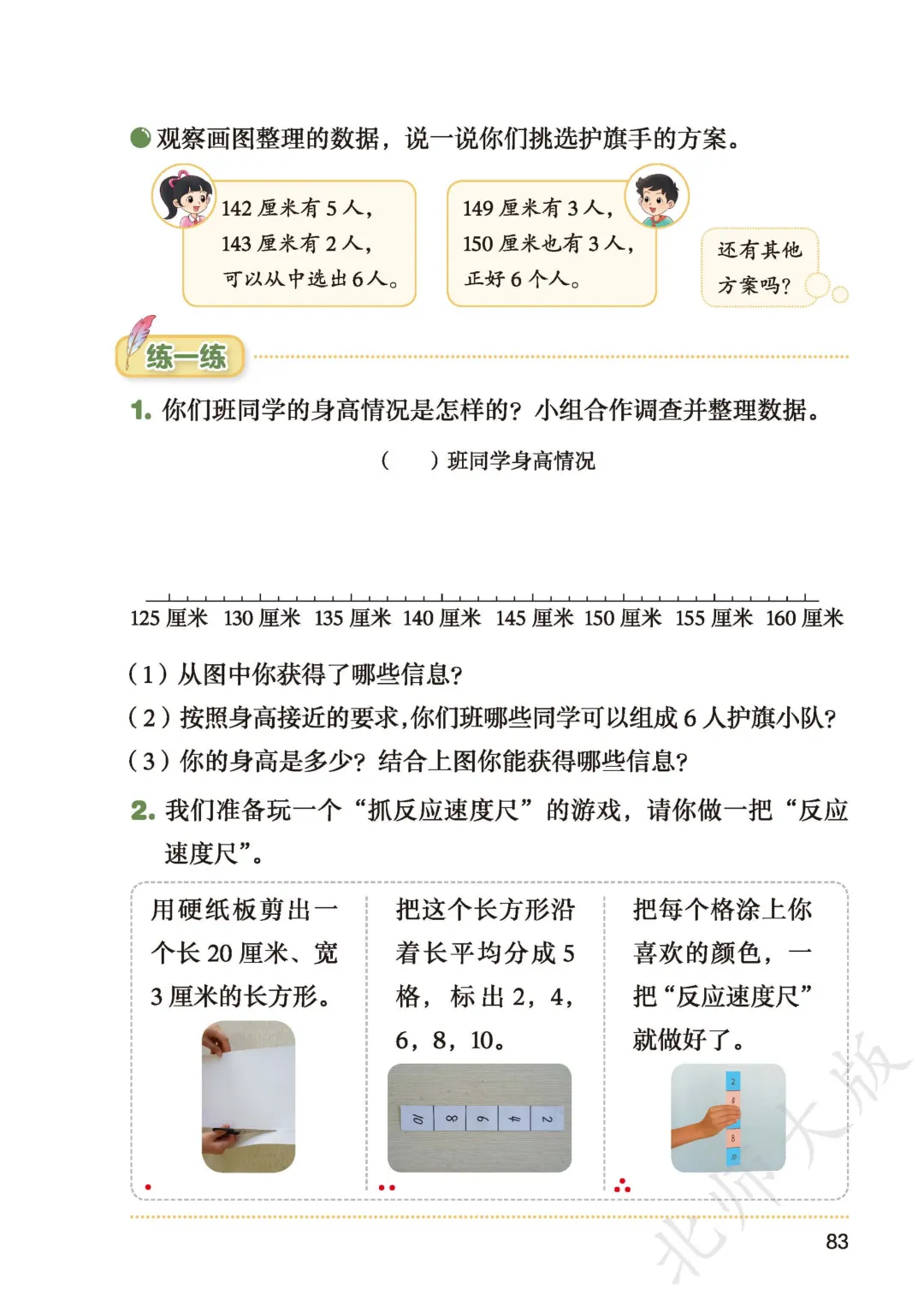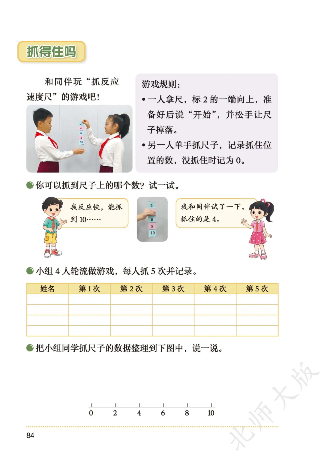 开一个鞋店,要知道进什么鞋号;挑选护旗手,要选出身高接近的同学。这些都离不开数据。这个单元,我们学习如何调查、整理数据,并用画图的方式表示出来。我们还会玩“抓反应速度尺”的游戏,记录自己的反应速度,看看数据告诉我们什么。学会用数据说话,你会变得更理性、更有说服力!