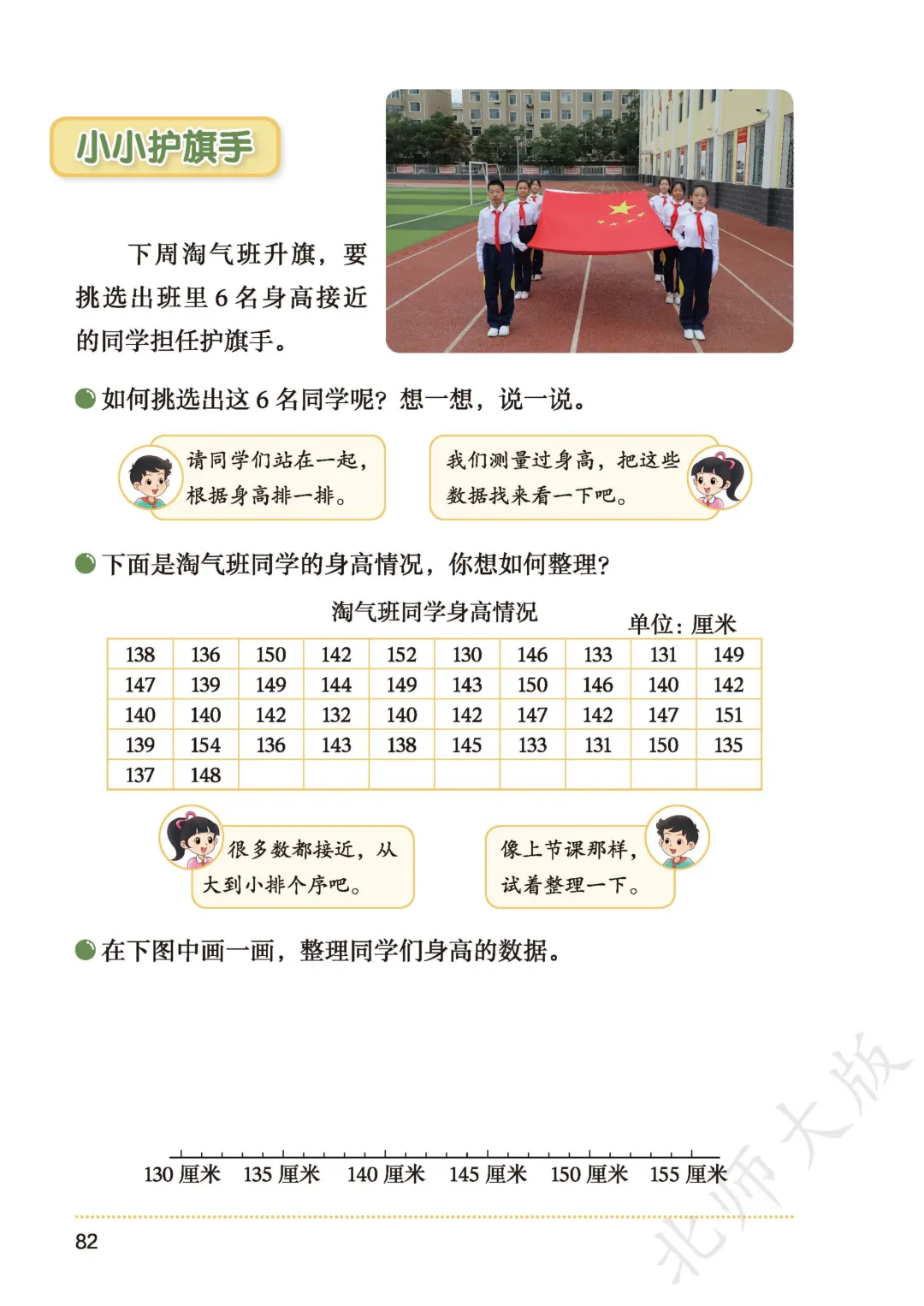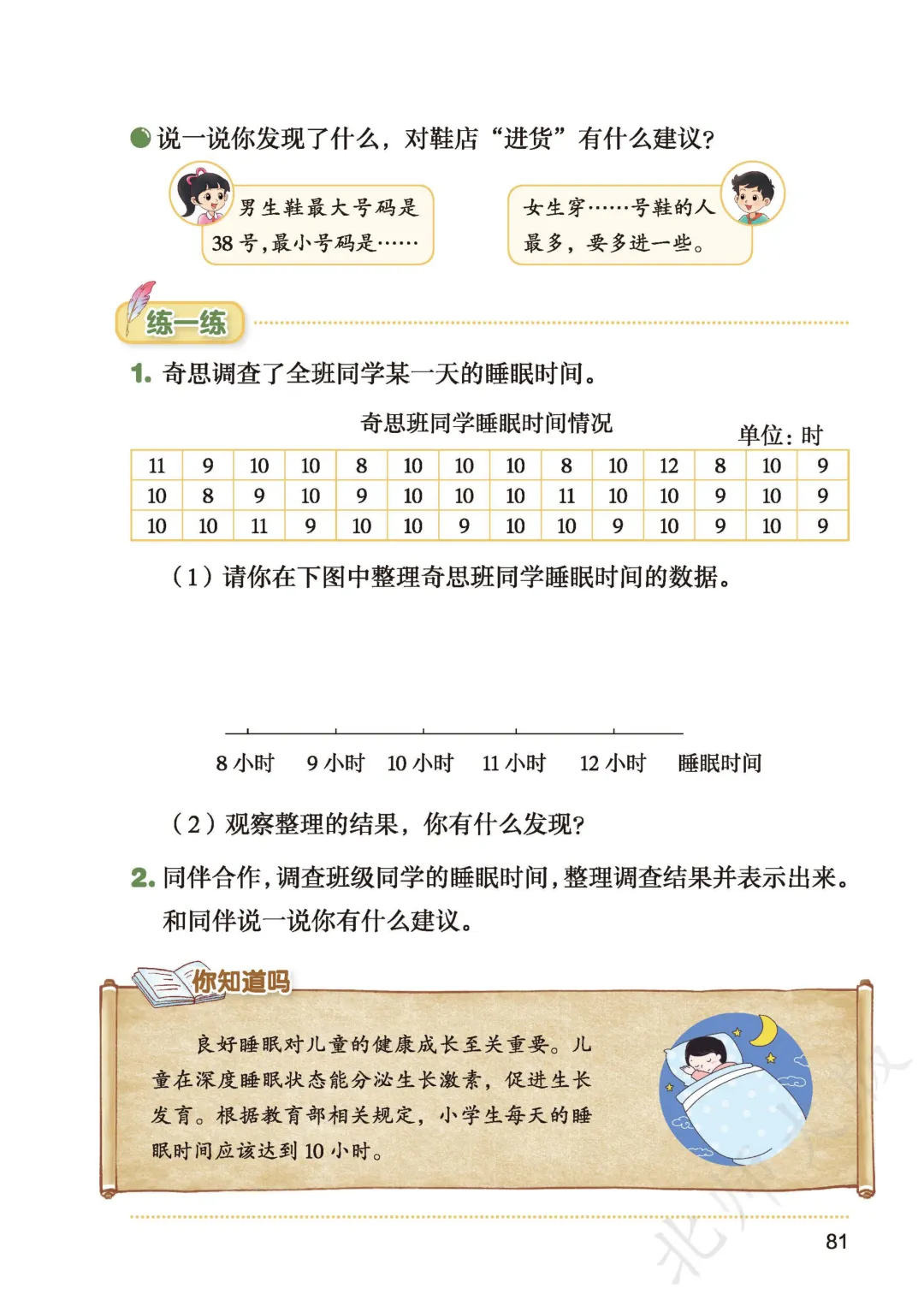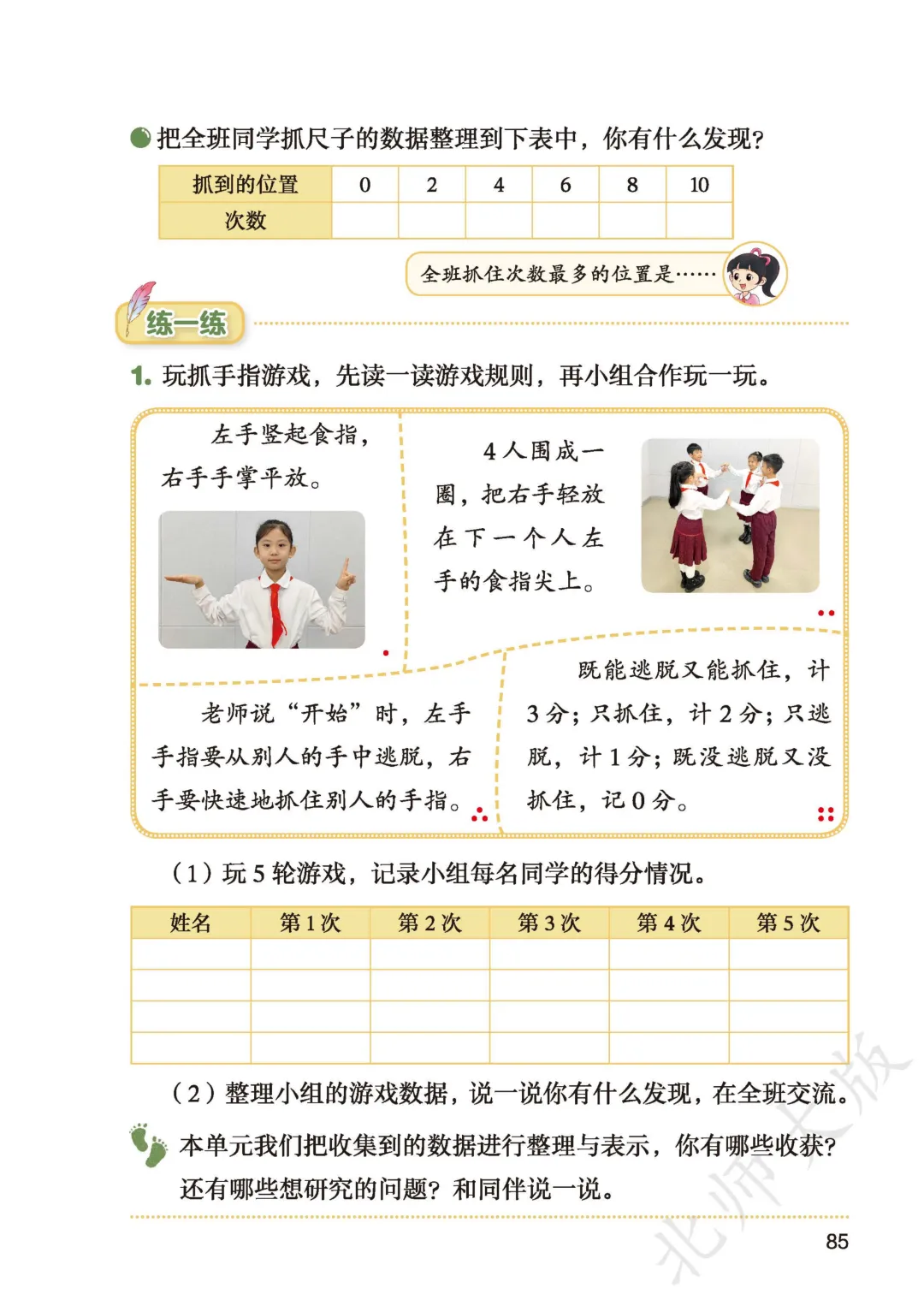 开一个鞋店,要知道进什么鞋号;挑选护旗手,要选出身高接近的同学。这些都离不开数据。这个单元,我们学习如何调查、整理数据,并用画图的方式表示出来。我们还会玩“抓反应速度尺”的游戏,记录自己的反应速度,看看数据告诉我们什么。学会用数据说话,你会变得更理性、更有说服力!