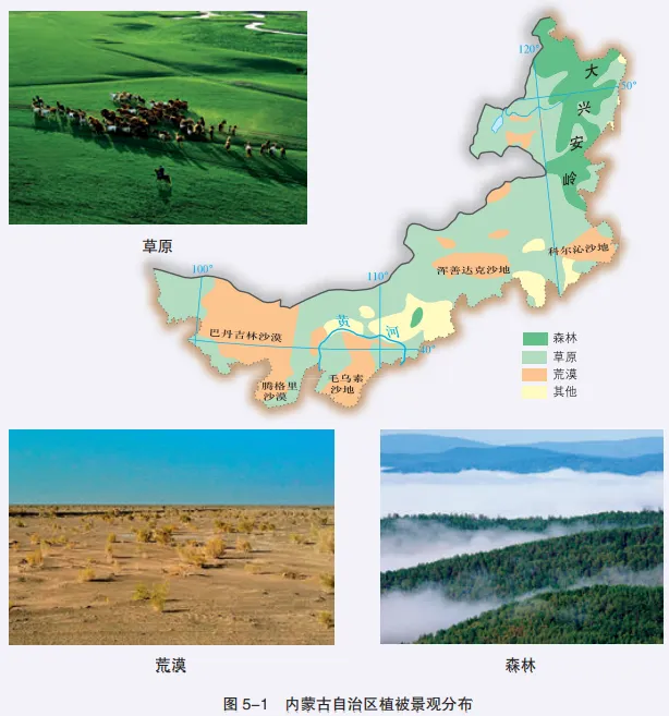 内蒙古自治区地处我国北部,东西横跨经度约29°,自治区东部大兴安岭山地森林茂盛,中部分布有大面积的肥美草原,西部则是一望无际的荒漠。