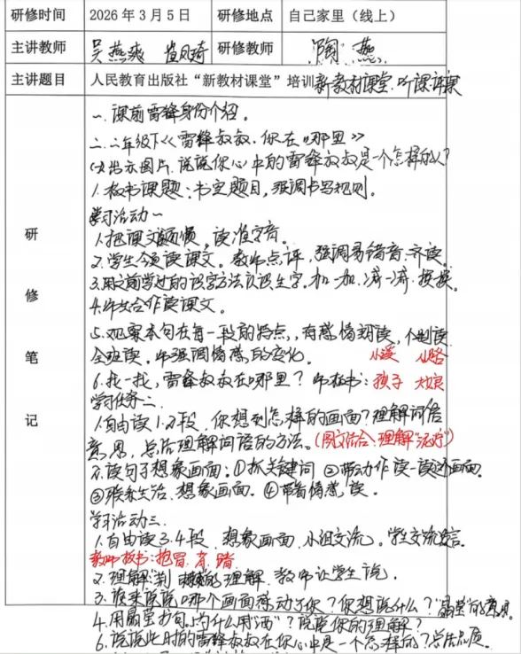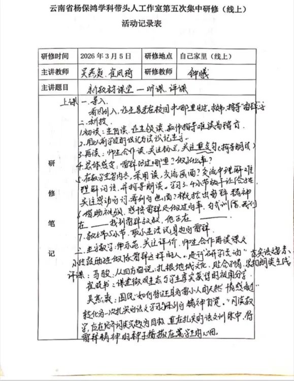 以文化人、以德润心。为深入落实新课标理念,精准把握统编新教材教学要求,云南省杨保鸿小学语文学科带头人工作室于2026年3月5日19:30共赴语文教学与立德树人的美好之约,组织全体工作室成员和学员参加了人民教育出版社主办的“新教材讲堂”网络培训,开展了“新教材·新课堂·新德育”为主题线上课堂教学研修活动,认真聆听了辽宁省吴燕爽老师的示范课——《雷锋叔叔,你在哪里》,共研共进,共同感悟文学阅读与德育渗透融的深度与温度。