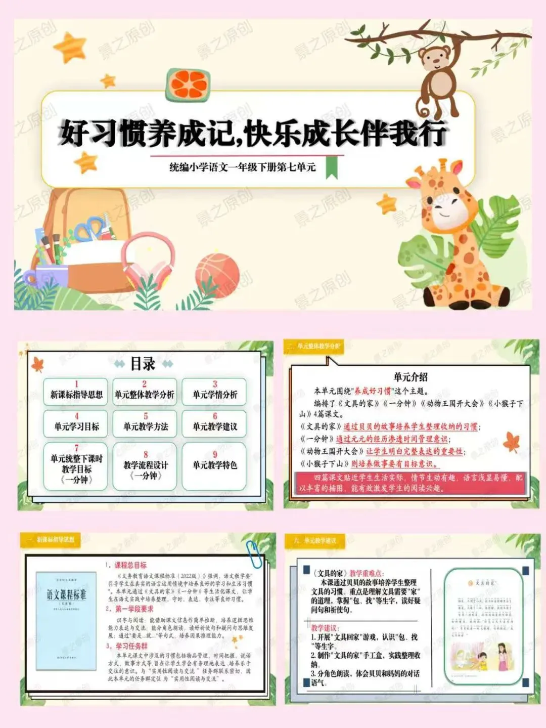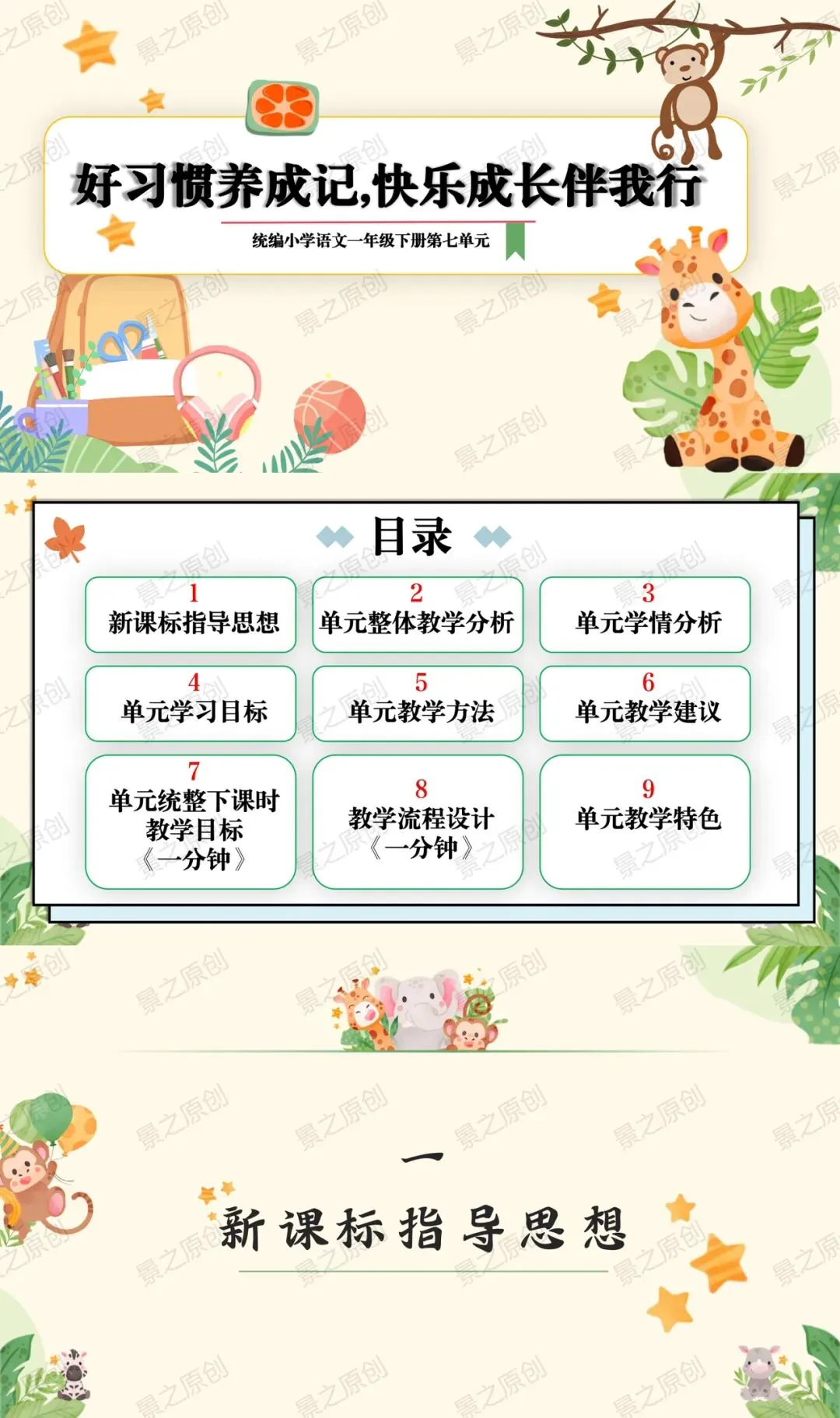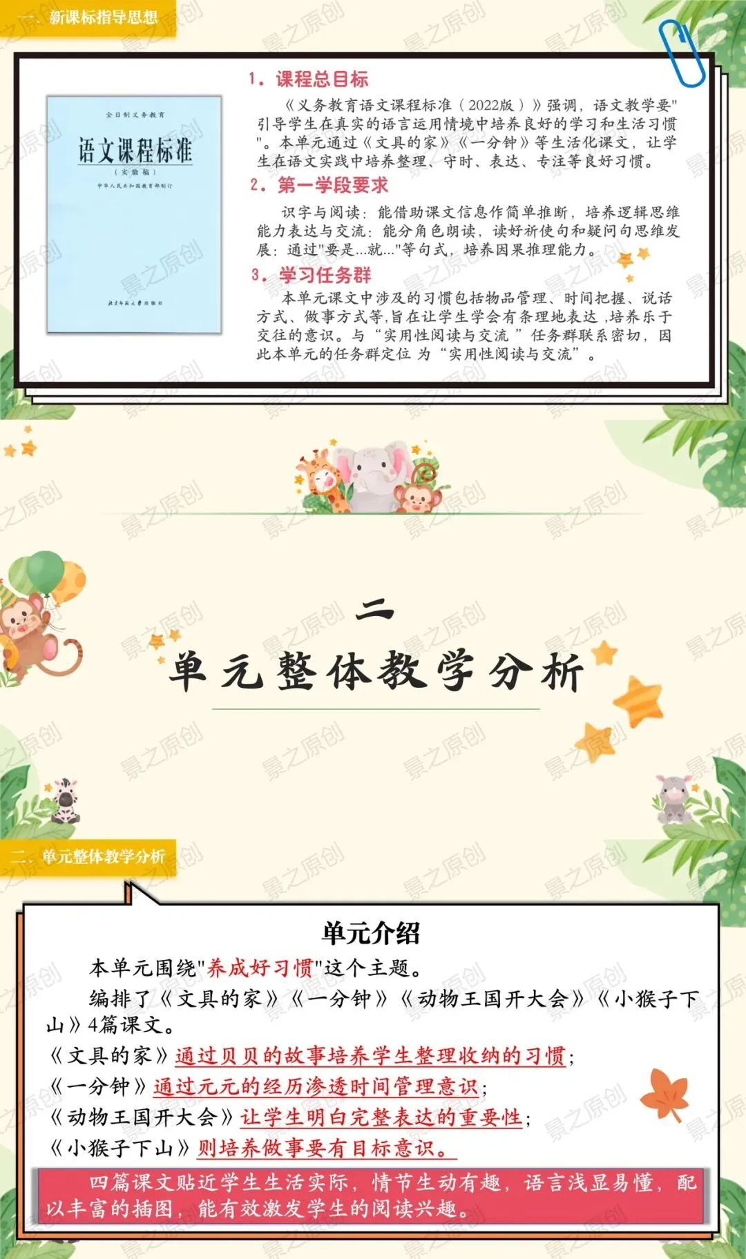 🧩我将从课标指导思想、单元整体教学分析、单元学情分析、单元学习目标、单元教学方法、单元教学建议等方面展开说明。本单元以"习惯养成"为主线,通过《文具的家》培养整理习惯,《一分钟》强化时间观念,《动物王国开大会》训练完整表达,《小猴子下山》培养目标意识,让学生在语文学习中收获成长的力量。