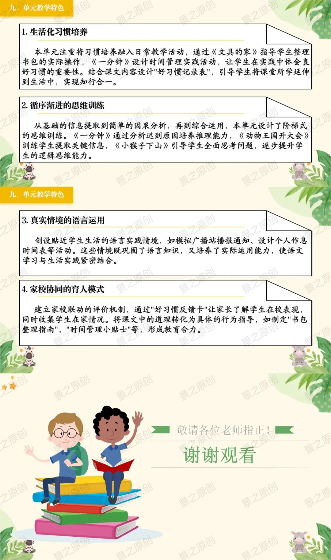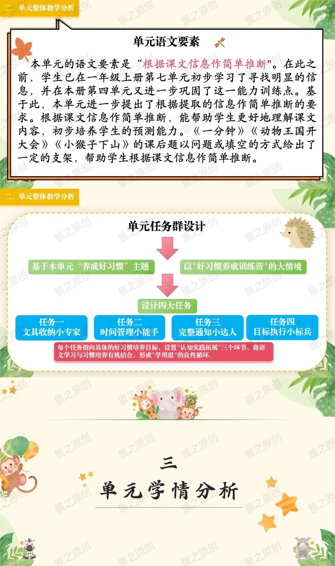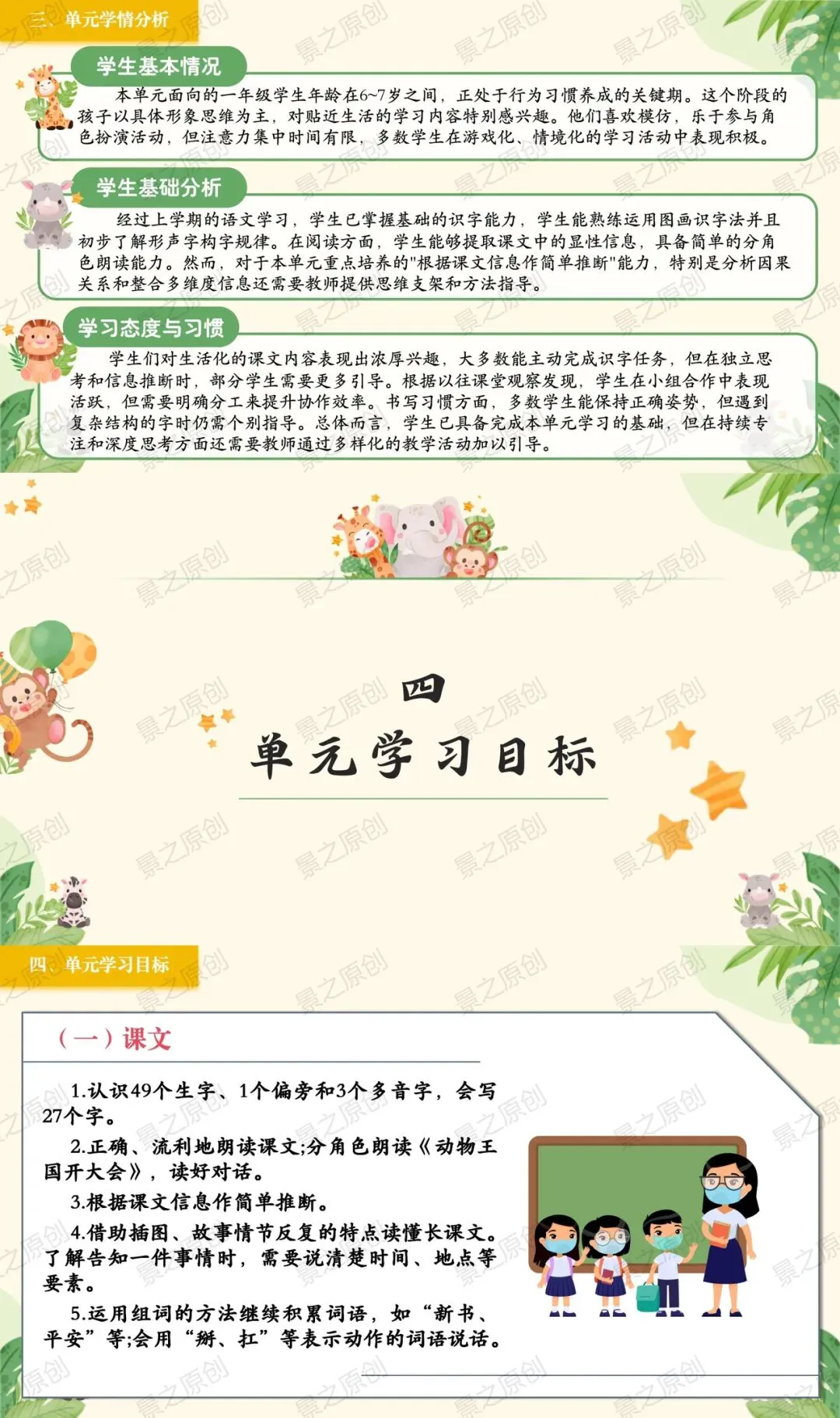 🧩我将从课标指导思想、单元整体教学分析、单元学情分析、单元学习目标、单元教学方法、单元教学建议等方面展开说明。本单元以"习惯养成"为主线,通过《文具的家》培养整理习惯,《一分钟》强化时间观念,《动物王国开大会》训练完整表达,《小猴子下山》培养目标意识,让学生在语文学习中收获成长的力量。