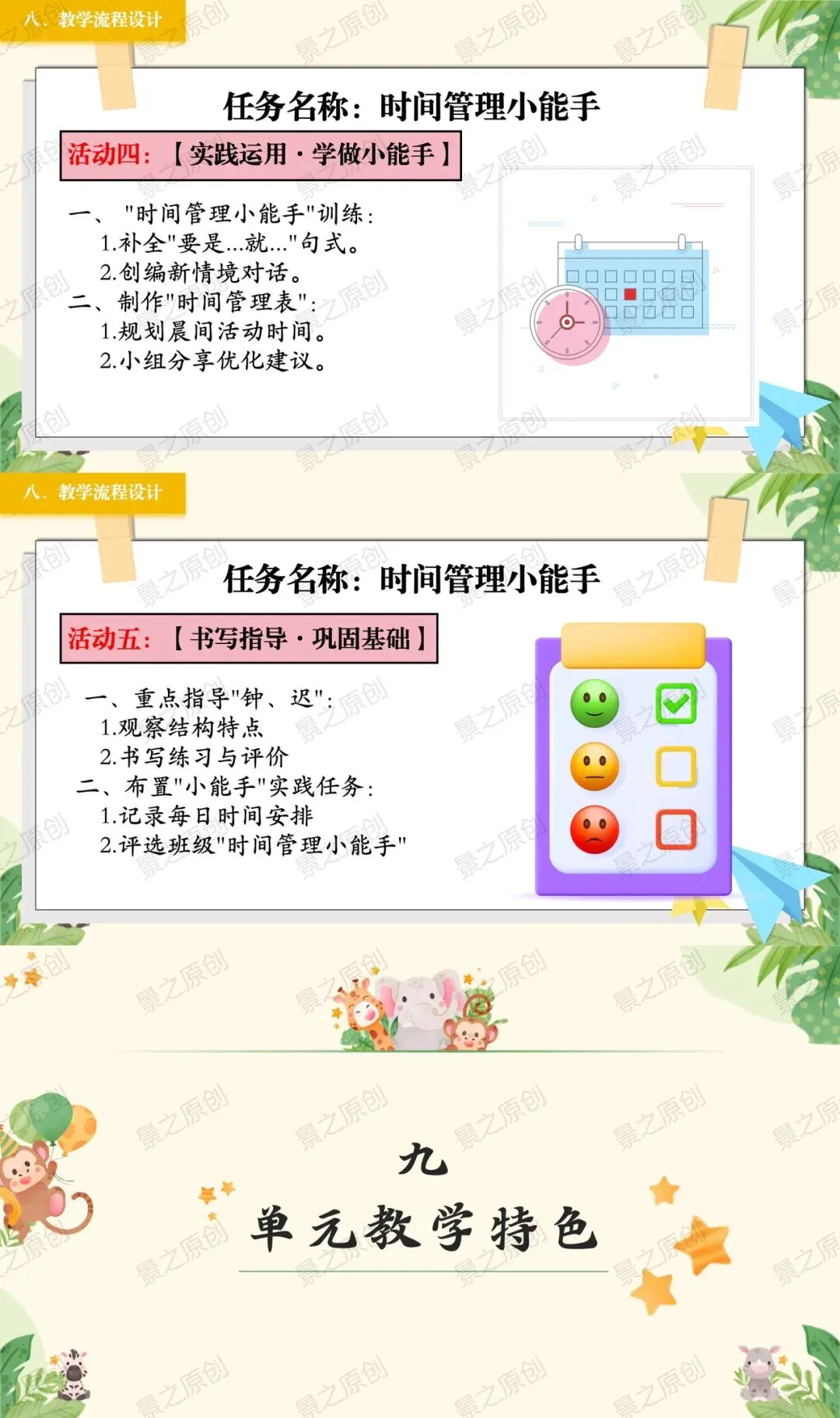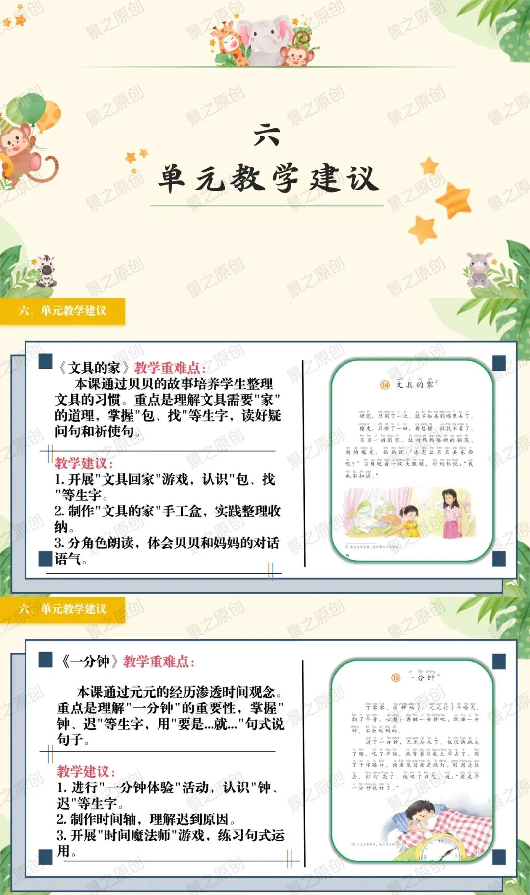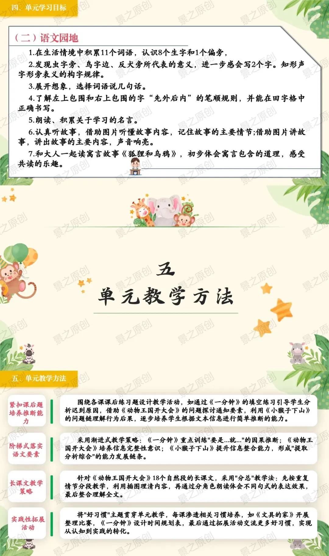 ✨本单元围绕"养成好习惯"这个主题编排了《文具的家》《一分钟》《动物王国开大会》《小猴子下山》4篇课文。《文具的家》通过贝贝的故事培养学生整理收纳的习惯;《一分钟》通过元元的经历渗透时间管理意识;《动物王国开大会》让学生明白完整表达的重要性;《小猴子下山》则培养做事要有目标意识。四篇课文贴近学生生活实际,情节生动有趣,语言浅显易懂,配以丰富的插图,能有效激发学生的阅读兴趣。