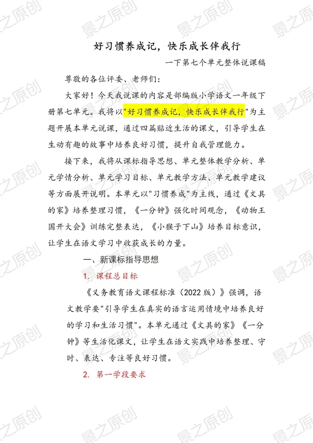 ✏️今天我说课的内容是部编版小学语文一年级下册第七单元。我将以"好习惯养成记,快乐成长伴我行"为主题开展本单元说课,通过四篇贴近生活的课文,引导学生在生动有趣的故事中培养良好习惯,提升自我管理能力。