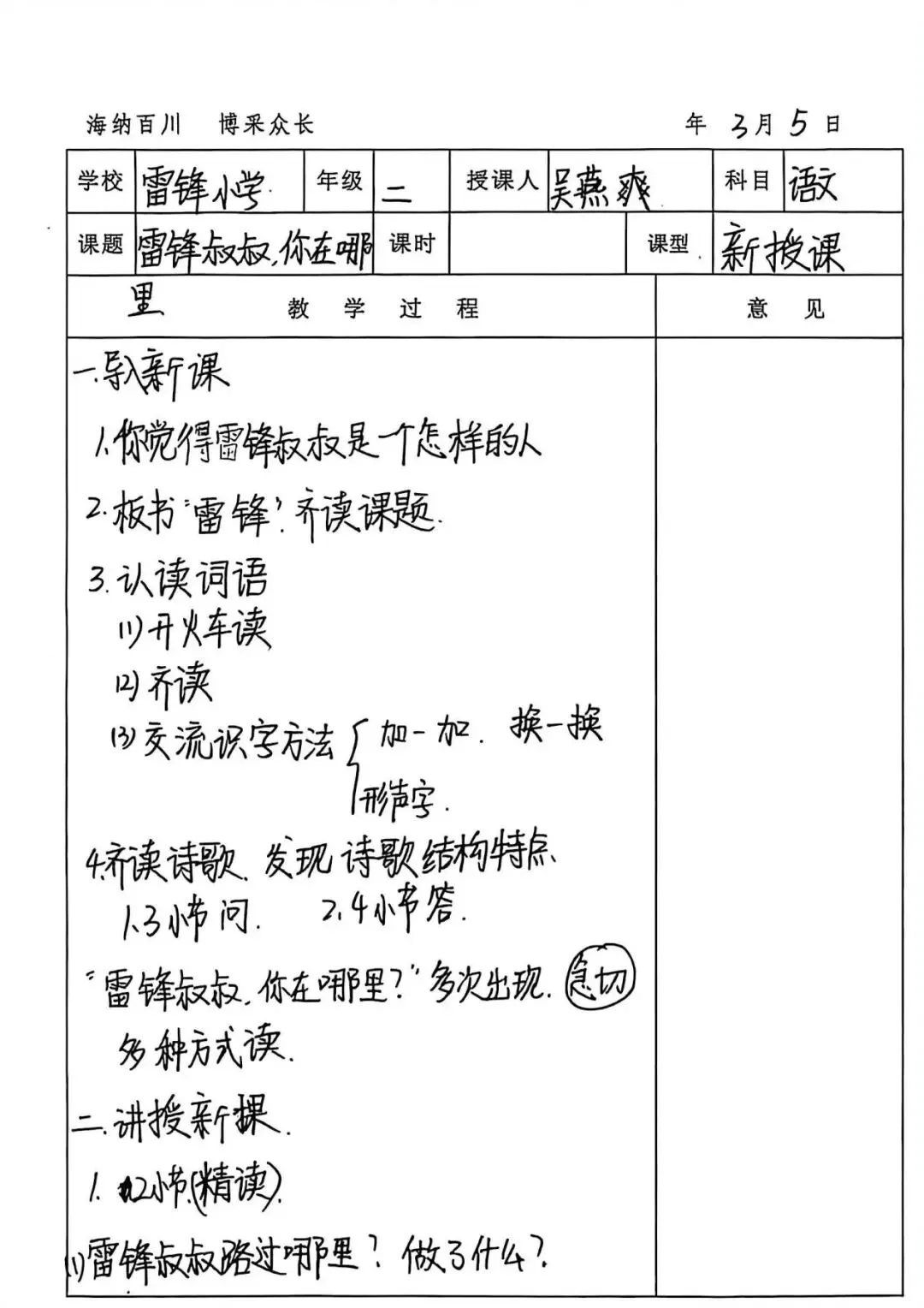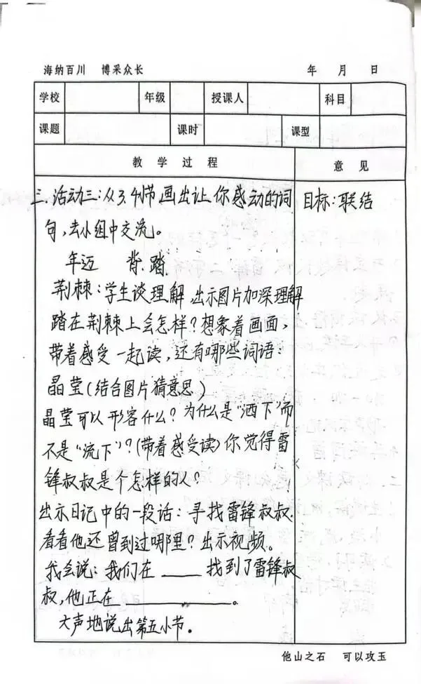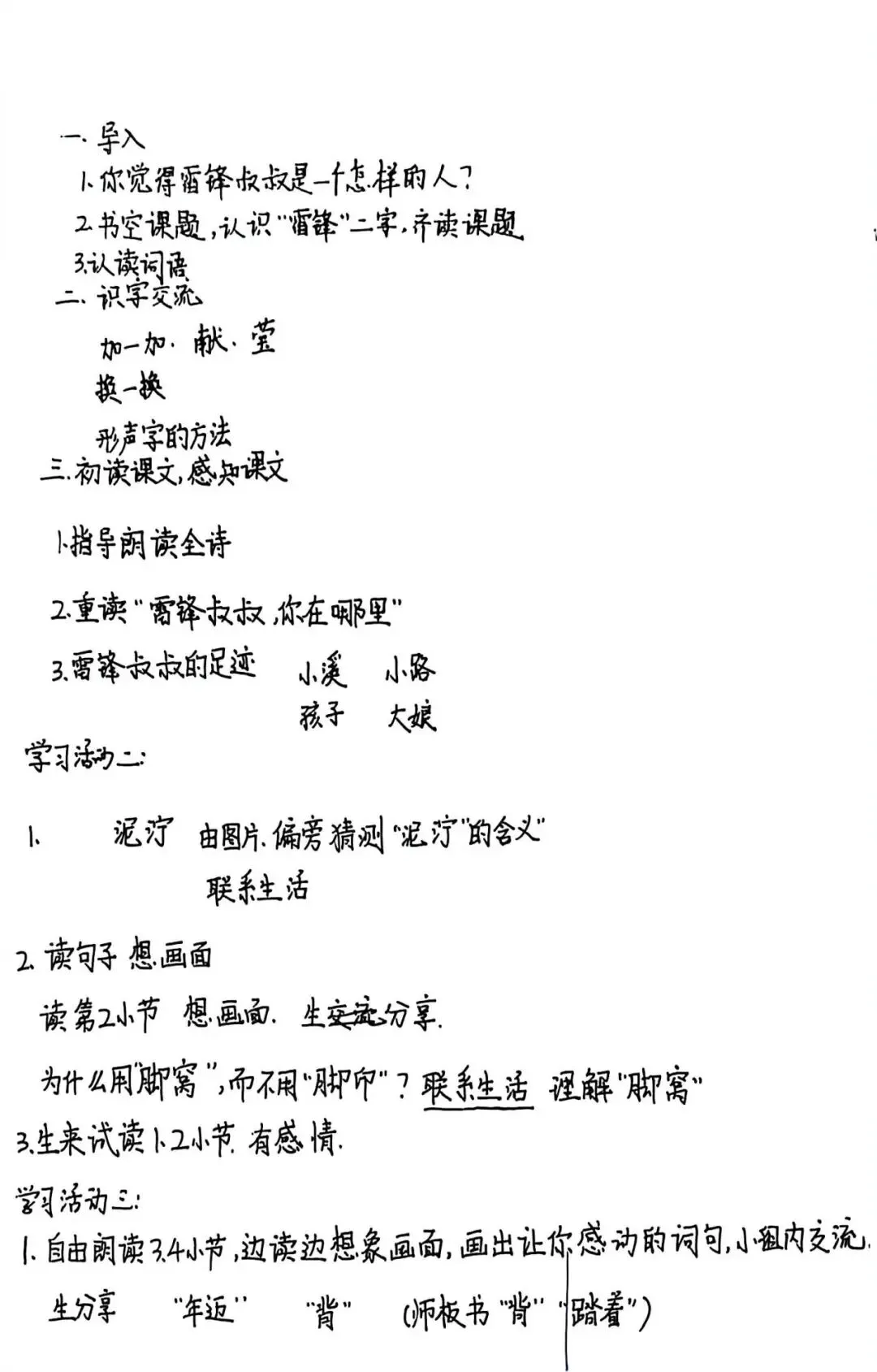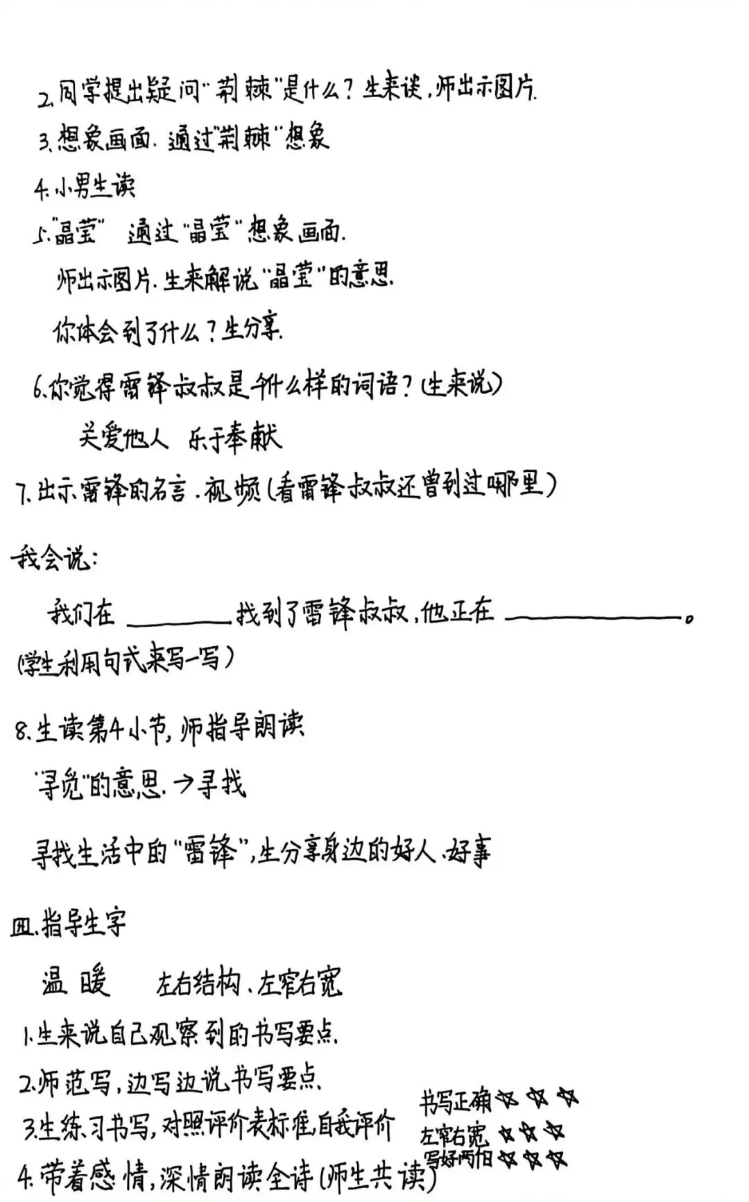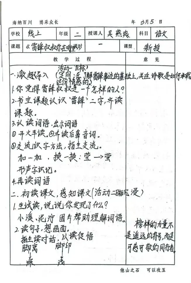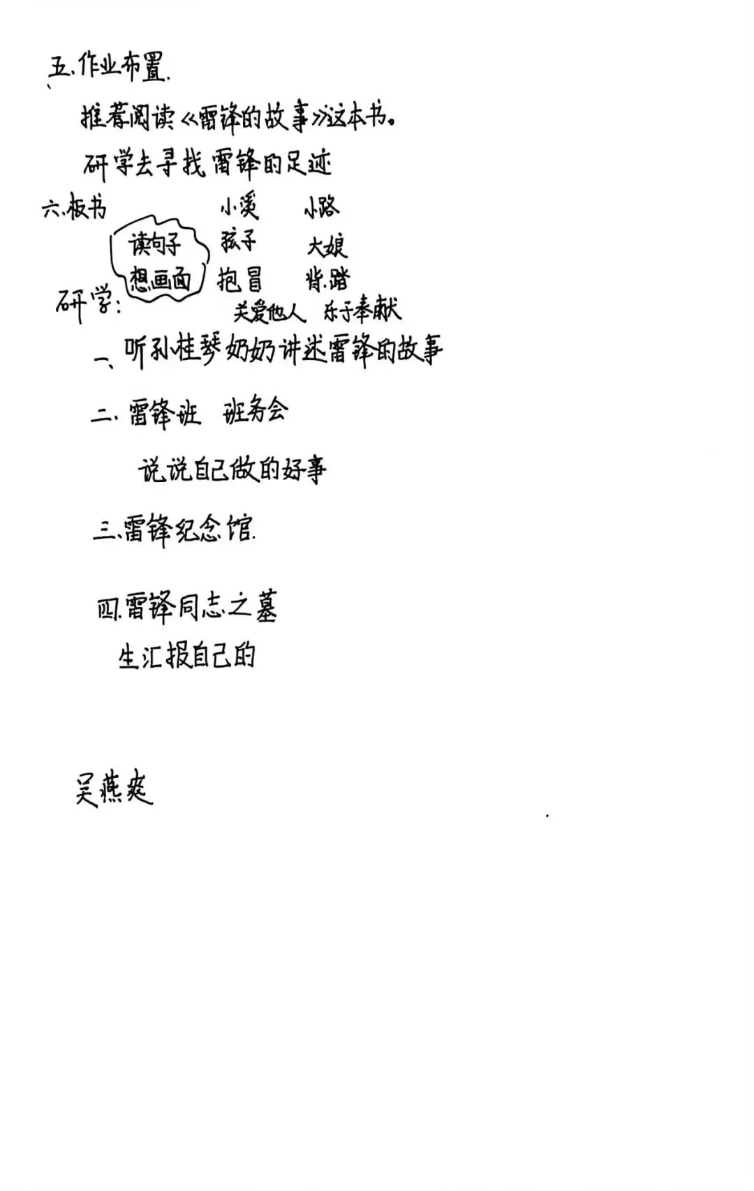 课堂是精神传承的主阵地,一堂好的语文课,从来都是“文”与“心”的同频共振。吴燕爽老师以“寻找雷锋叔叔”为核心线索,层层递进、环环相扣,将语文核心素养的落实与雷锋精神的传承完美融合,让课堂成为雷锋精神生根发芽的沃土。吴老师在课堂中用三个学习活动搭建了一座从情感共鸣到语言深耕再到行动认同的桥梁。投入了大量的时间引导学生沉入文本,去理解泥泞,感受脚窝,想象荆棘。通过语言的激励来触摸精神的力量,努力让课堂成为连接历史与当下、文本与生活、学习与成长的核心枢纽。
