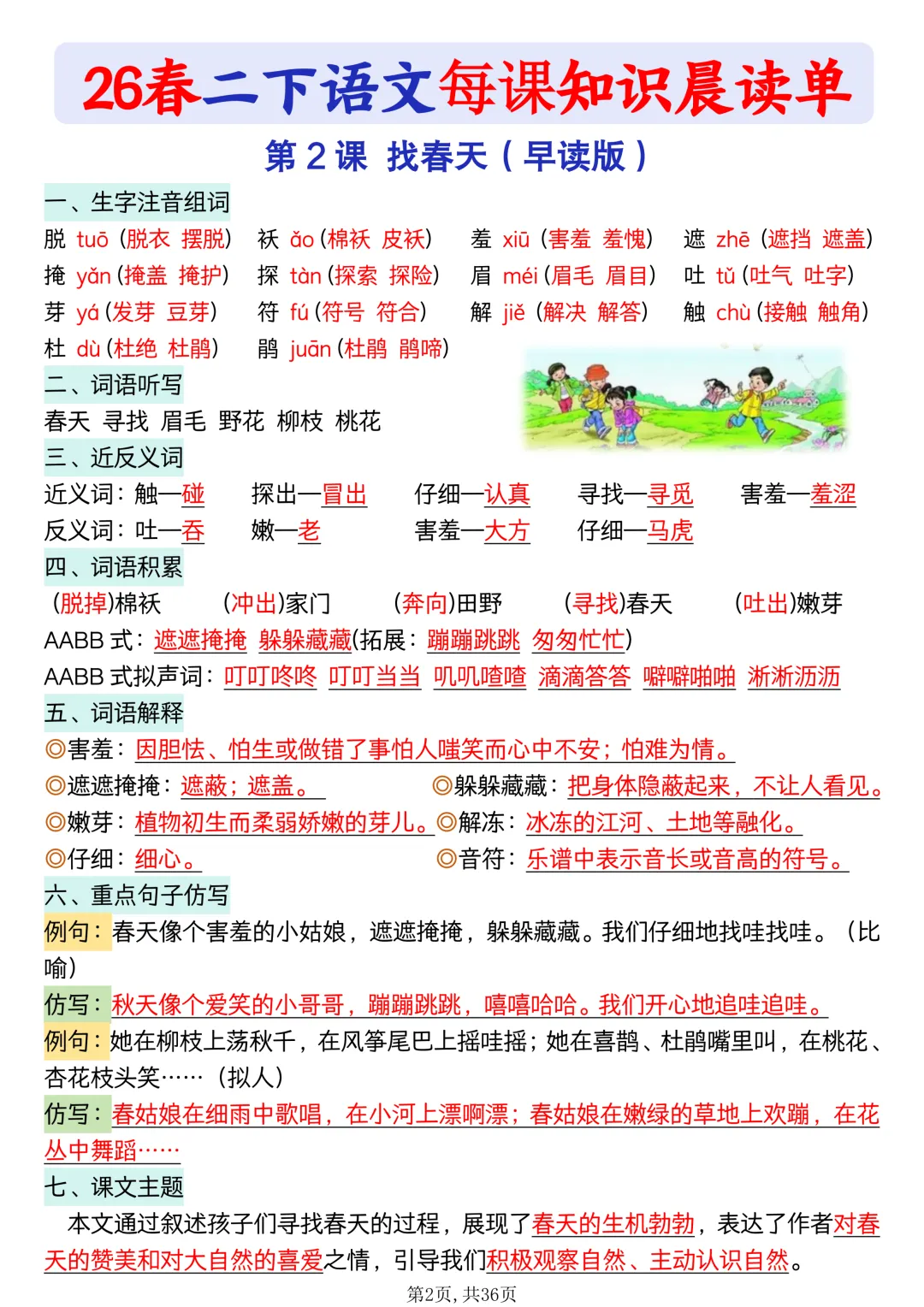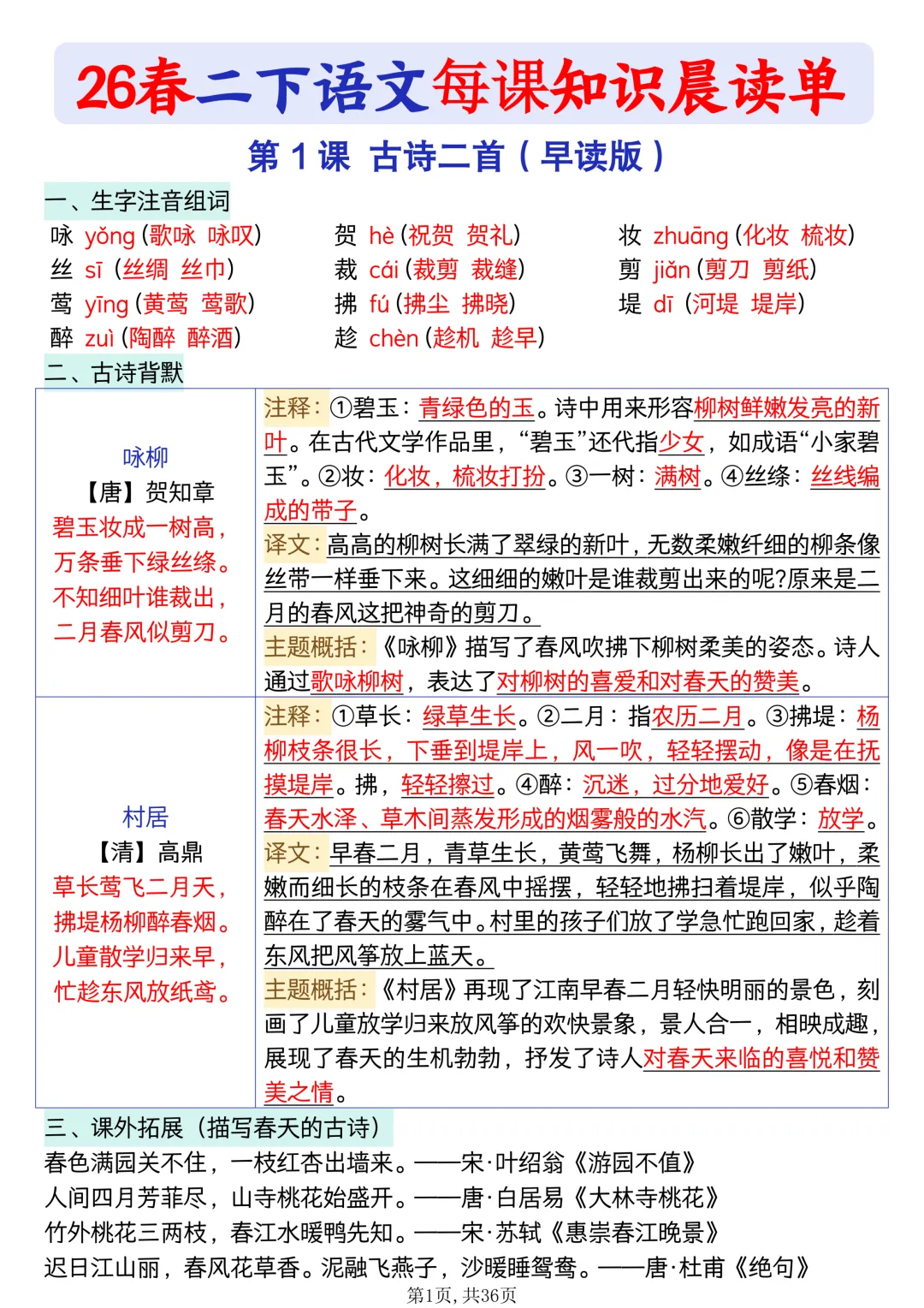 #二年级语文#26 春资料 #晨读单#每课知识点#同步教材#小学语文#可打印资料#晨读背诵#基础巩固