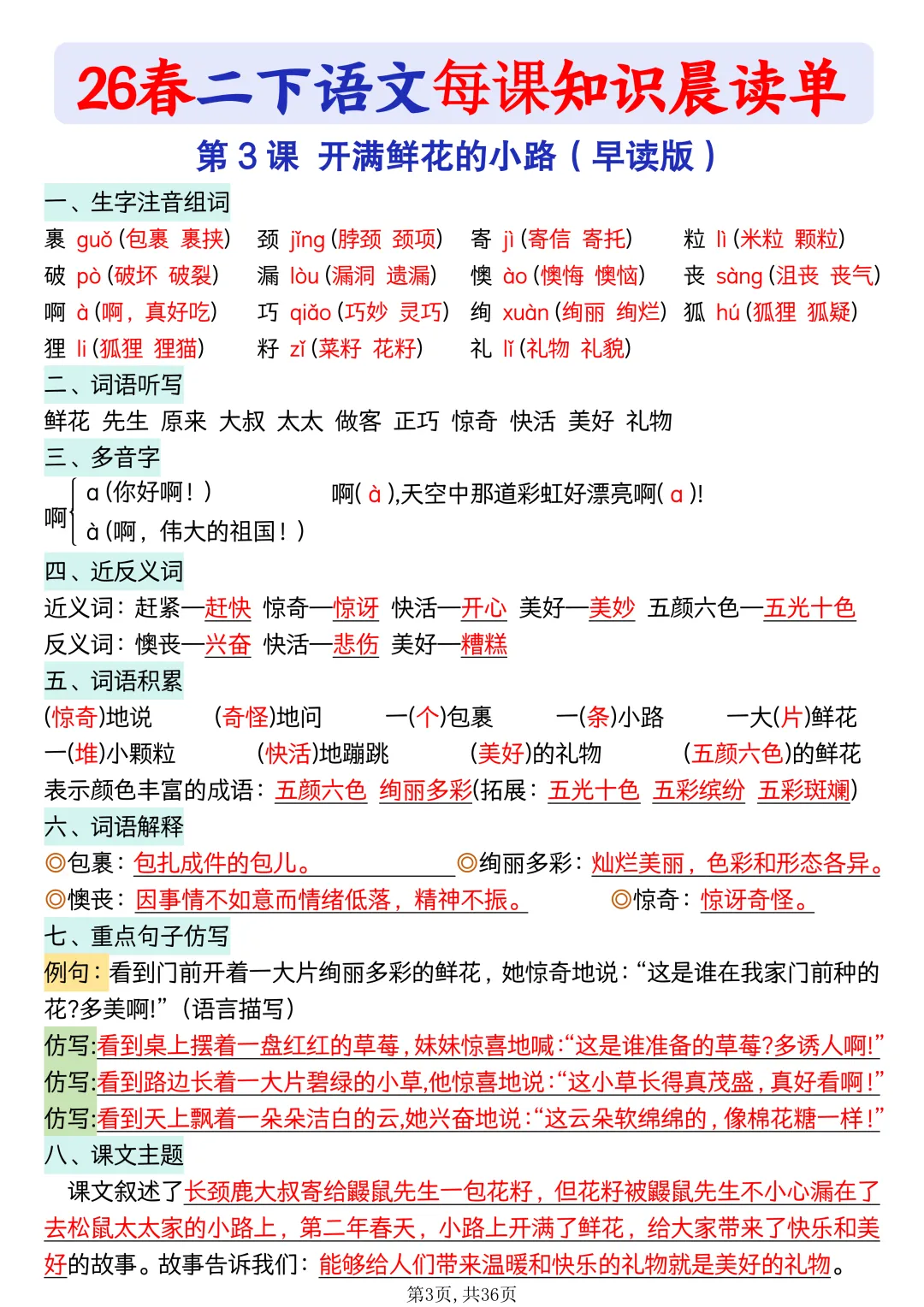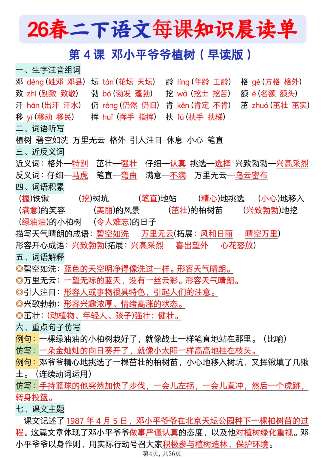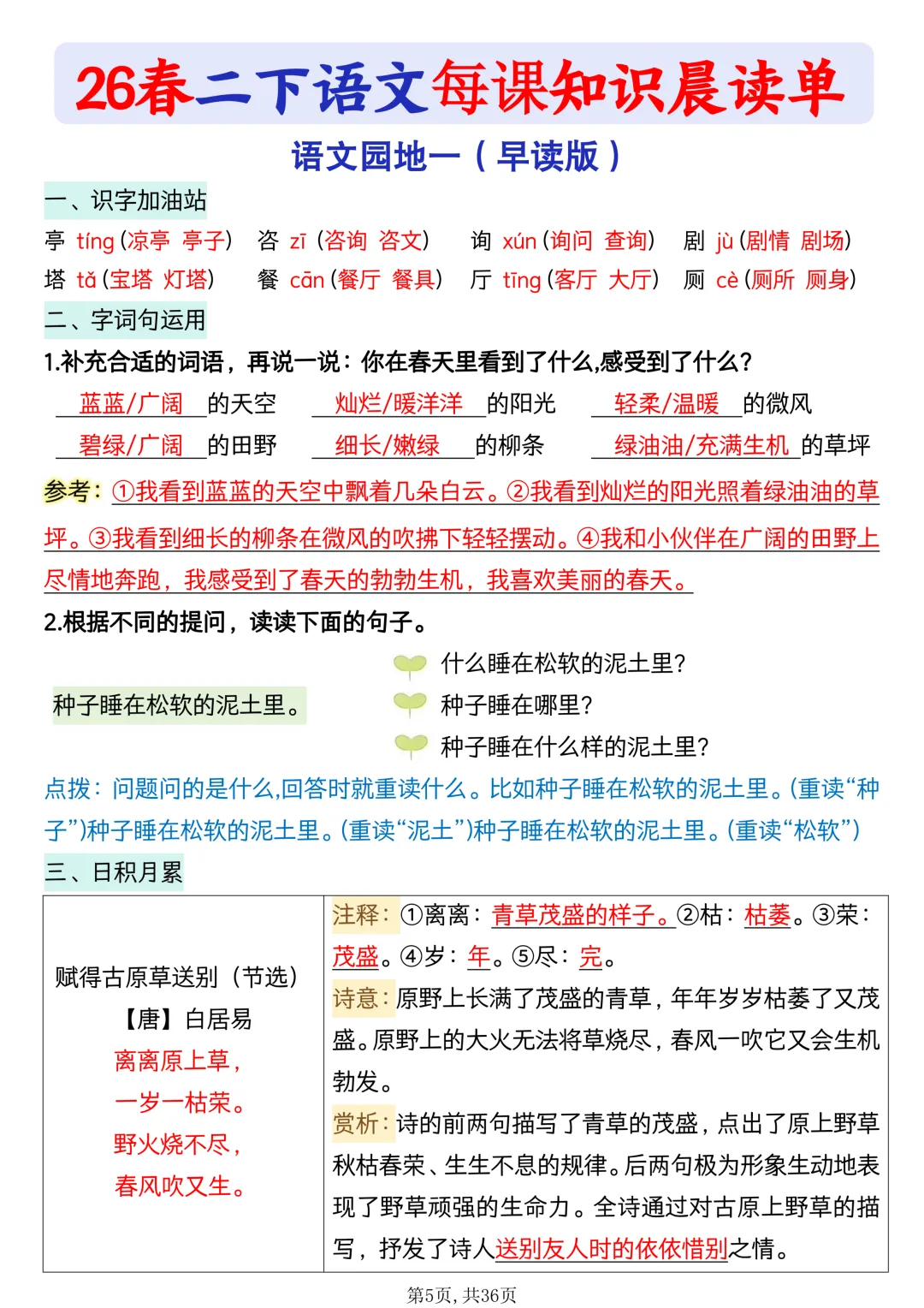 同步课本一课一张,生字、词语、句子、课文重点全整理晨读专用,每天 5 分钟,大声朗读、边读边记,基础超扎实重点清晰、排版清爽,孩子不用翻书,直接背、记得牢课前预习、课后巩固、单元复习都能用电子版可下载打印,天天晨读,语文稳稳提分💯