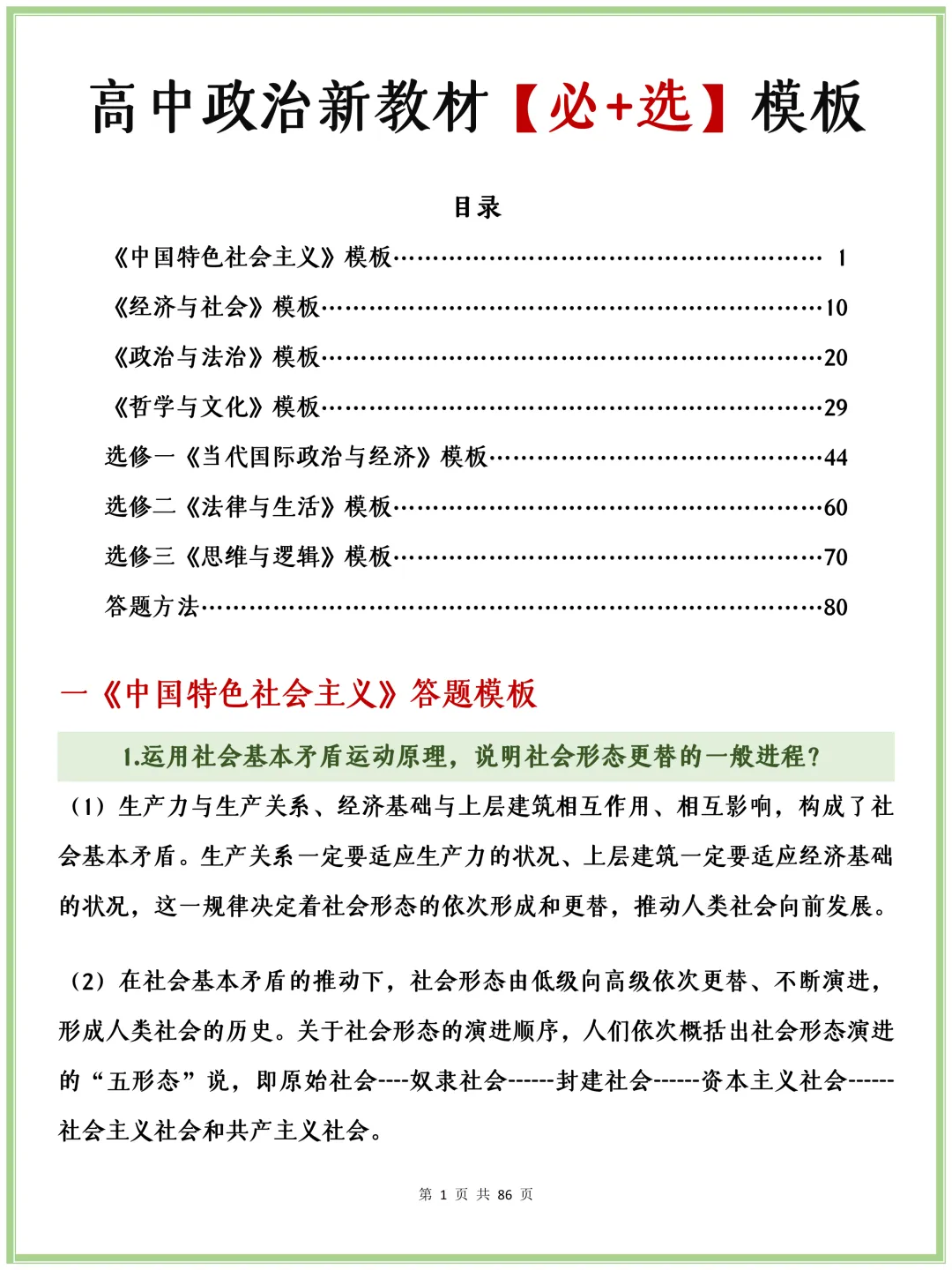 很多同学背了知识点,却不会组织答案,这份《高中政治新教材【必+选】模板》紧扣新教材考纲,覆盖所有必修+选修模块核心设问。直接套用框架,结合材料填充,就能快速踩中所有得分点。