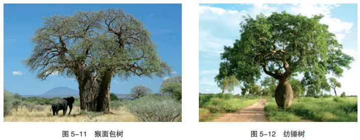 (2)猴面包树、纺锤树生长地区有明显的干季和湿季。粗大的树干和疏松的木质部,有利于雨季时贮存大量水分。