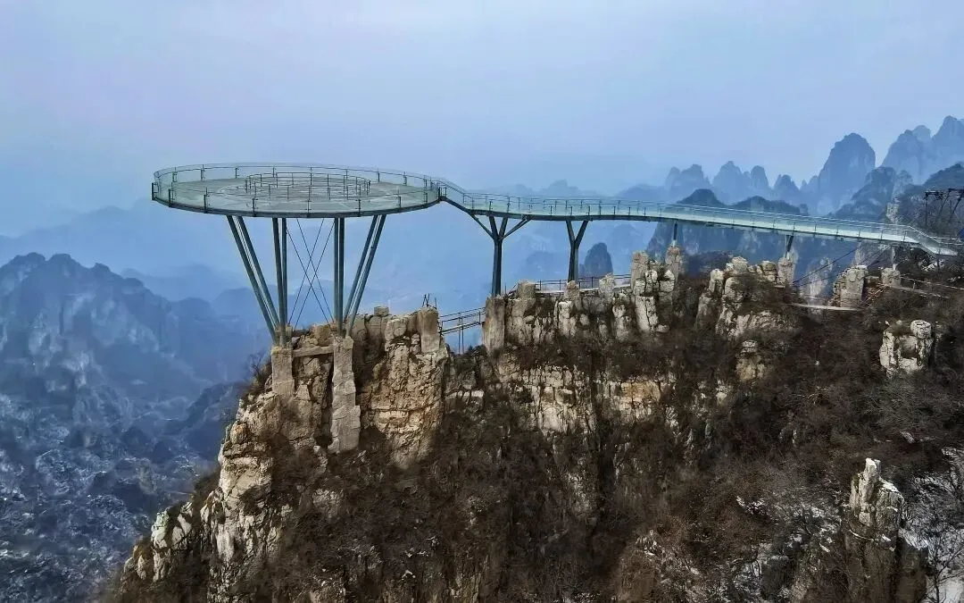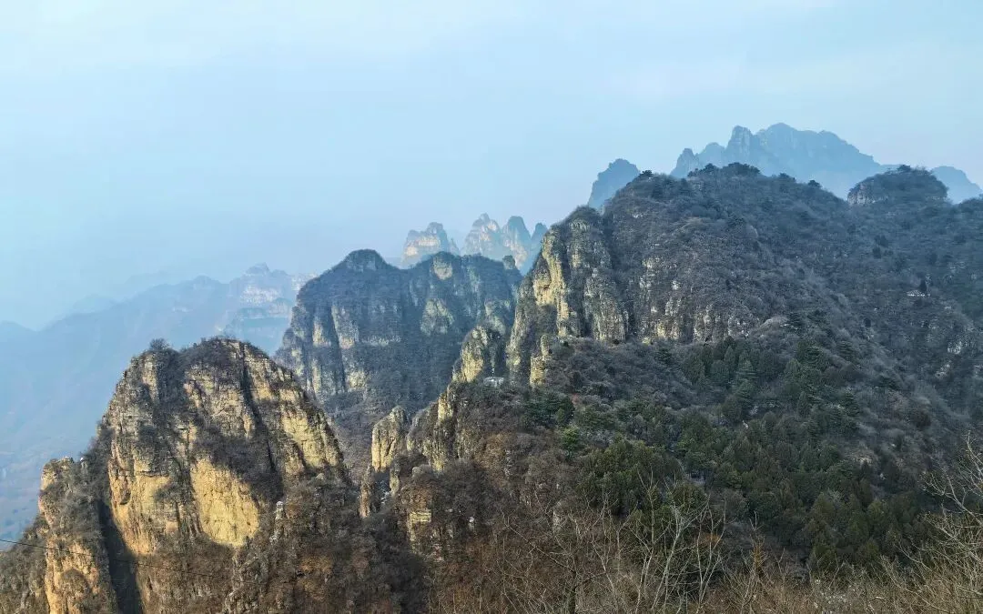 登山的道路非常友好,登山步道很宽阔。初段是茂密的松柏林,山体岩石如刀削剑劈一般陡立两侧,怪石嶙峋层出不穷。继续向上,还有红玛瑙溶洞,洞内很陡峭,很多地方仅可容一人通过,梯子形如直立,洞内钟乳石形态各异,配以灯光看上去很漂亮。值得一提的是,景区人文色彩非常浓厚,尤其从棋盘陀到五勇士纪念塔的这一段路,两侧扶手栏杆上安装了很多标语,词句间不乏豪迈、尽显气魄,读来朗朗上口,很是鼓舞人心。最美的风景要数登临纪念塔后,北侧山峦绵延无尽,山间上有冬雪未尽,更增群山险峻。玻璃栈道未开放,听售票员称自2019年后关闭未开放,今日一观,偌大的玻璃观景平台,仅通过4根铁柱与下面陡峭的峰顶石块相连,称赞工程建造之惊奇同时,不免越发越觉得危险。