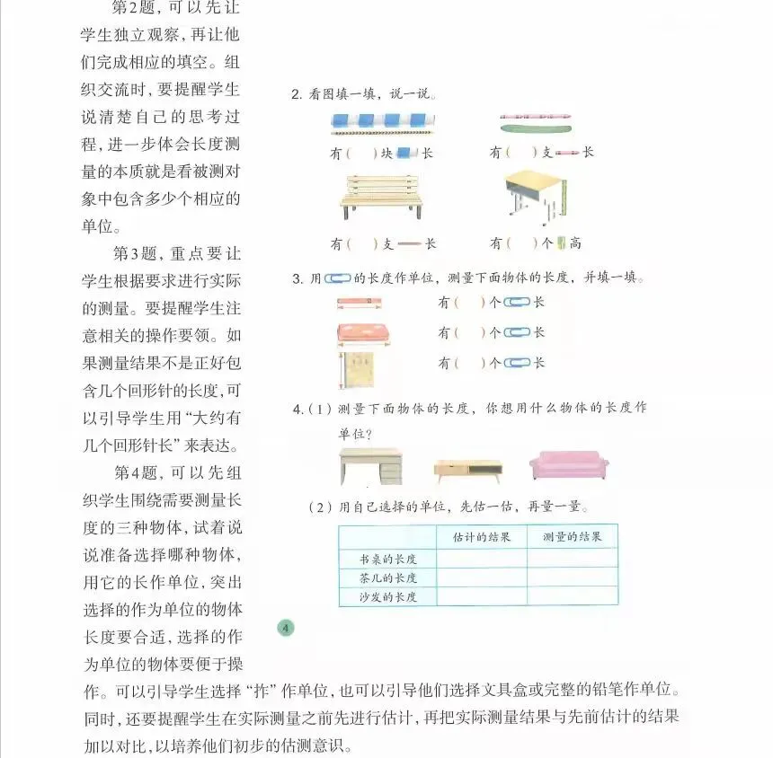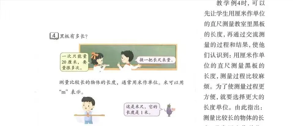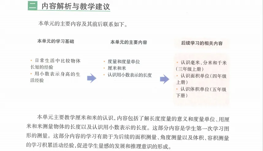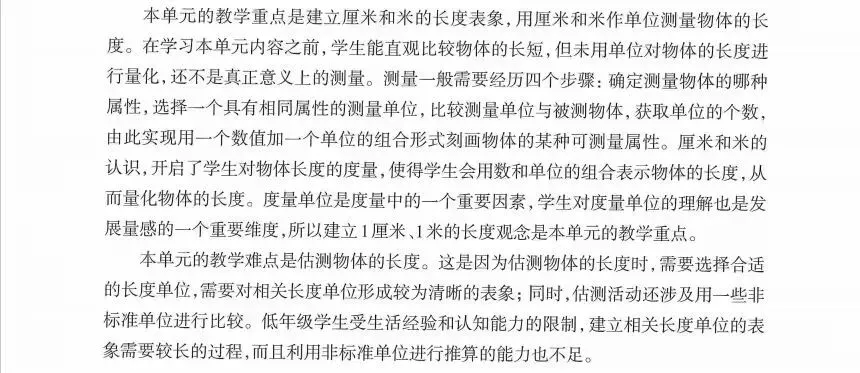 3.使学生能恰当地选择长度单位厘米、米描述生活中常见物体的长度,选择合适的参照物作为标准,合理估测一些身边常见物体的长度,培养初步的估测能力,形成初步的量感,发展推理意识。