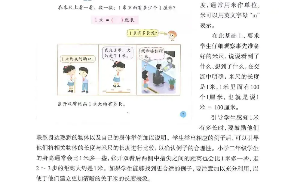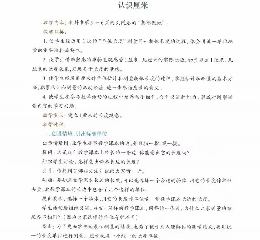2.使学生在具体的实践活动中认识长度单位厘米和米,初步建立1厘米和1米的长度观念,知道1米=100厘米,能进行单位之间的简单换算。