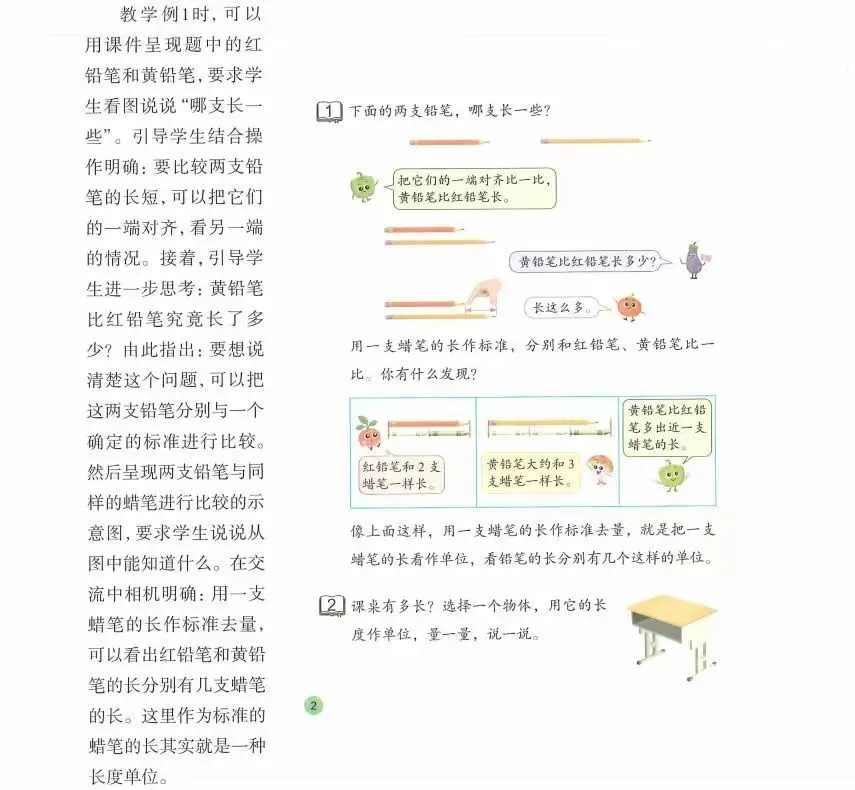 教学例2时,可以先提出问题:怎样才能清楚地说明我们的课桌有多长?由此引导学生选择一个合适的物体,用它的长作单位与课桌的长边进行比较。要启发学生从自己的身边或自己的身体上寻找作为“单位长度”的物体,让他们初步感受长度单位产生的源头。