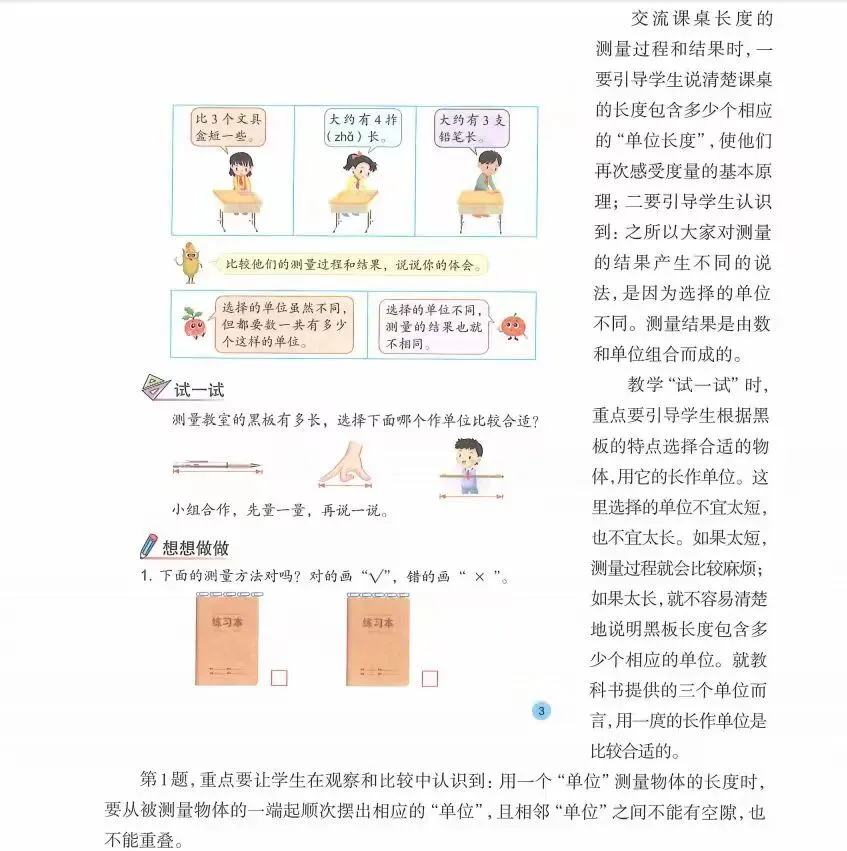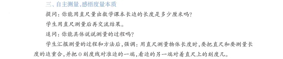 本环节需要让学生明确用直尺测量物体长度的一般方法,教学中注意了三个方面。一是把直尺和要测量长度的边重合,二是把0刻度线对准边的一端,三是看边的另一端对着直尺上的刻度几。这样,学生不仅能够初步掌握长度测量的基本方法,而且还能再次感受度量的本质,也就是看被测对象中包含几个相应的单位。