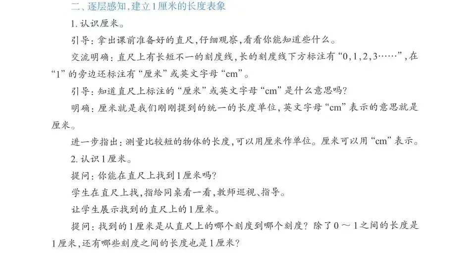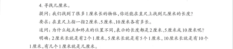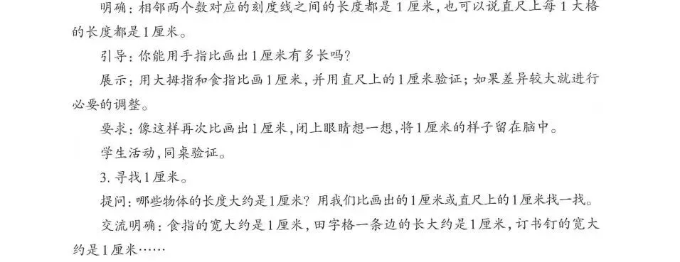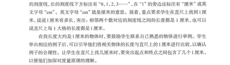 本环节引导学生充分经历认识厘米、认识1厘米、寻找1厘米、寻找几厘米的过程。首先,提供标准模型帮助学生建立1厘米的准确表象。如组织学生观察直尺上的1厘米,让学生用大拇指和食指比画1厘米,并用直尺上的1厘米进行验证,调整后让学生闭上眼睛想一想,重复多次,帮助学生建立1厘米的表象。在直尺上找1厘米和几厘米的活动,强调“相邻两个数对应的刻度线之间的长度都是1厘米”“有几个1厘米就是几厘米”,有助于学生把握“厘米”这个长度单位的本质,感悟单位的可加性。