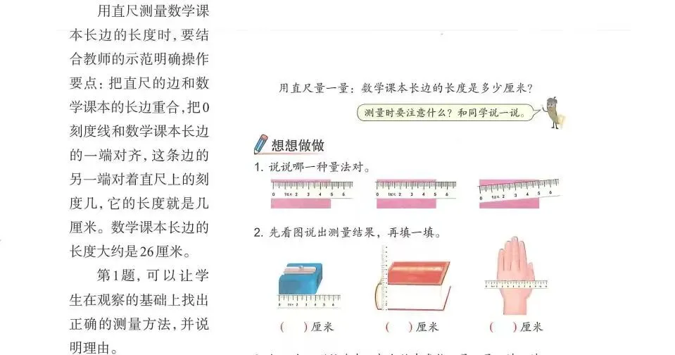 通过测量数学课本长边的长度这个任务,一方面,唤醒学生测量物体长度的已有经验,突出长度度量的基本原理以及“单位长度”在长度度量中的重要作用;另一方面,通过测量结果的交流,引导学生真切体会到统一度量单位的必要性,进而自然引出本节课所要认识的长度单位“厘米”,为接下来的活动奠定基础。
